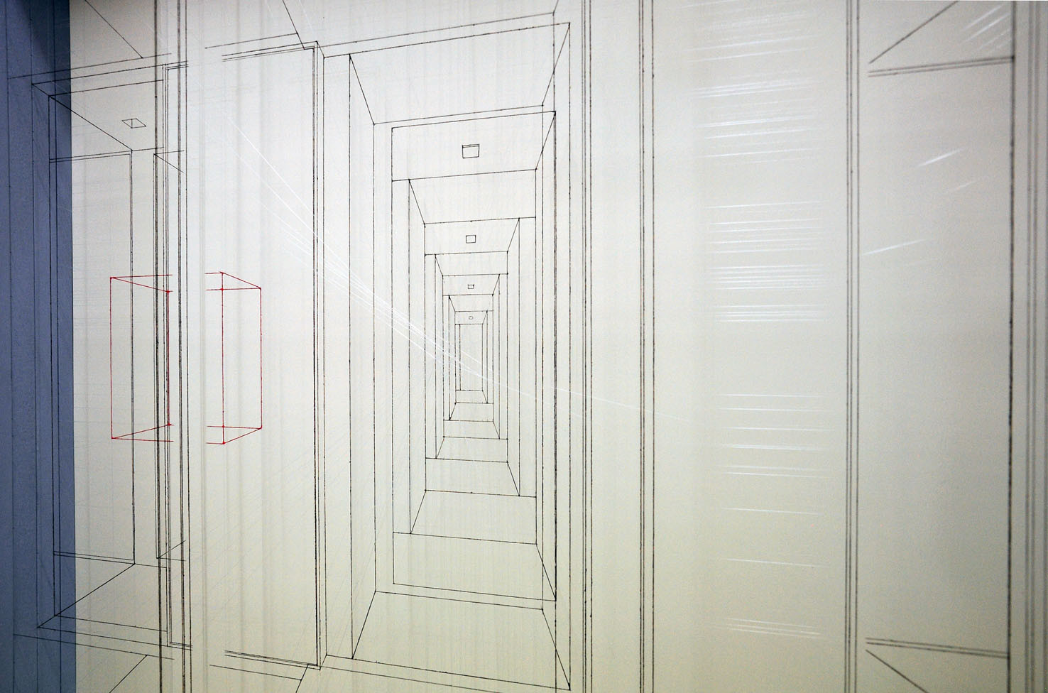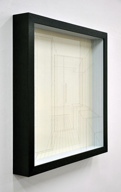 acrylic on fluorocarbon line, wood frame, metal background, plexiglas