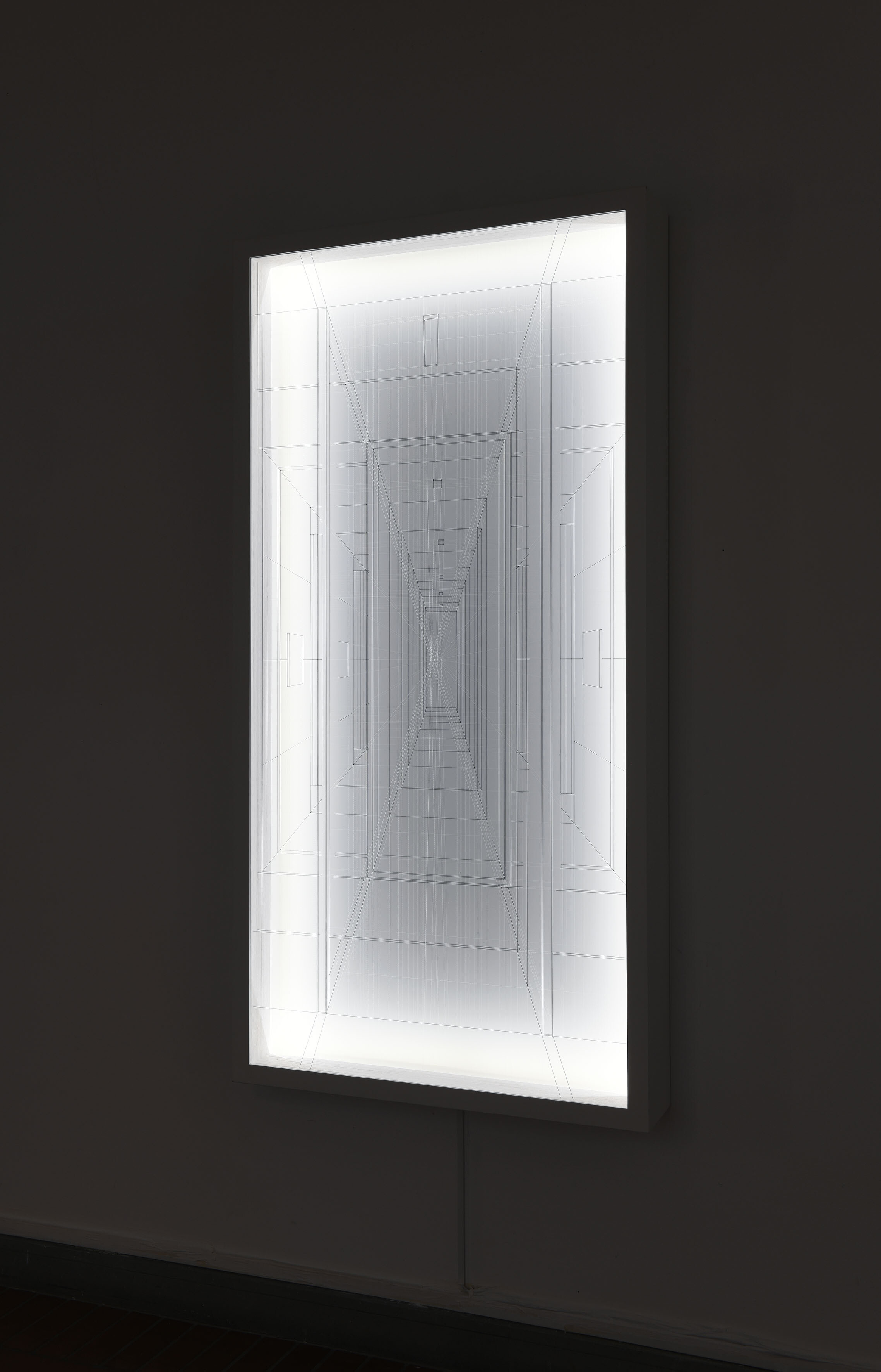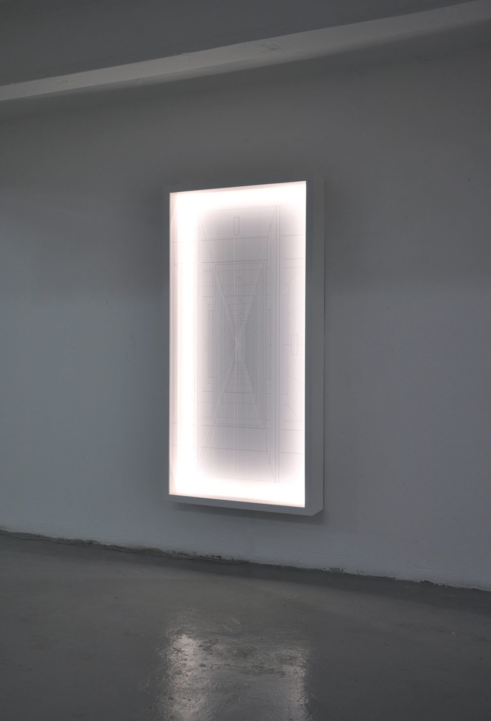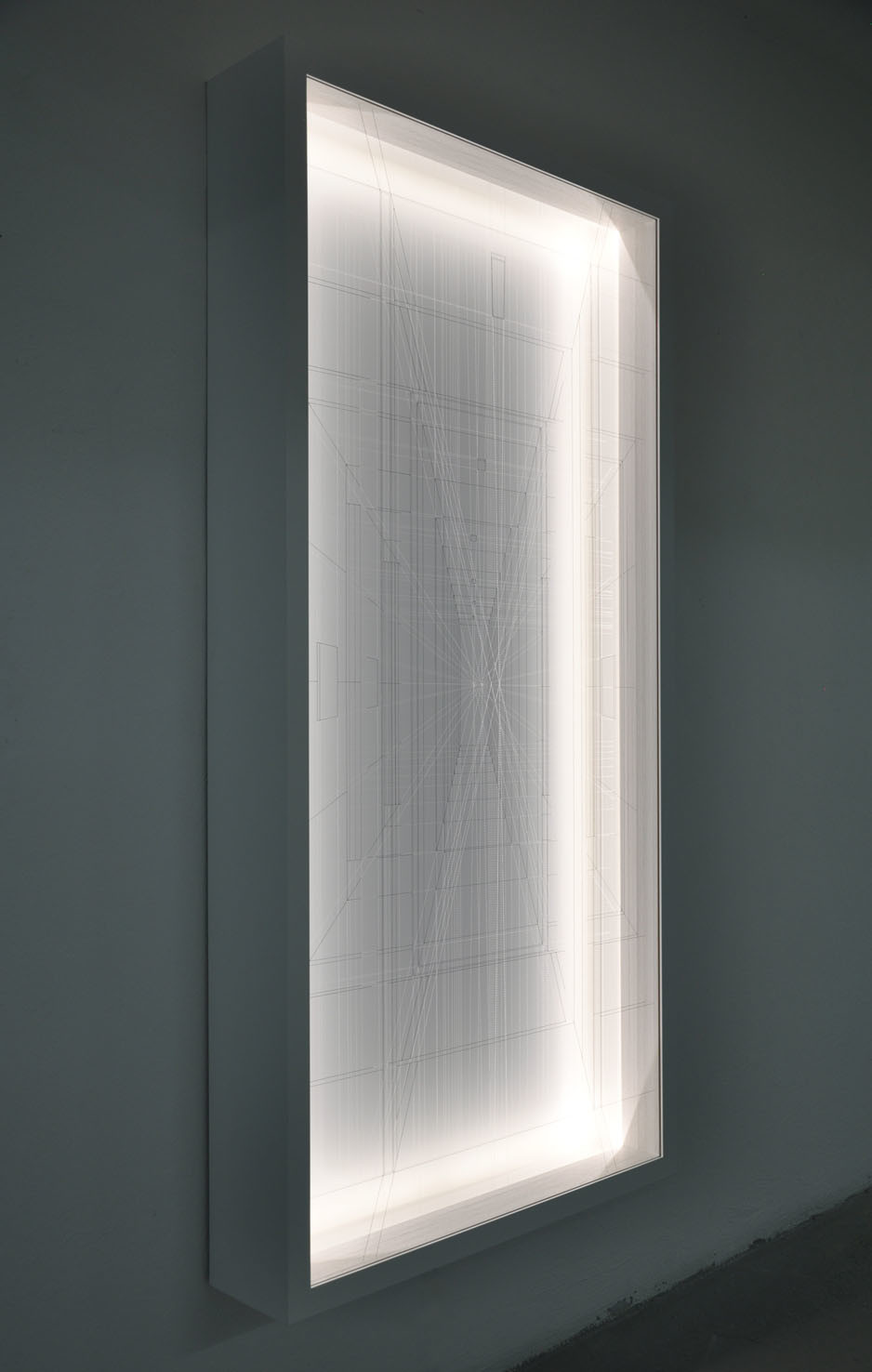 Enamel on fluorocarbon line, wooden box, LED light system, plexiglas