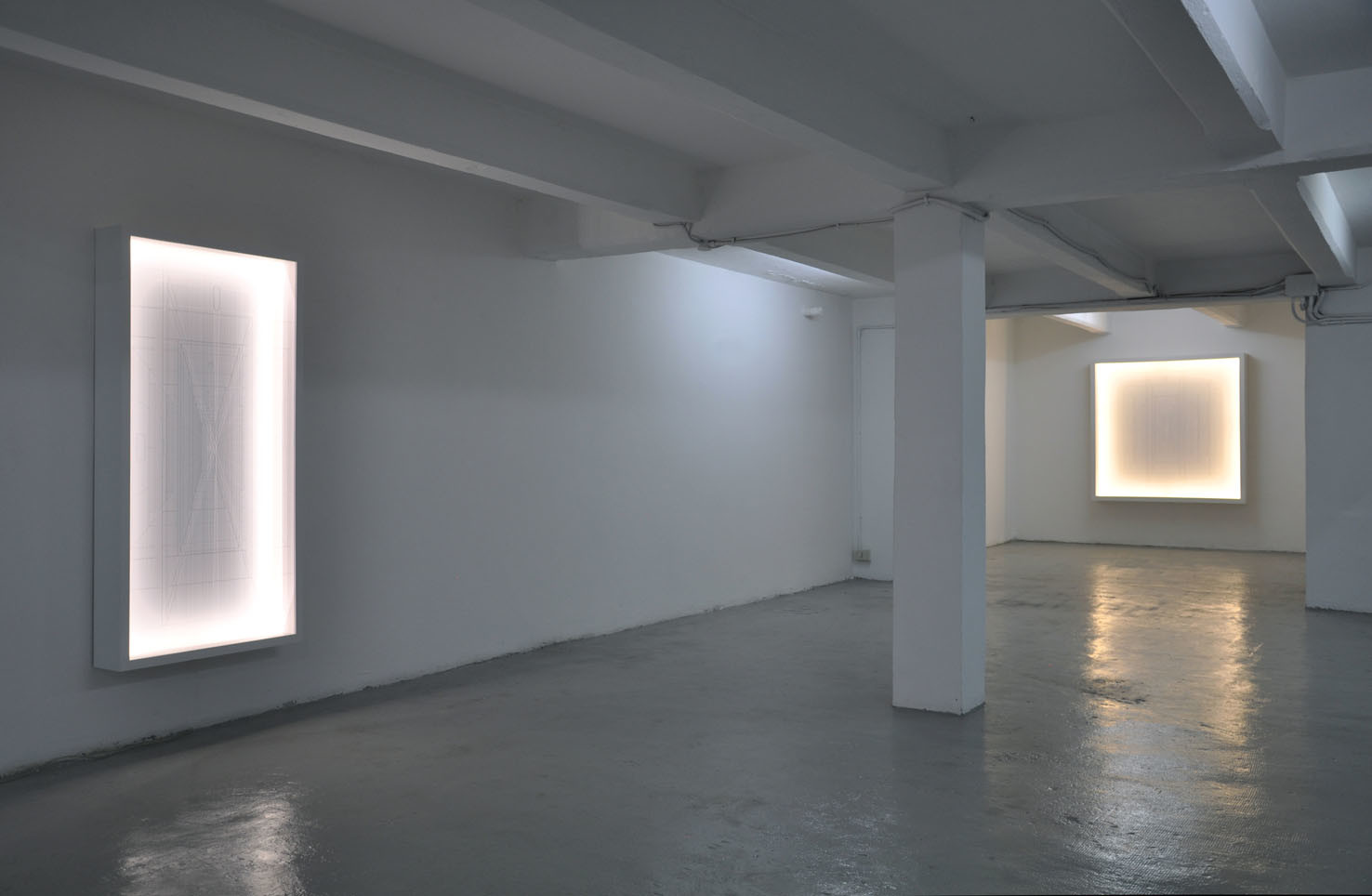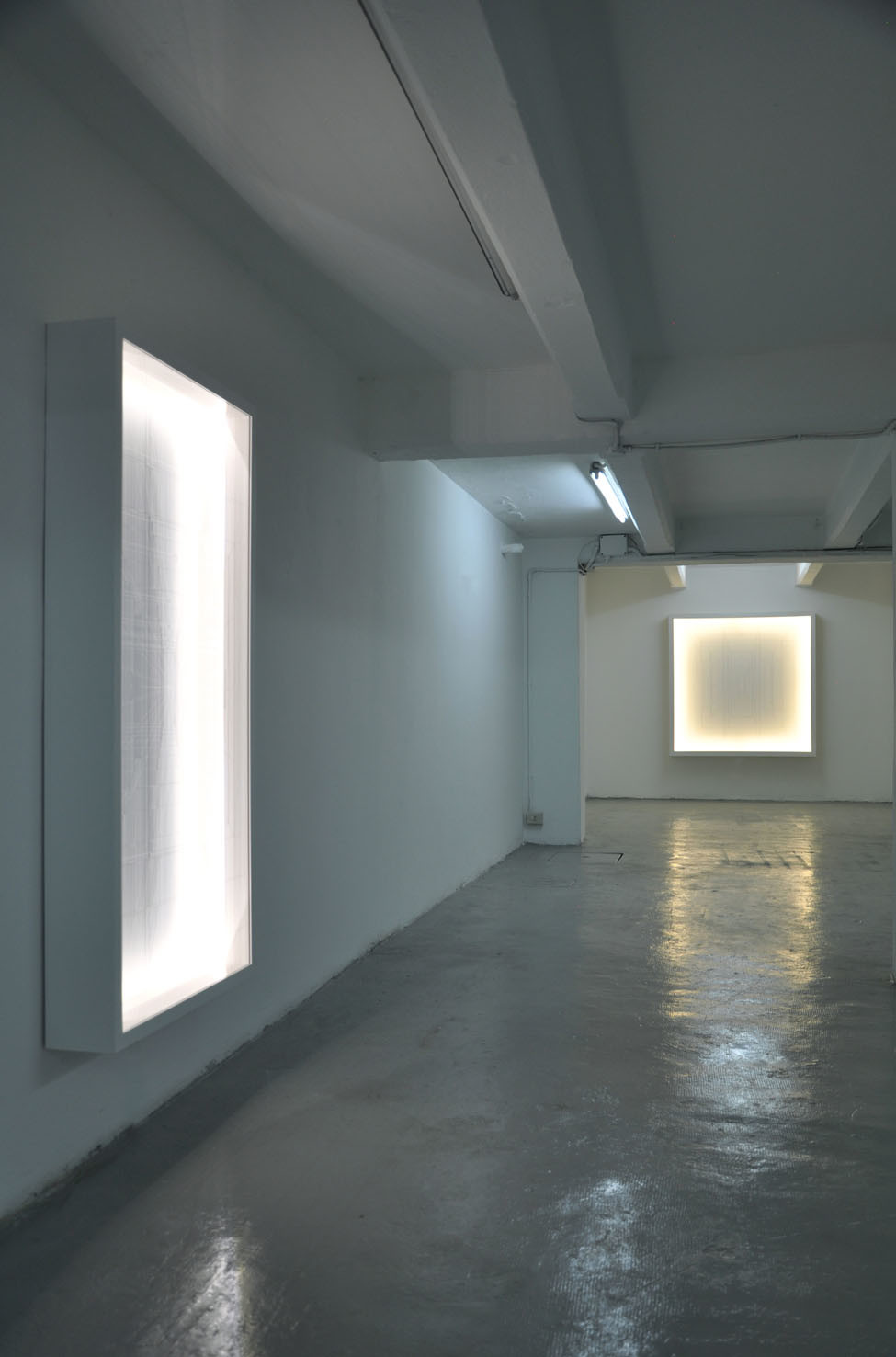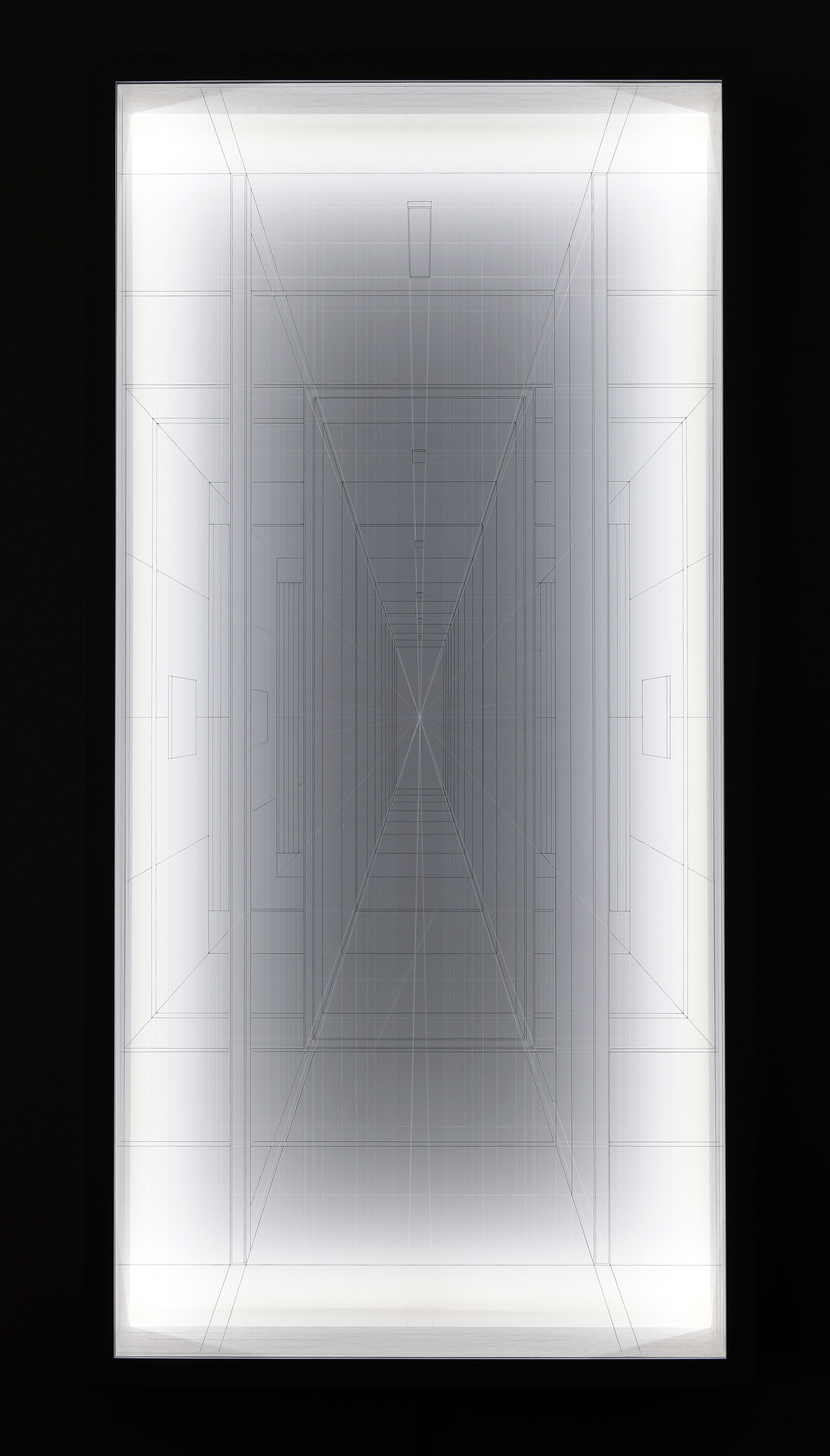 Enamel on fluorocarbon line, wooden box, LED light system, plexiglas