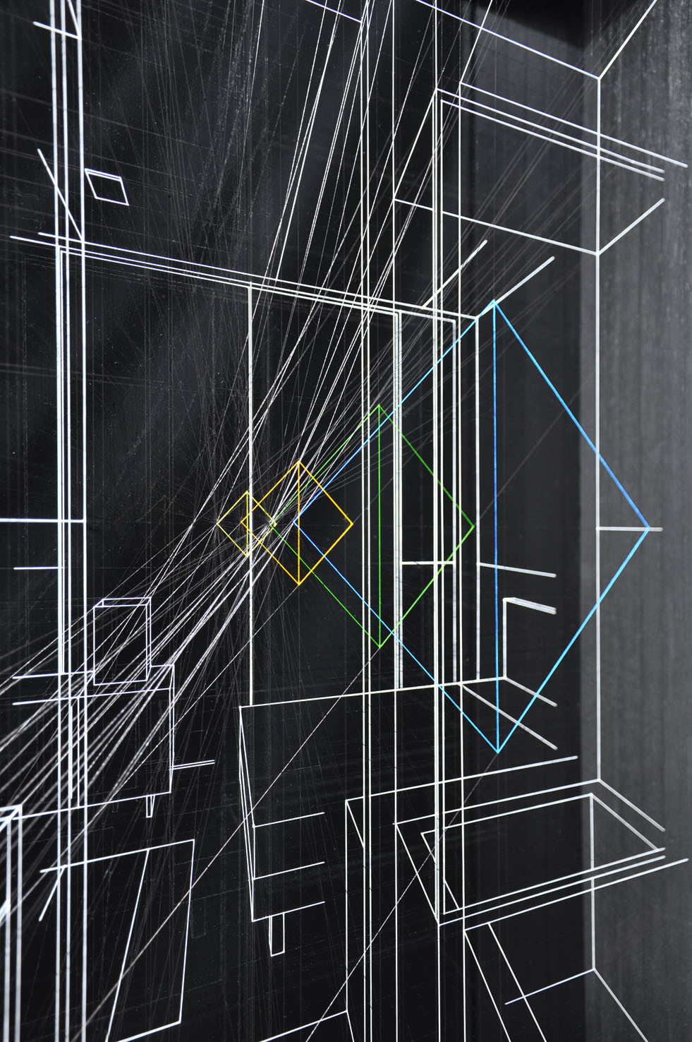 The art-work is a three-dimensional white perspective drawing on a black background and represents a domestic interior, where some geometric elements refer to an abstract and metaphysical dimension.