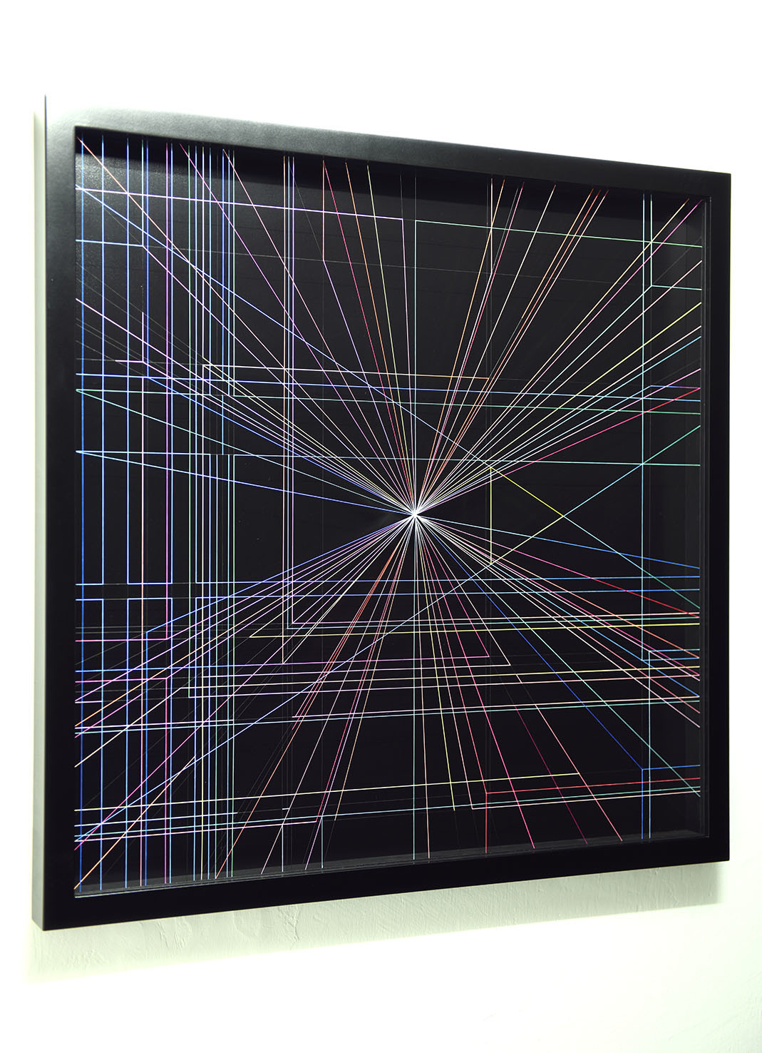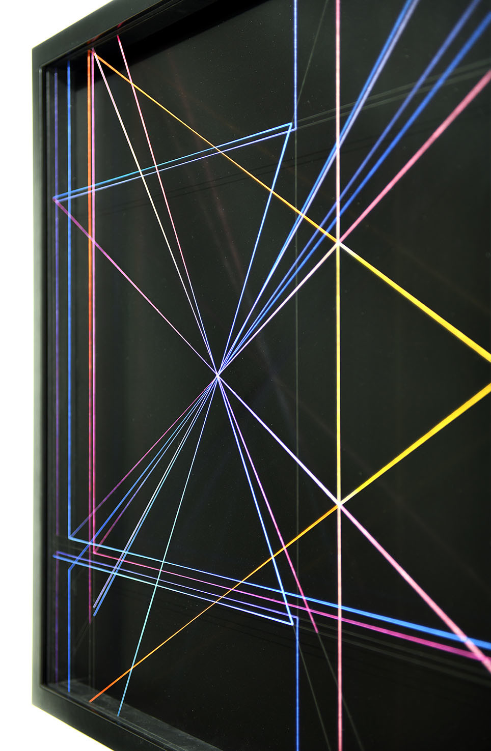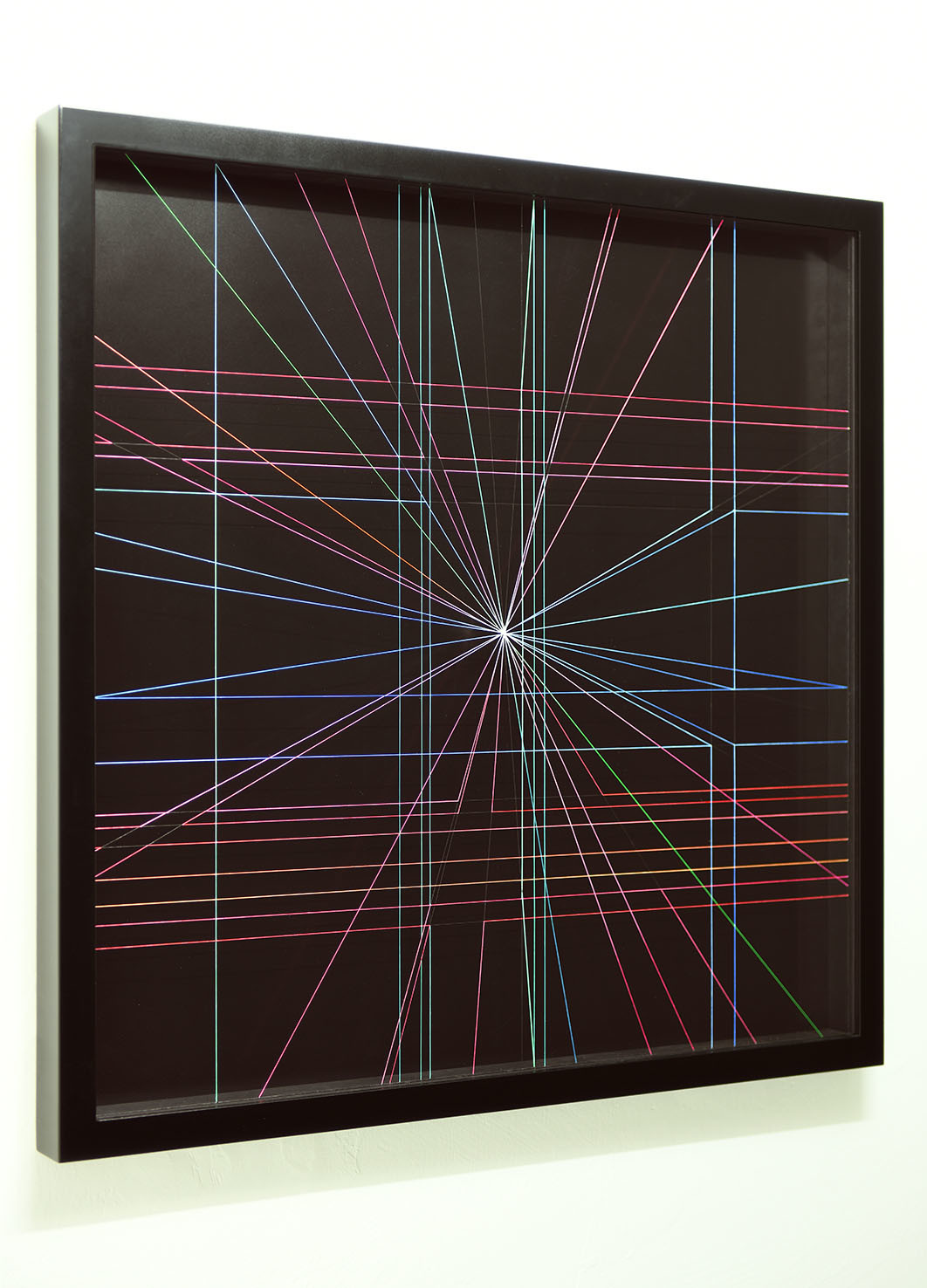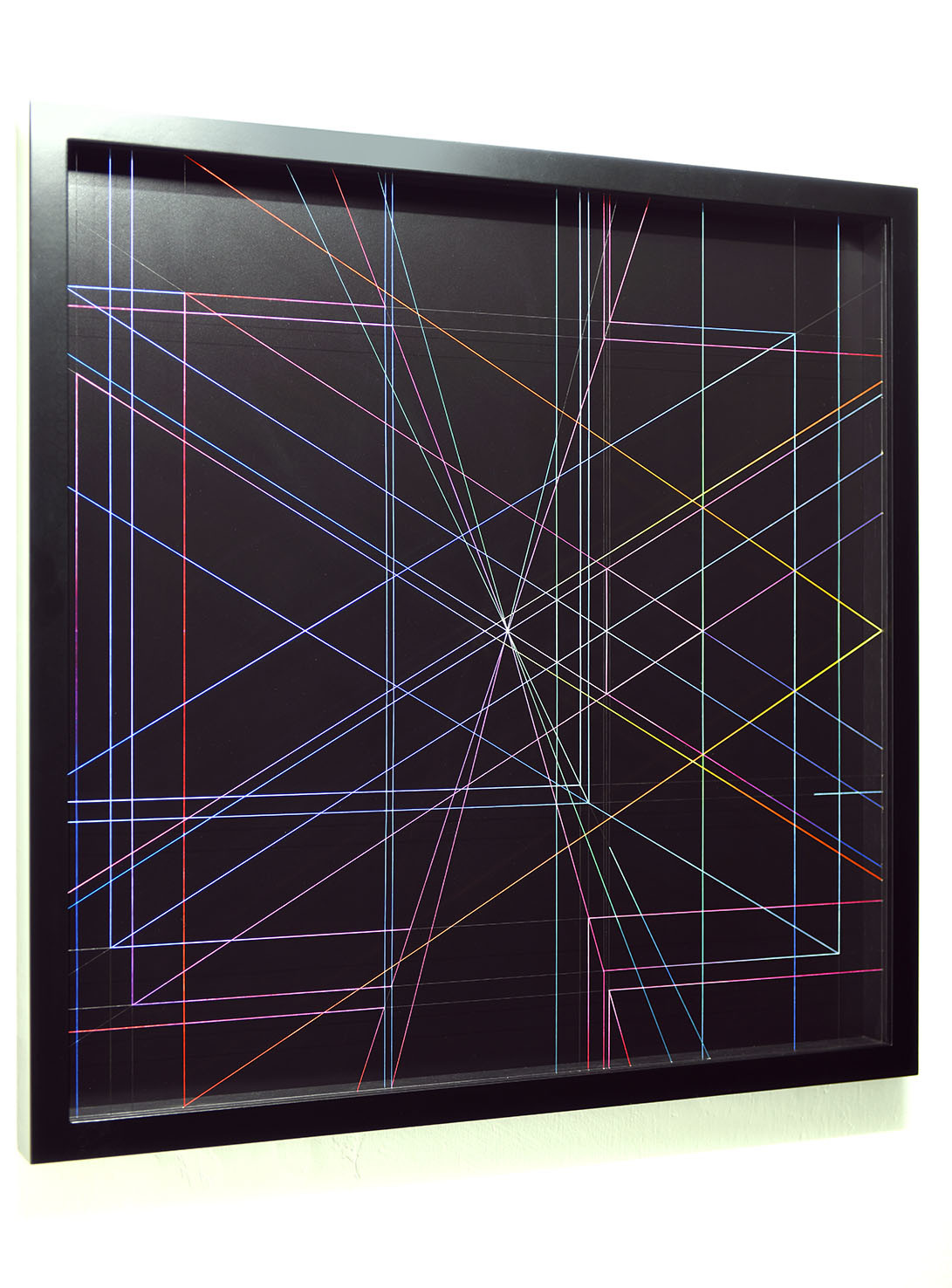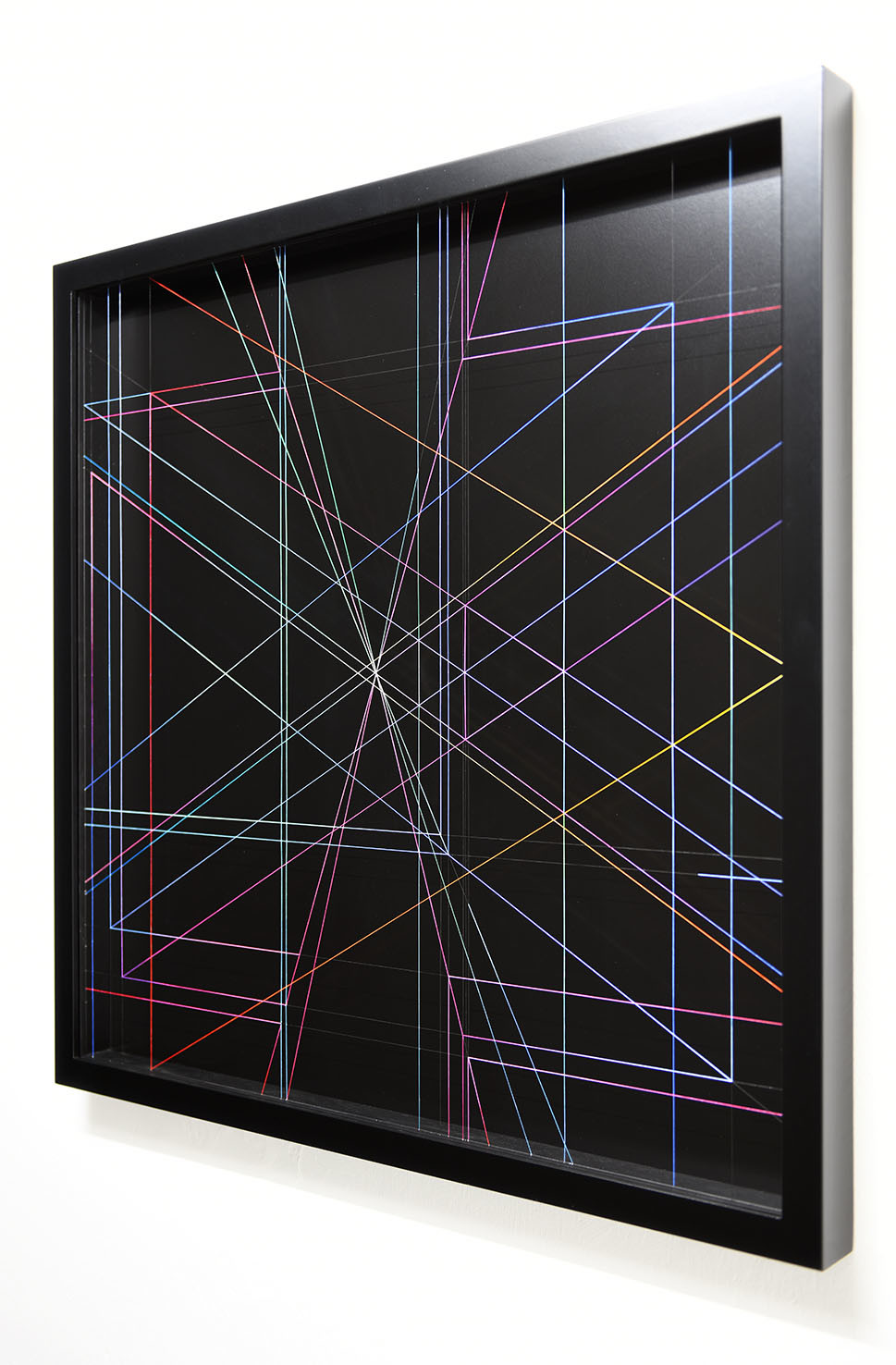 Enamel and acrylic on fluorocarbon thread, frame, background and internal frames in black laquered wood, Museum Glass