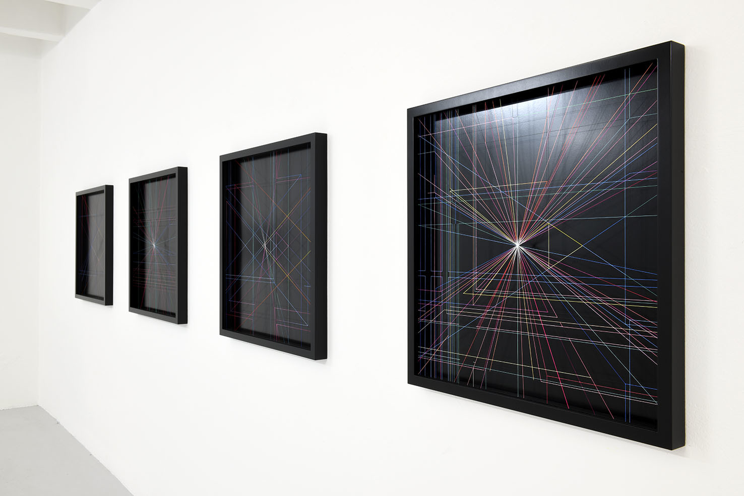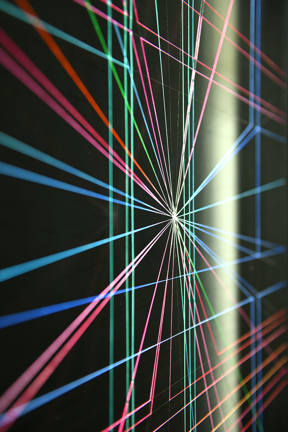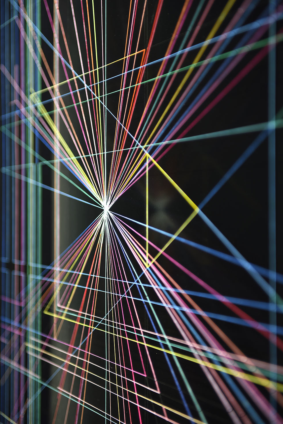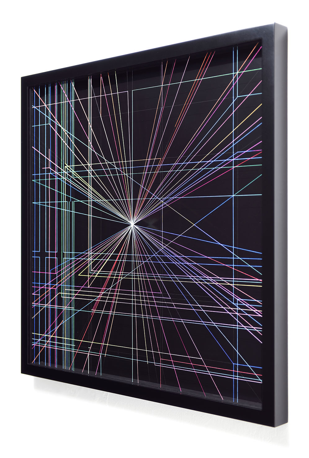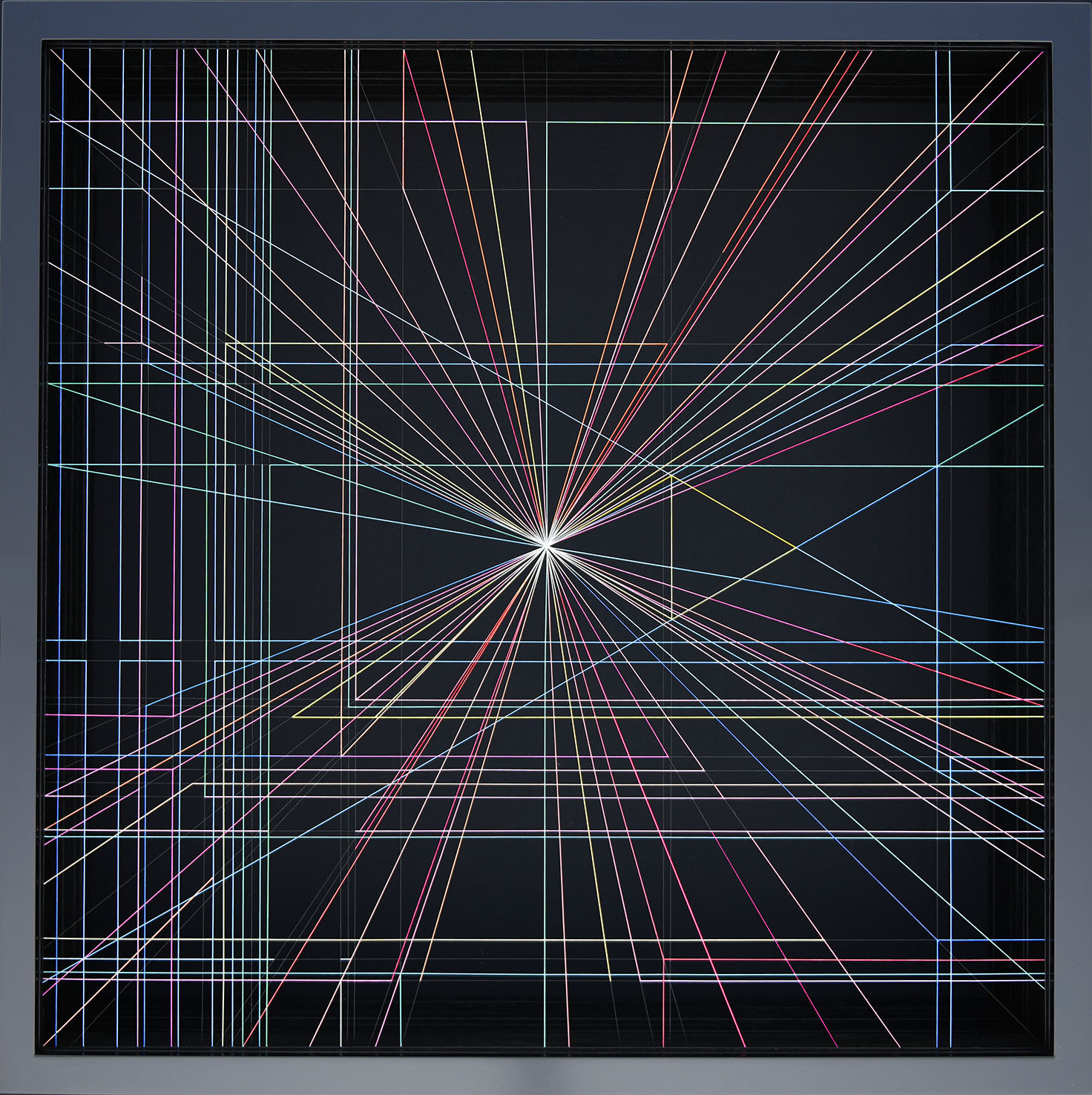 Enamel and acrylic on fluorocarbon thread, frame, background and internal frames in black laquered wood, Museum Glass