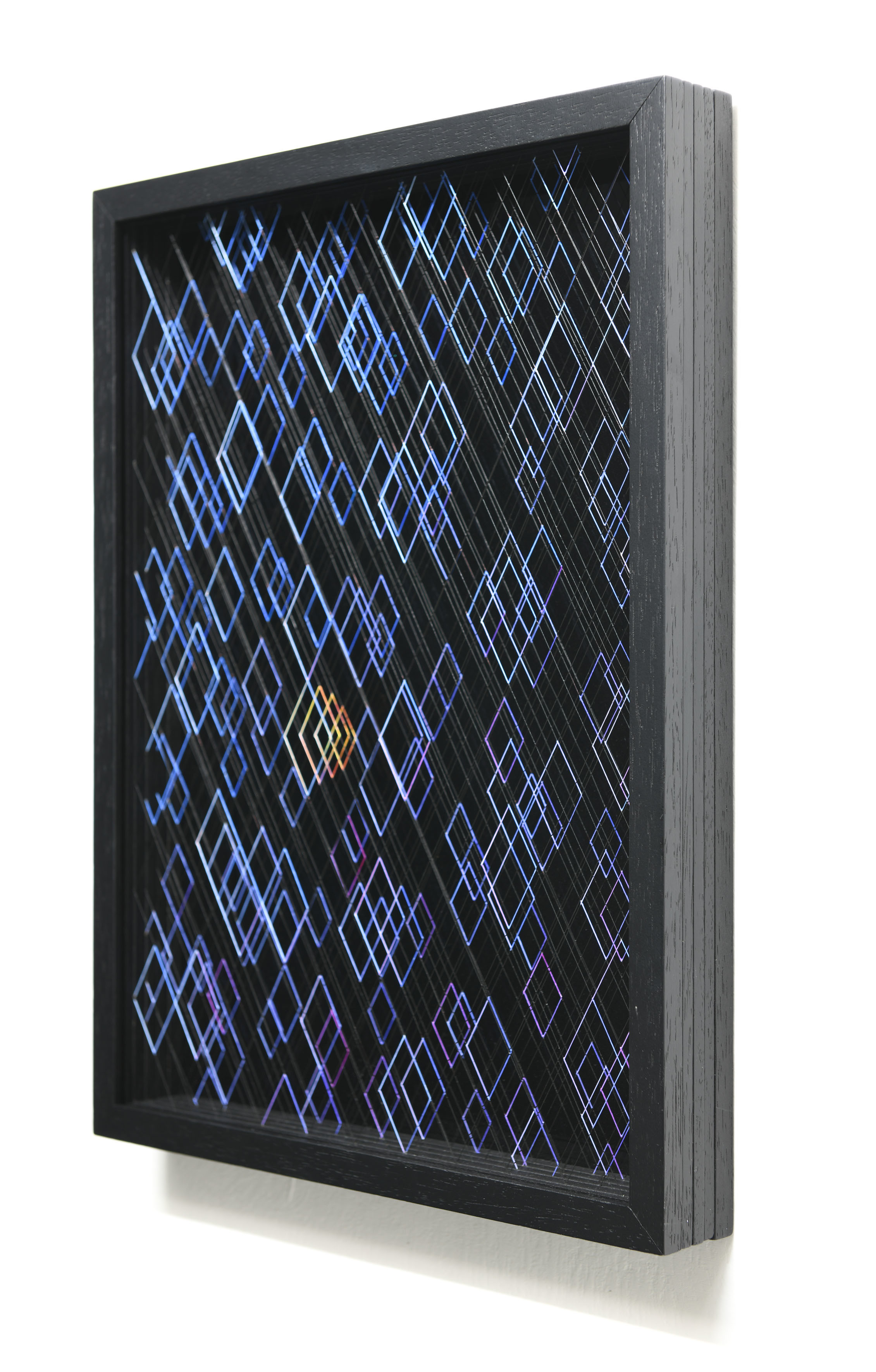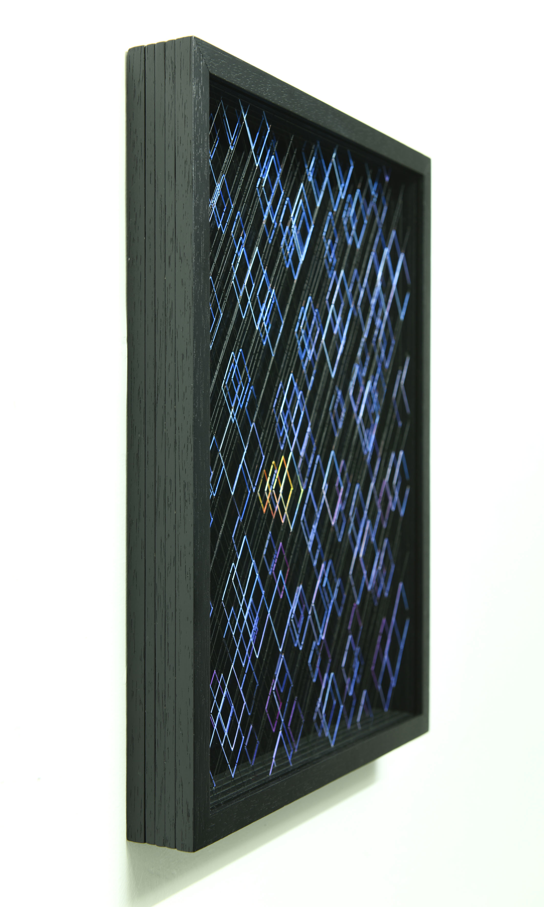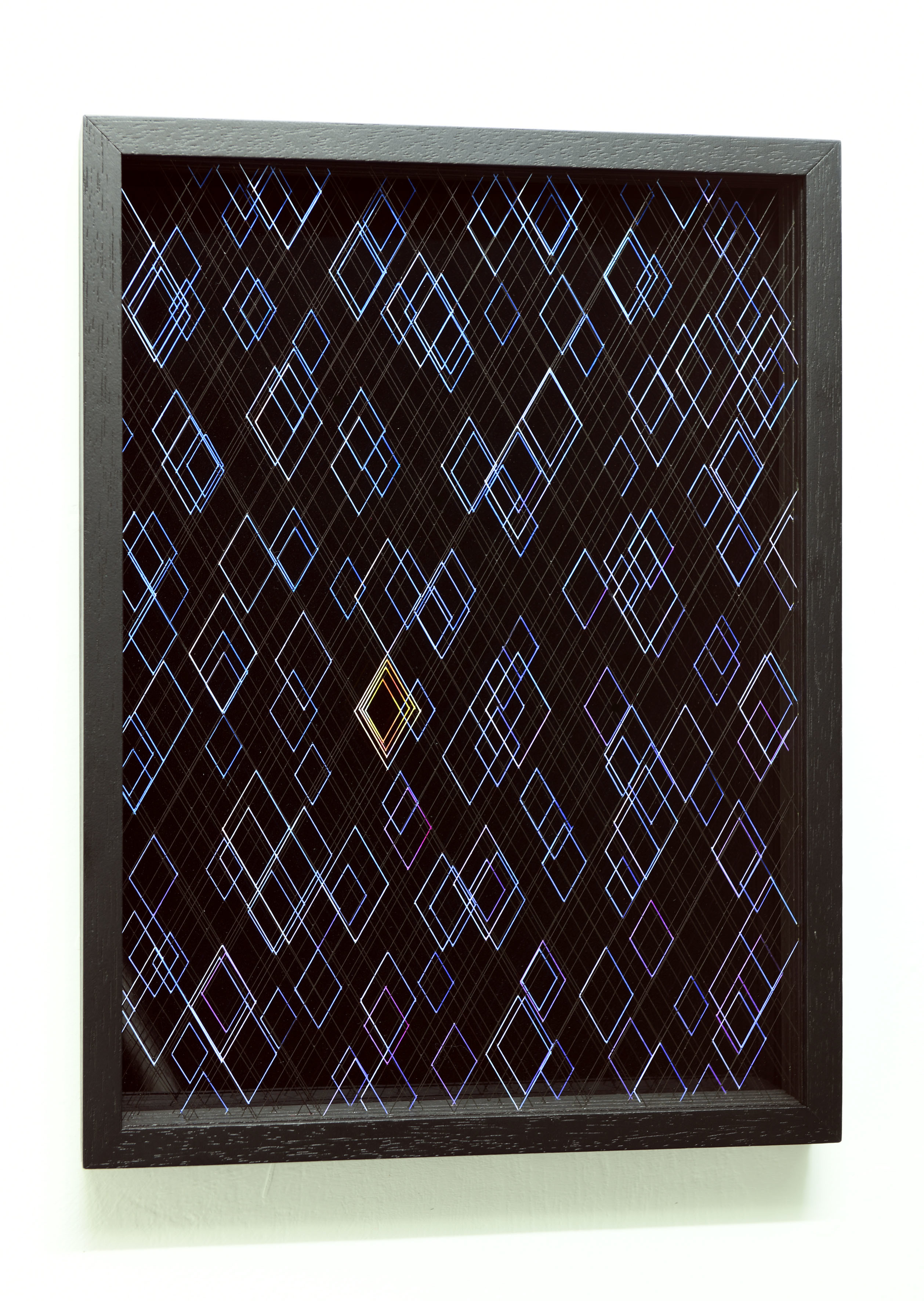 Enamel and acrylic on fluorocarbon thread, wooden frame, varnished aluminum background, Museum Glass