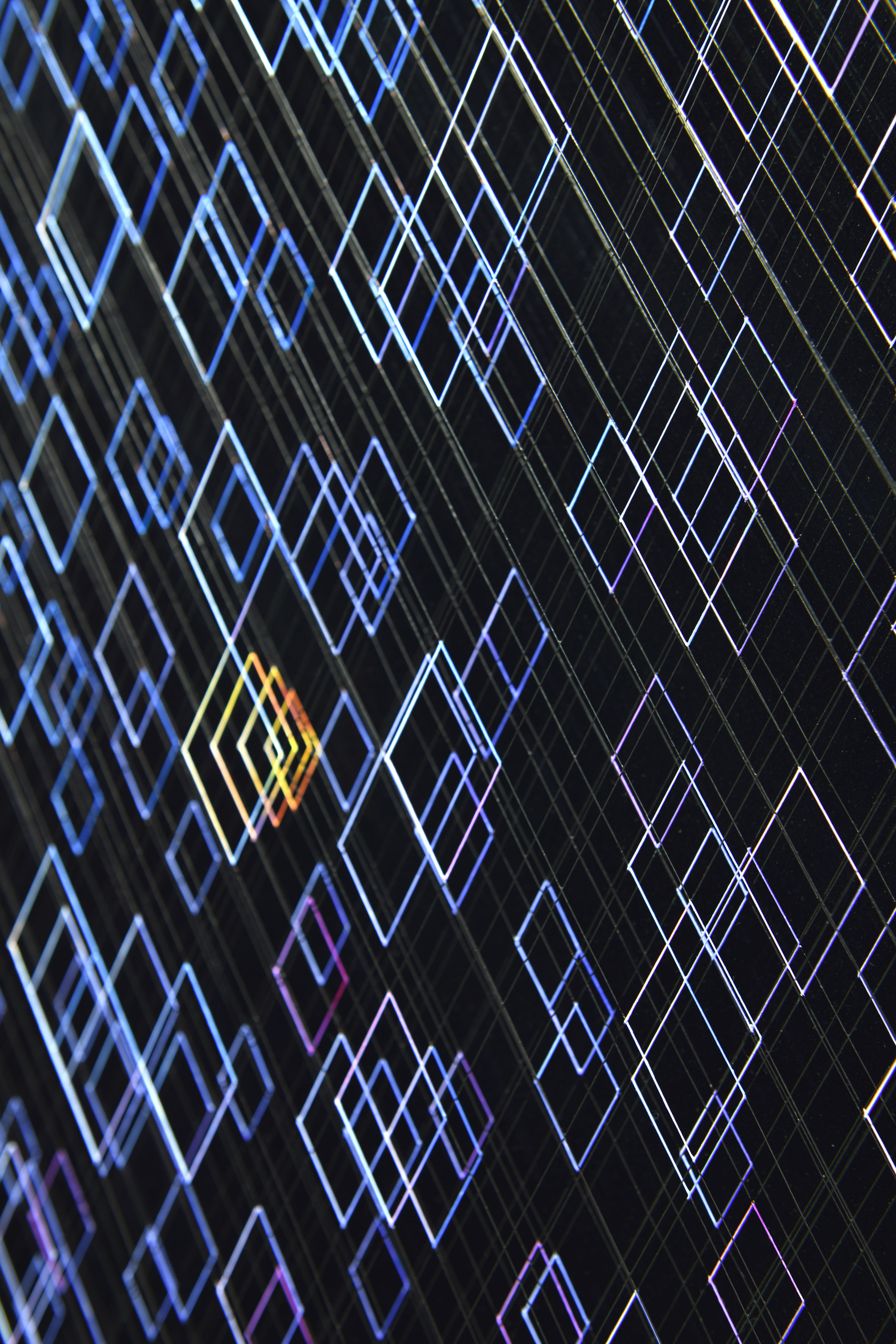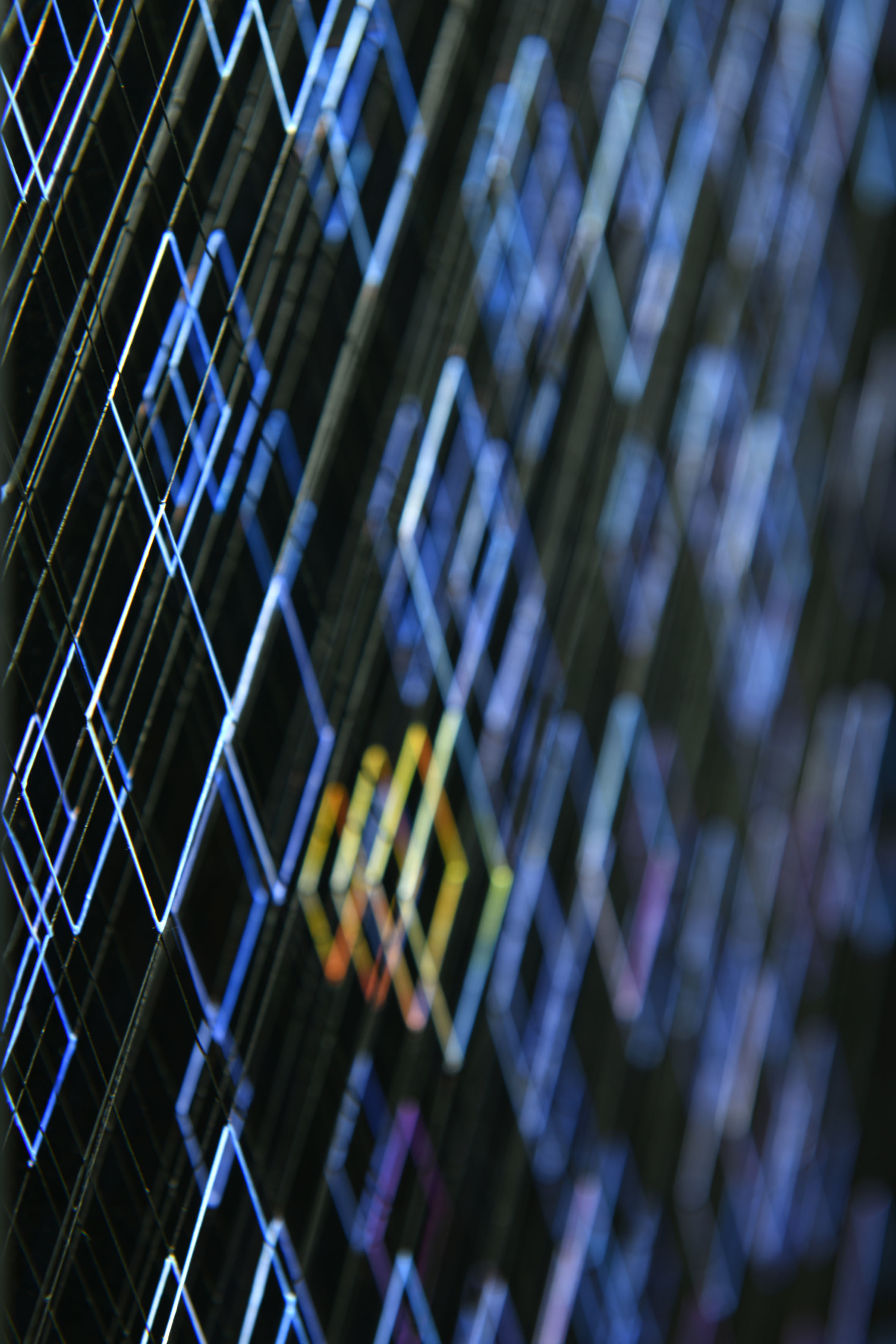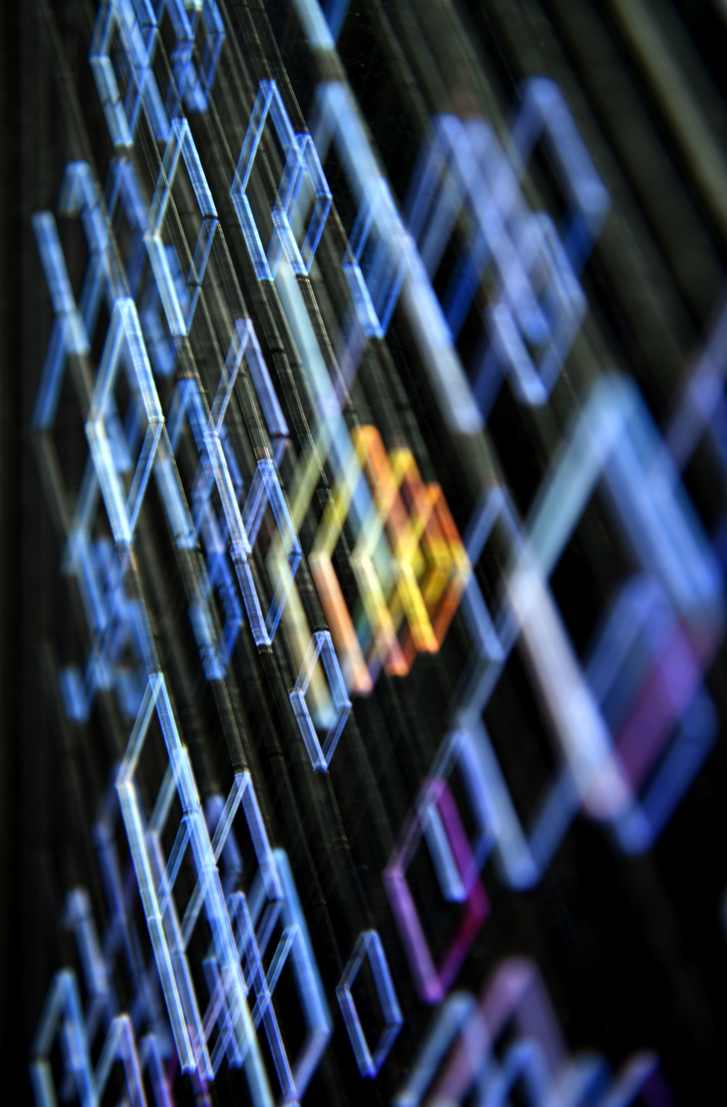 Enamel and acrylic on fluorocarbon thread, wooden frame, varnished aluminum background, Museum Glass