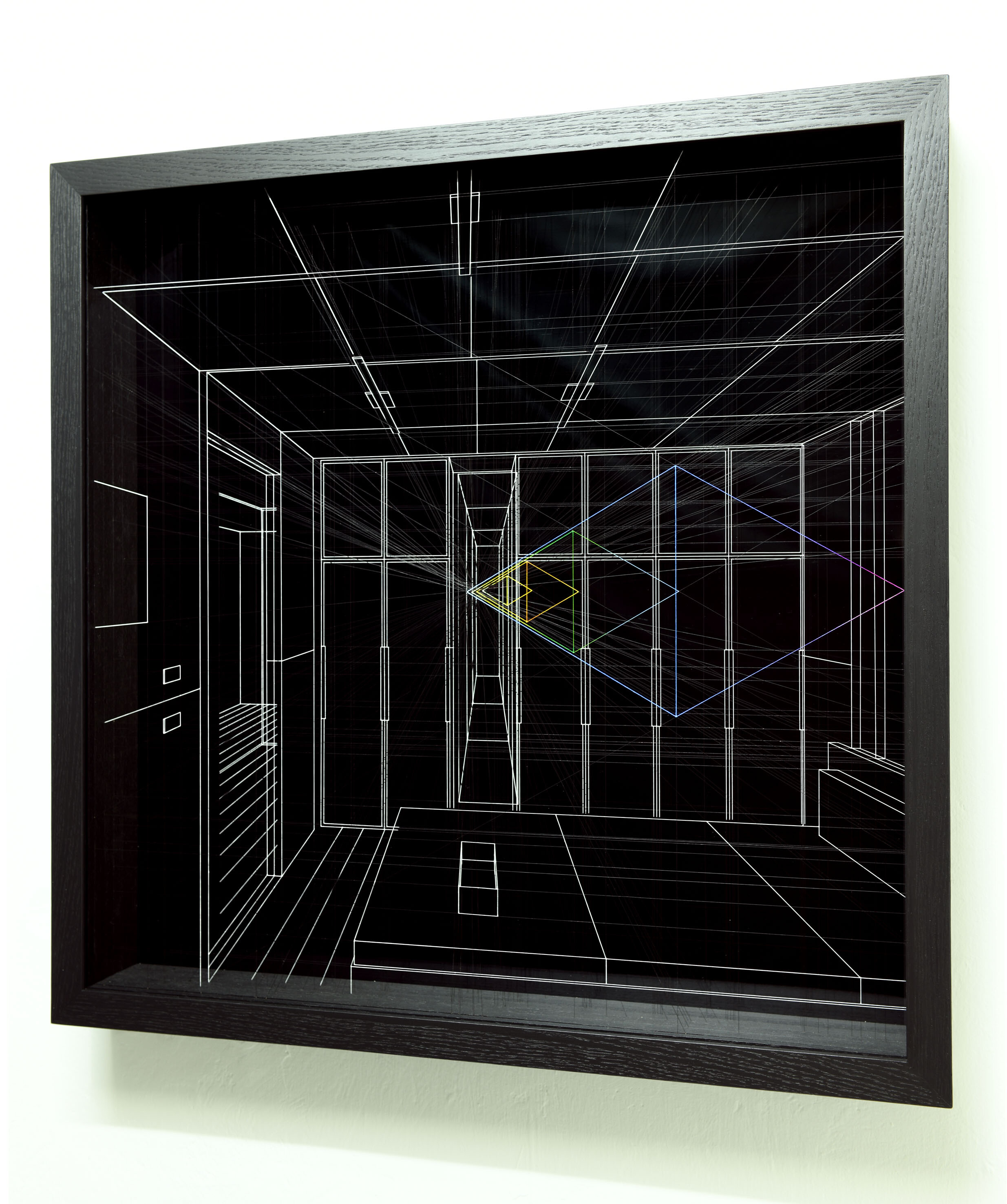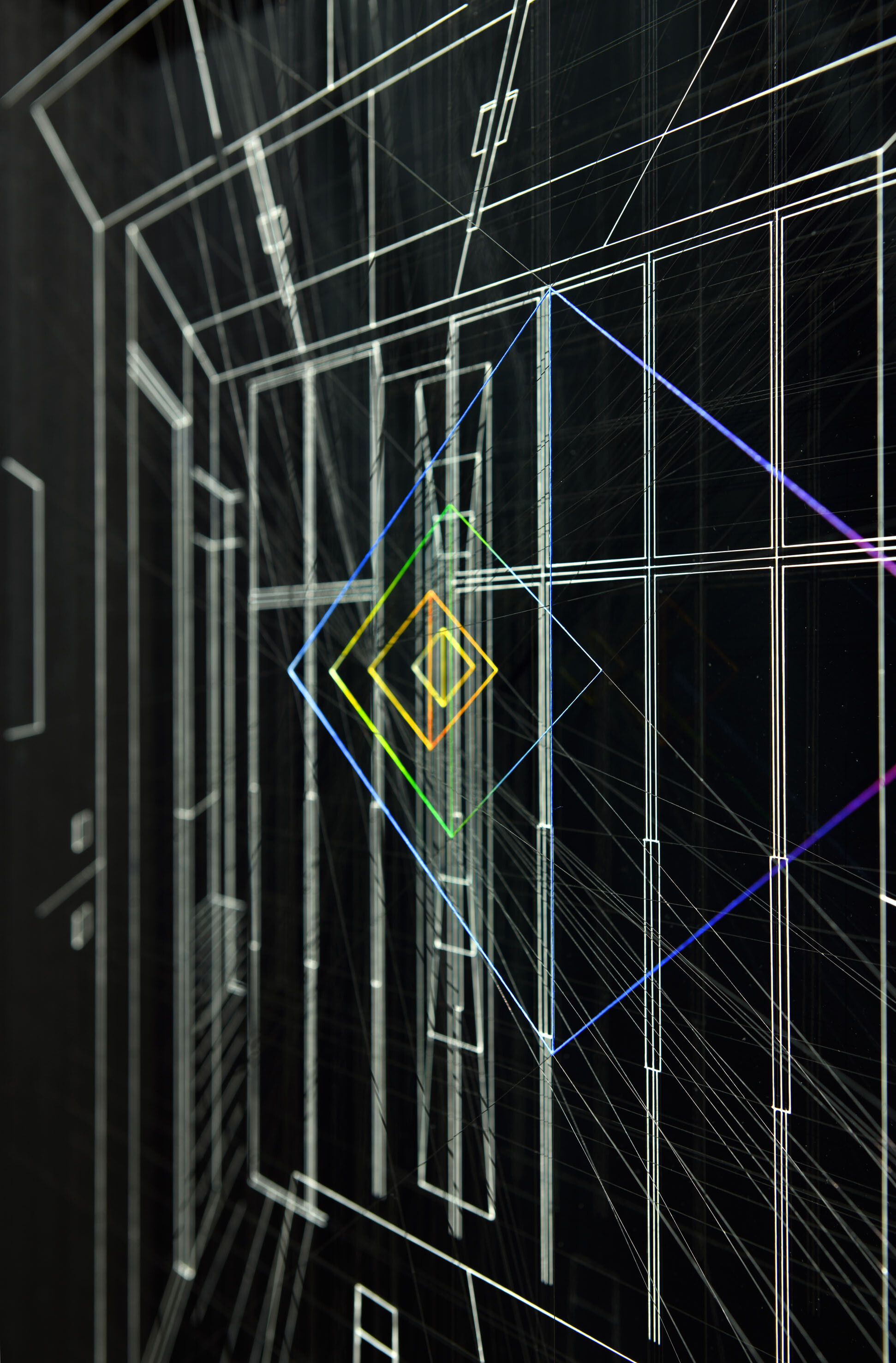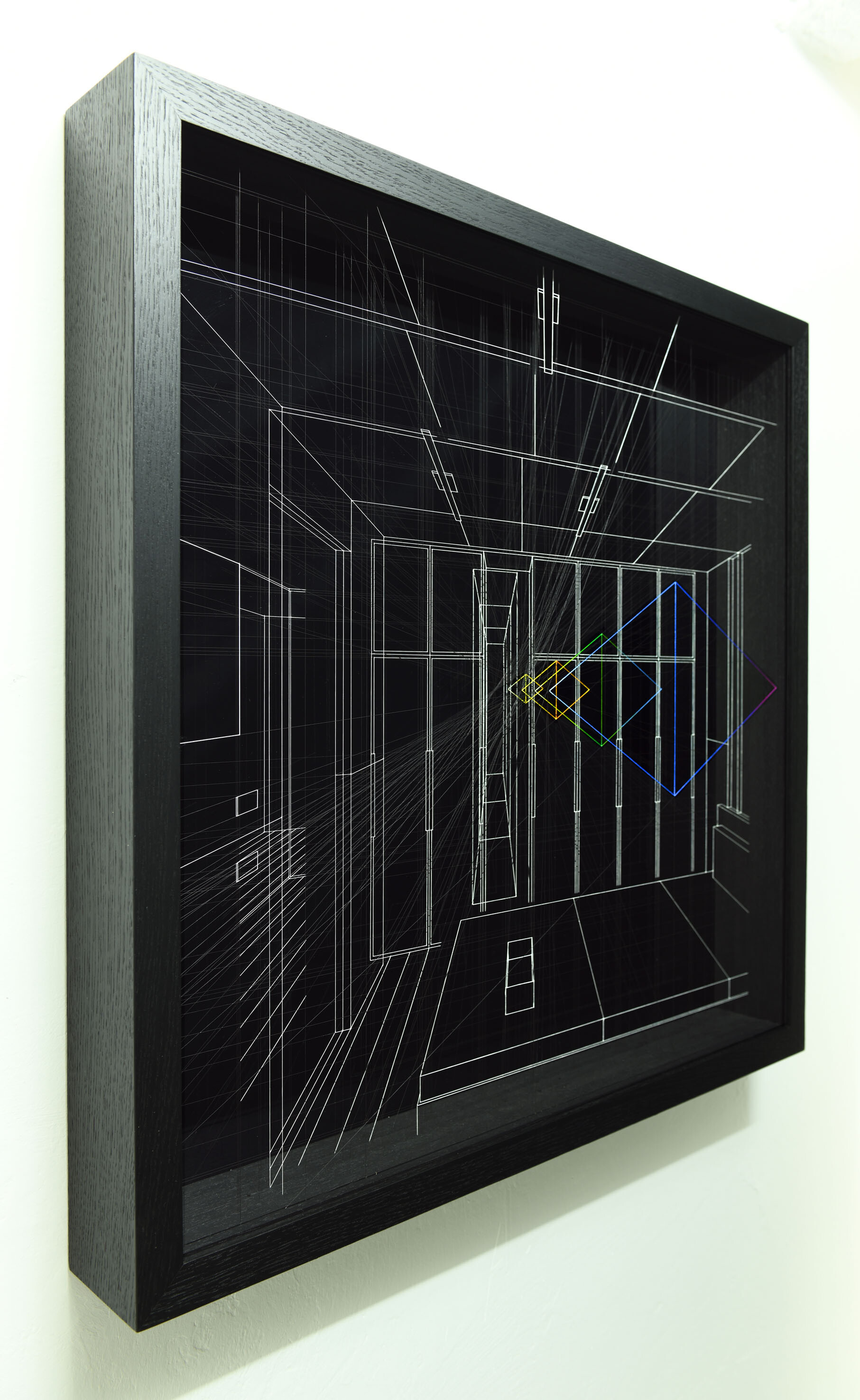 Smalto e acrilico su filo in fluorocarbonio, cornice esterna e telia interni in legno laccato nero, fondo in laminato nero specchiante, vetro museale protettivo esterno