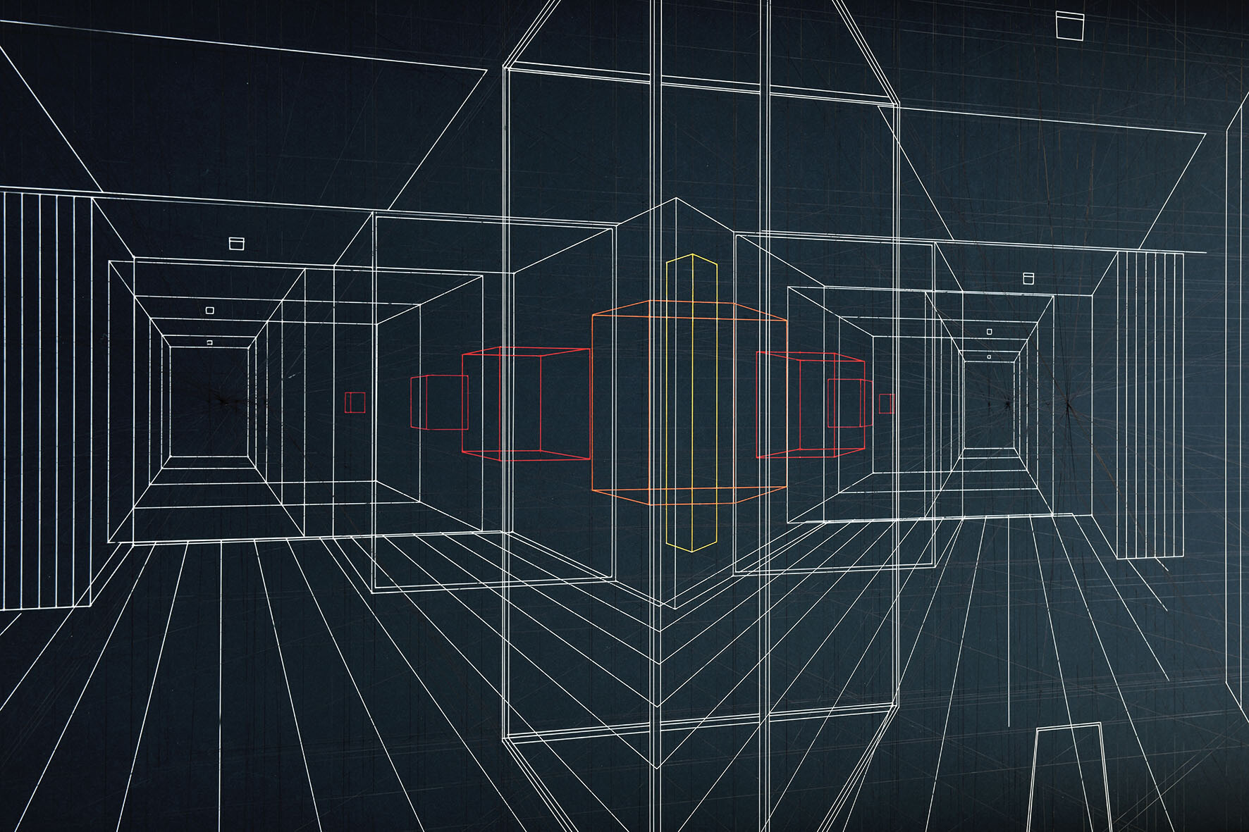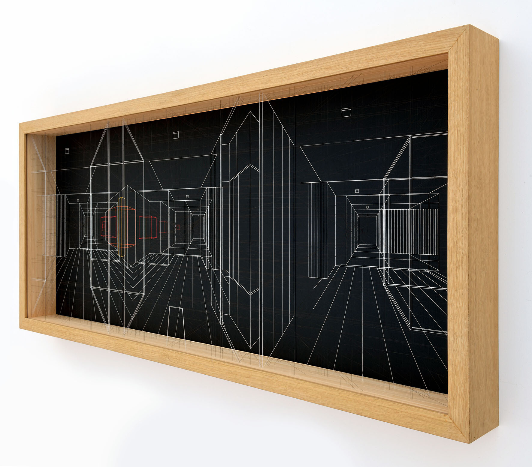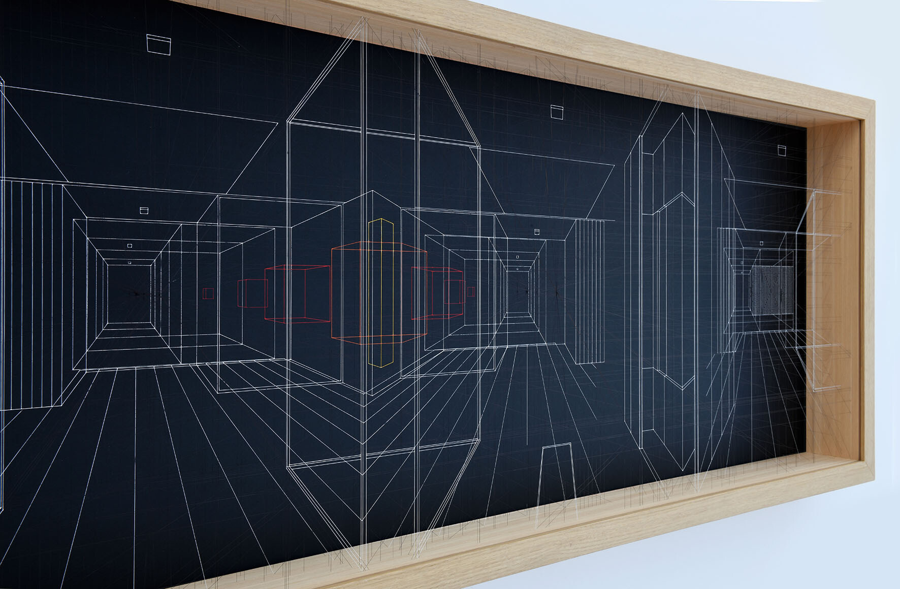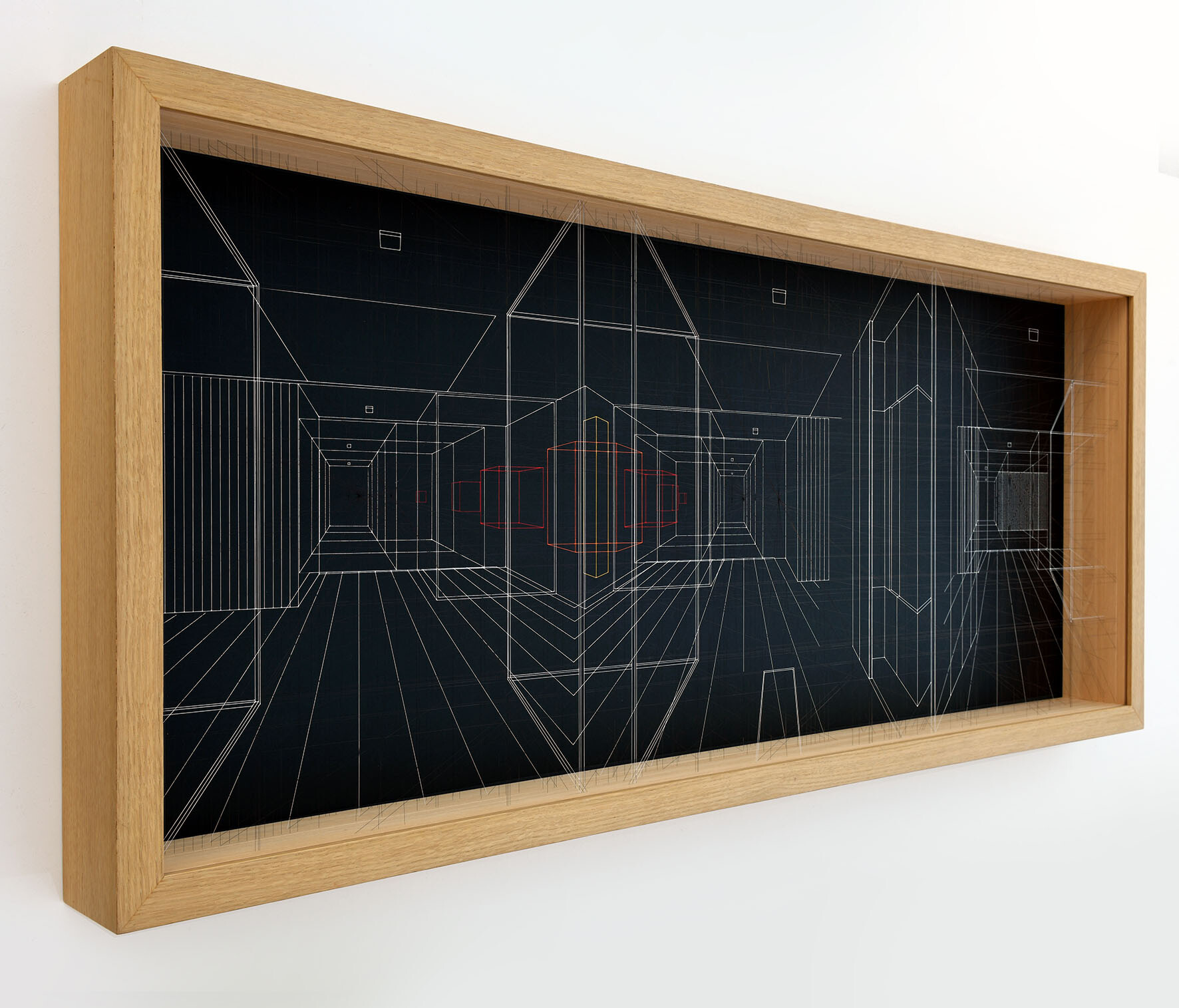 Continuous City is a sophisticated three-dimensional drawing made with thin and transparent fluorocarbon threads, painted and fixed on various overlapping frames.It present hypothetical urban and architectural spaces, such as limbo, metaphysical spaces, abstractions, liminary spaces.
