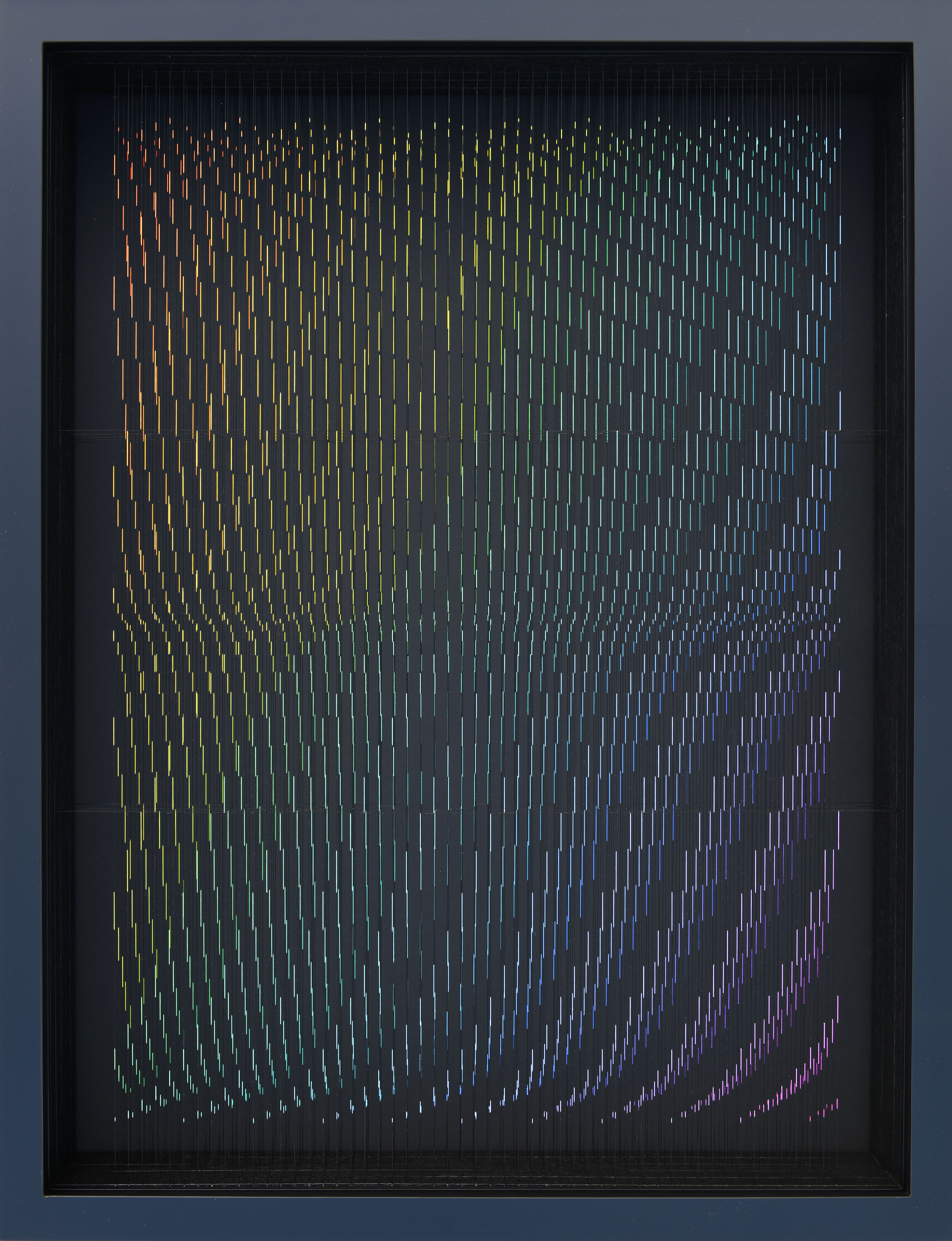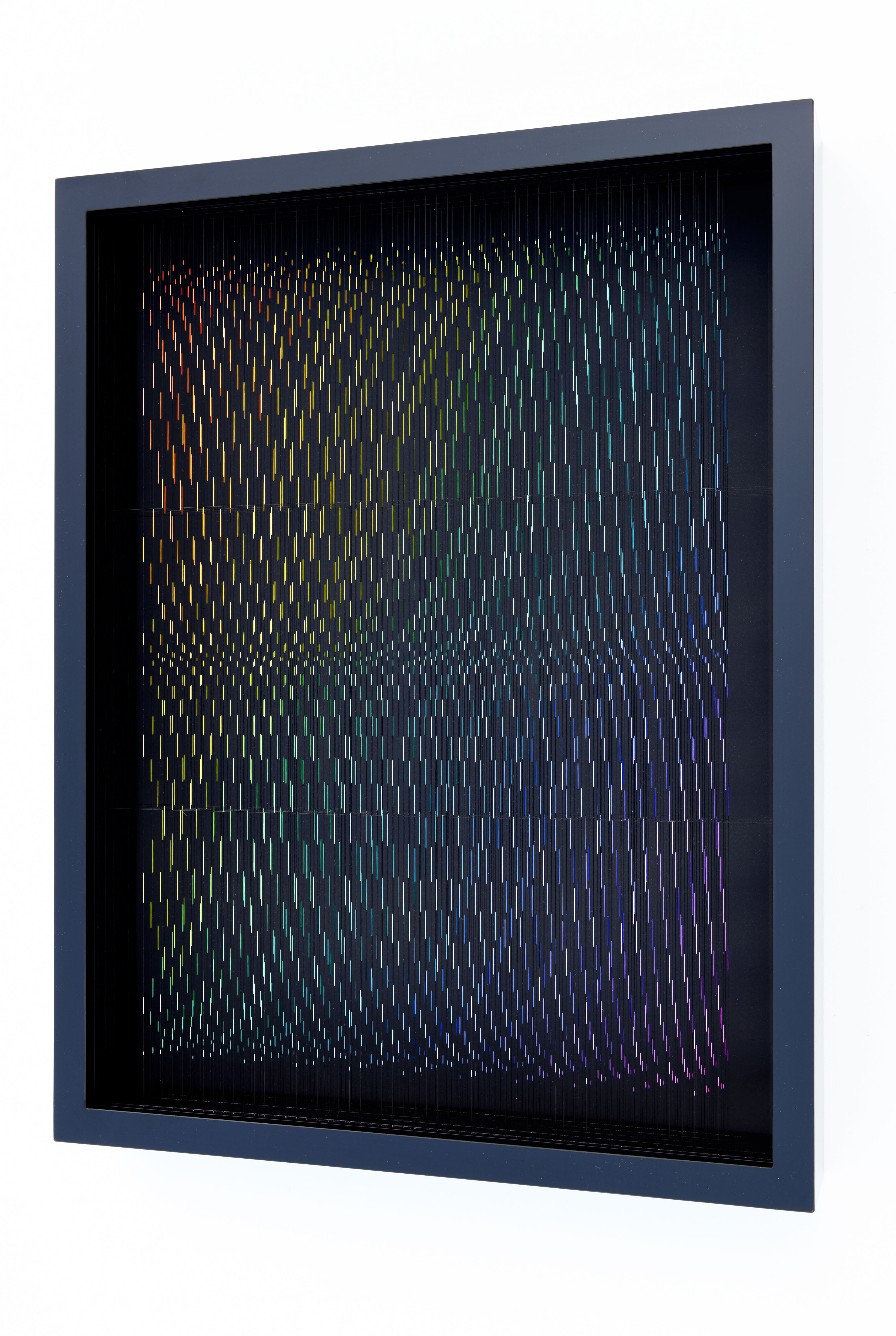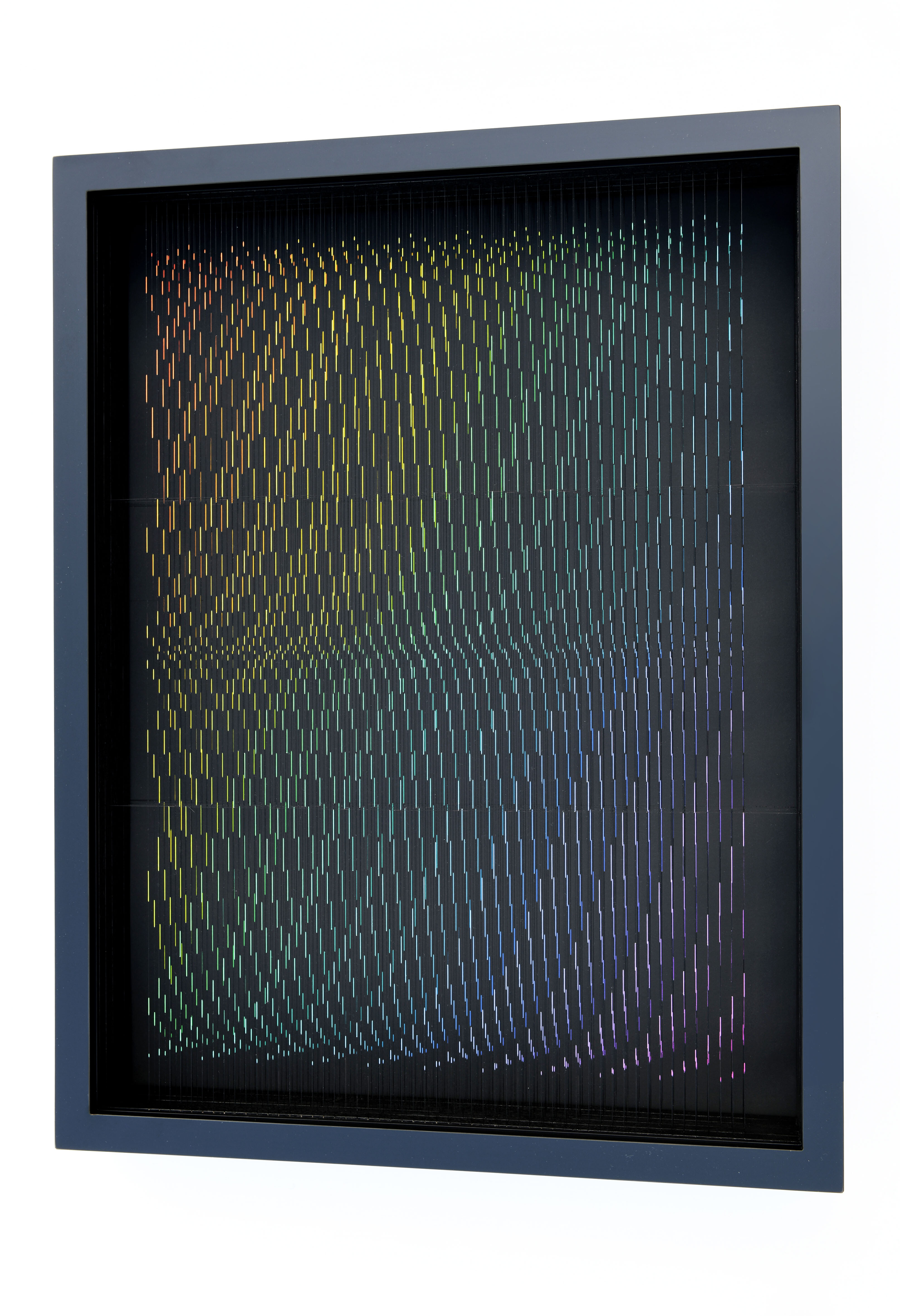 Enamel and acrylic on fluorocarbon thread, frame in wood and glossy black laminate, internal frames in lacquered wood and steel, lacquered wood background, Museum Glass