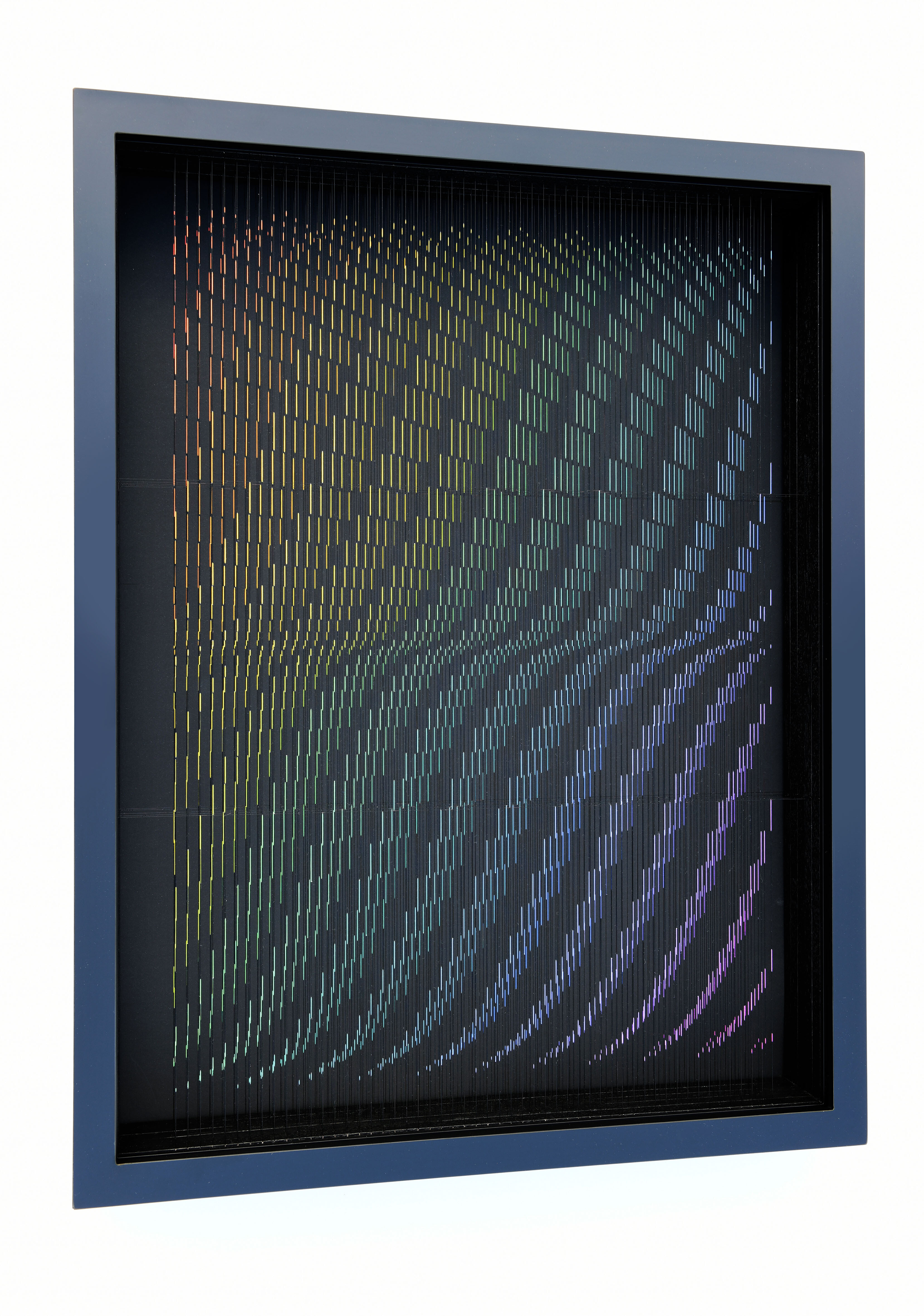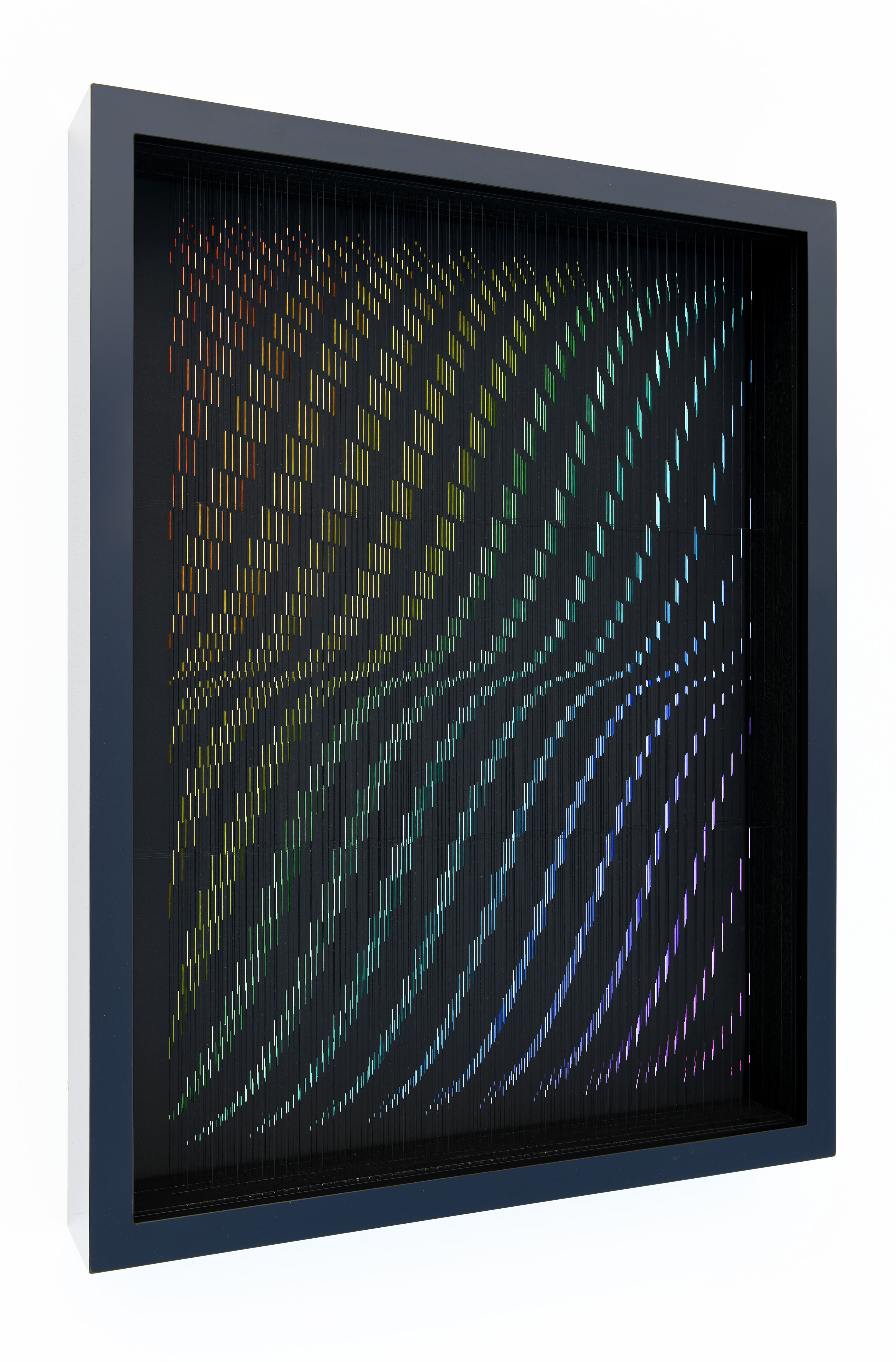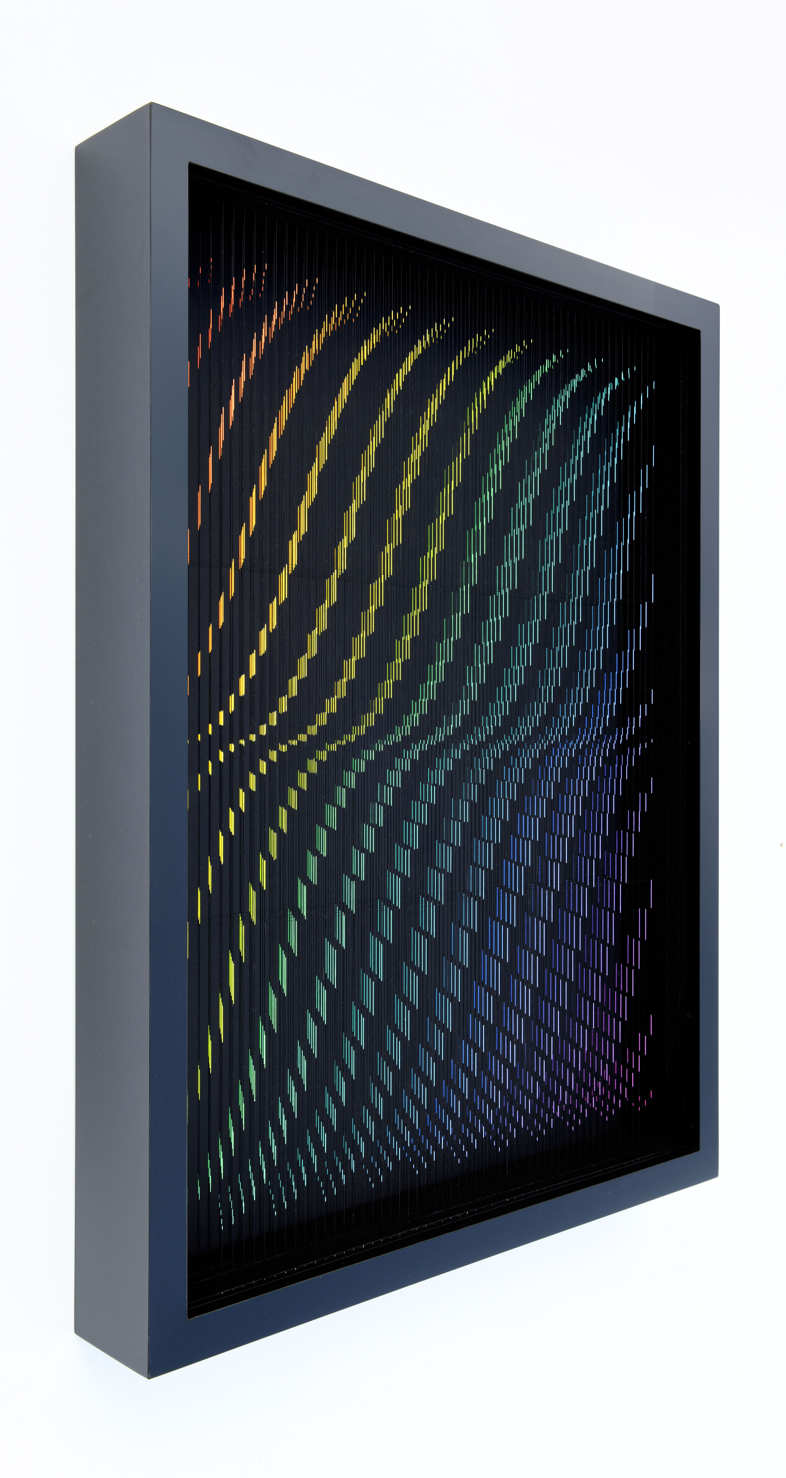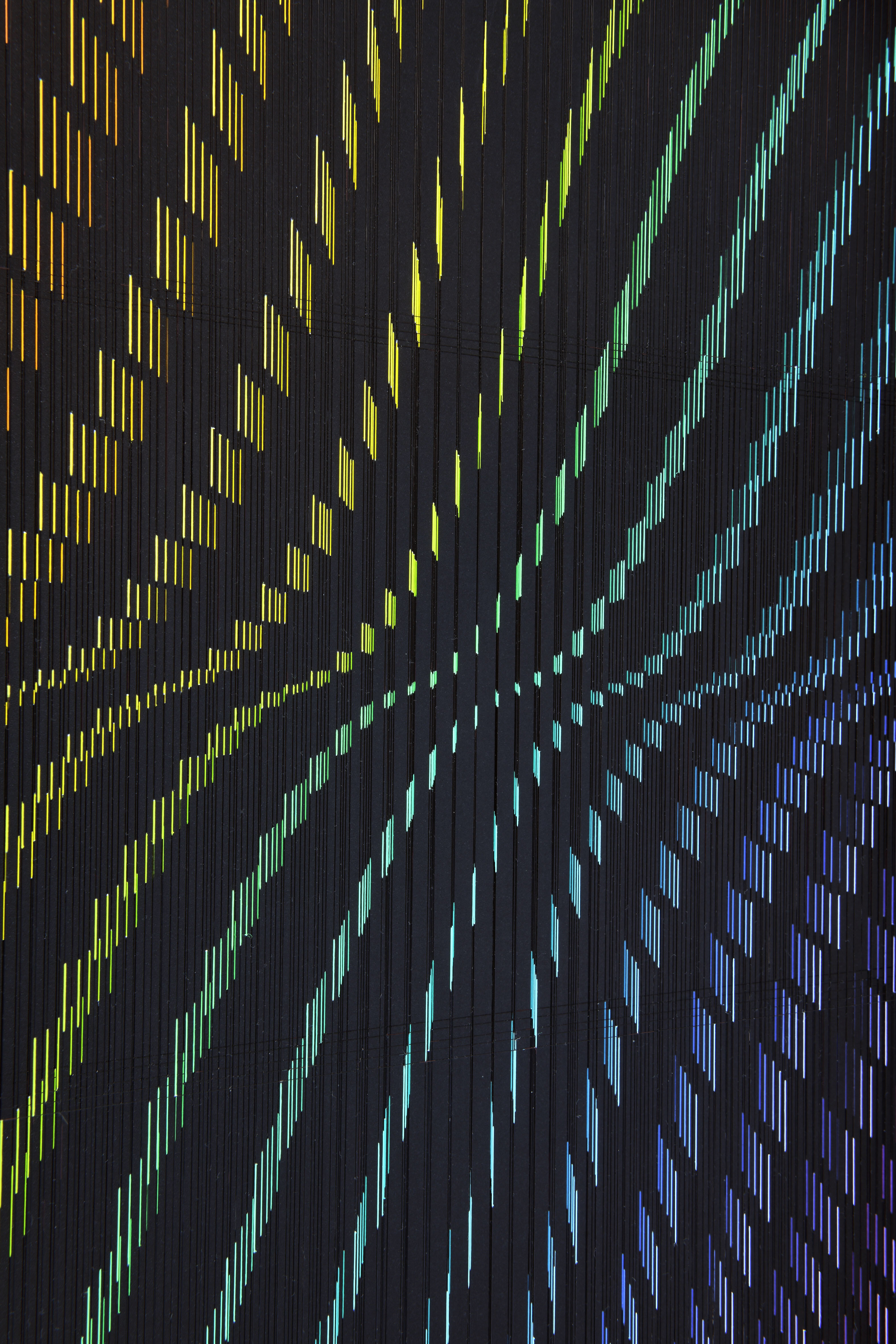 Enamel and acrylic on fluorocarbon thread, frame in wood and glossy black laminate, internal frames in lacquered wood and steel, lacquered wood background, Museum Glass