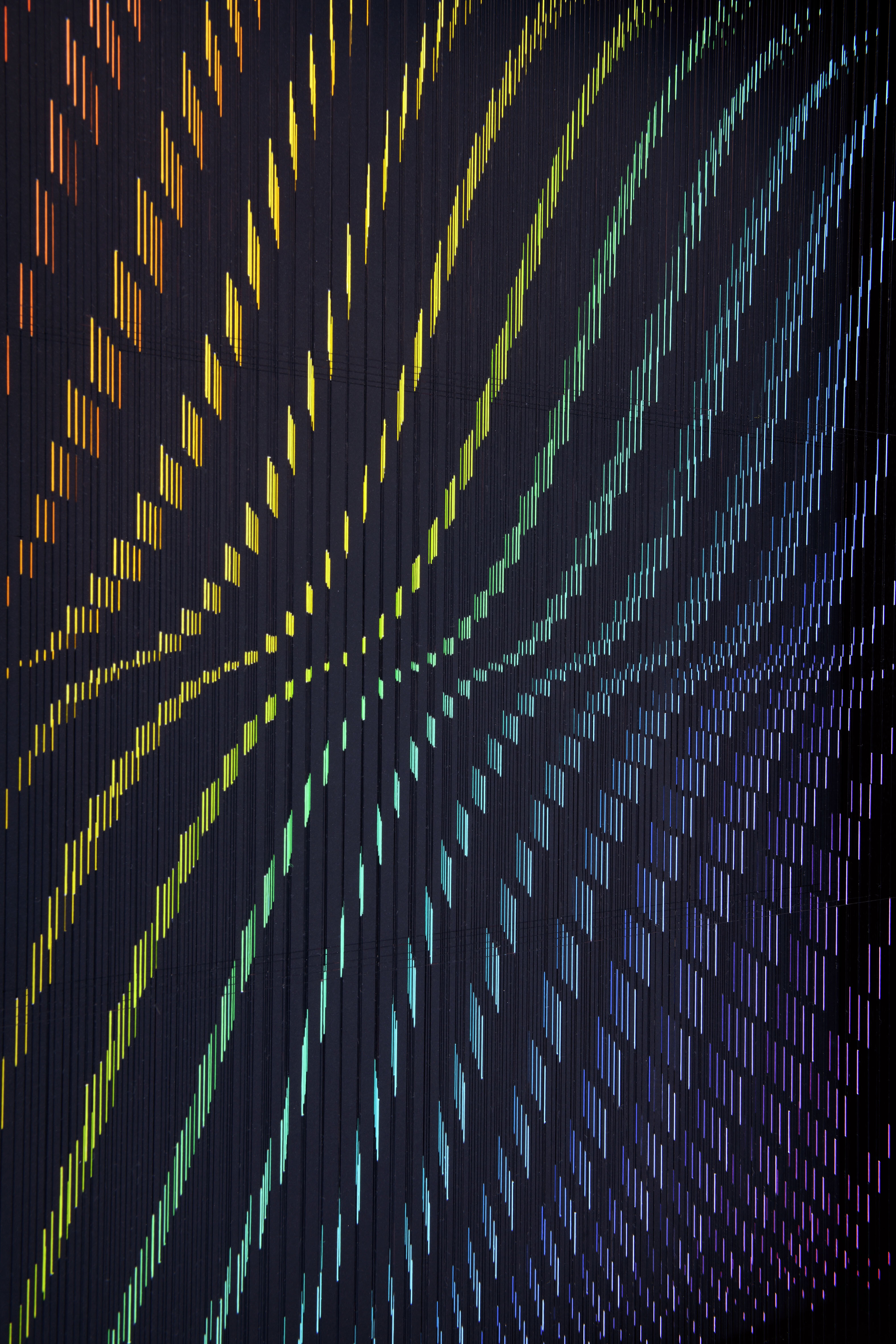 Countless particles of light, between solids and voids, of different lengths and shades, form an alternating series of gravitational waves. Like oscillations of energy, they propagate in space and together they constitute an iridescent pictorial surface, almost as if it were a living body in movement and transformation.