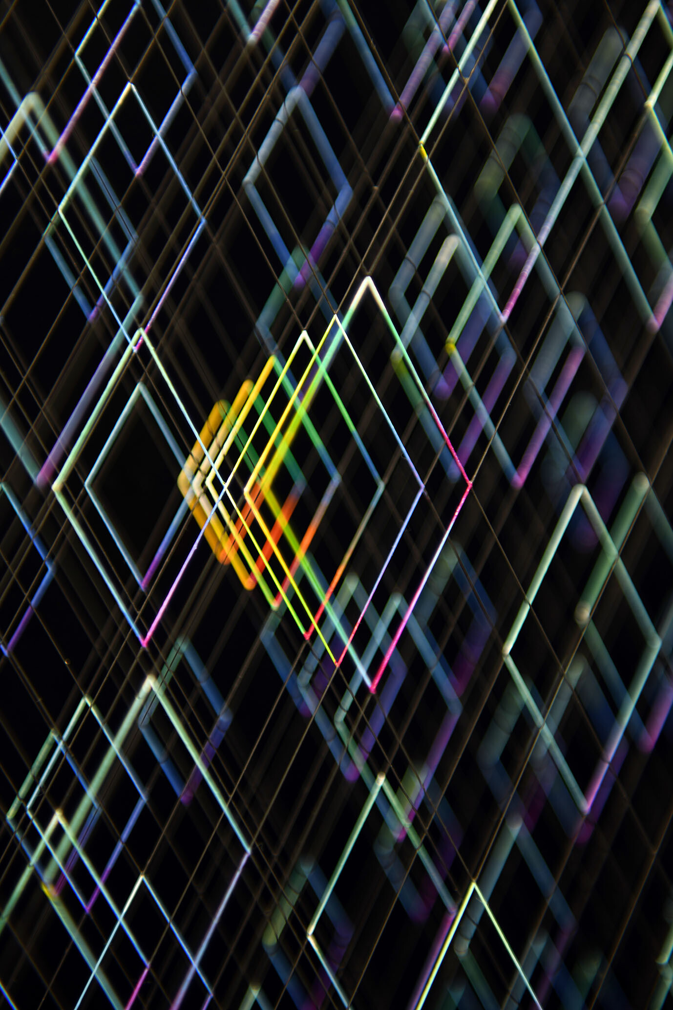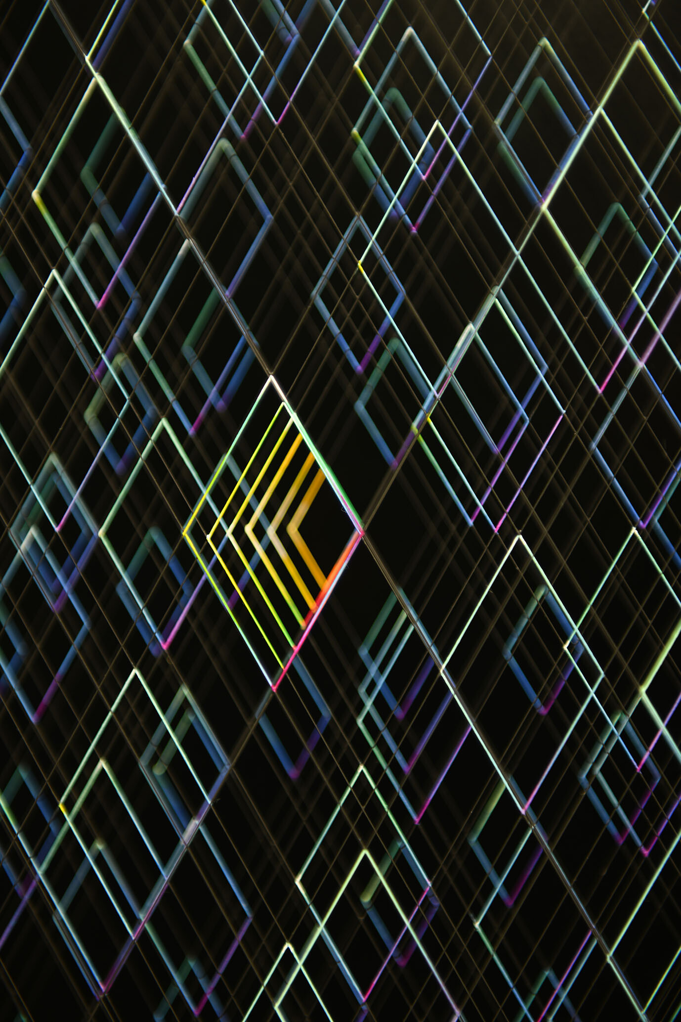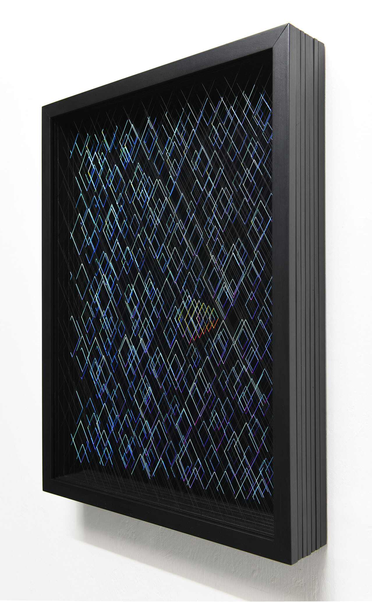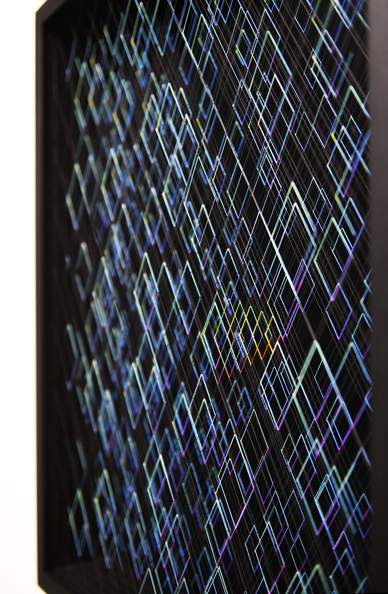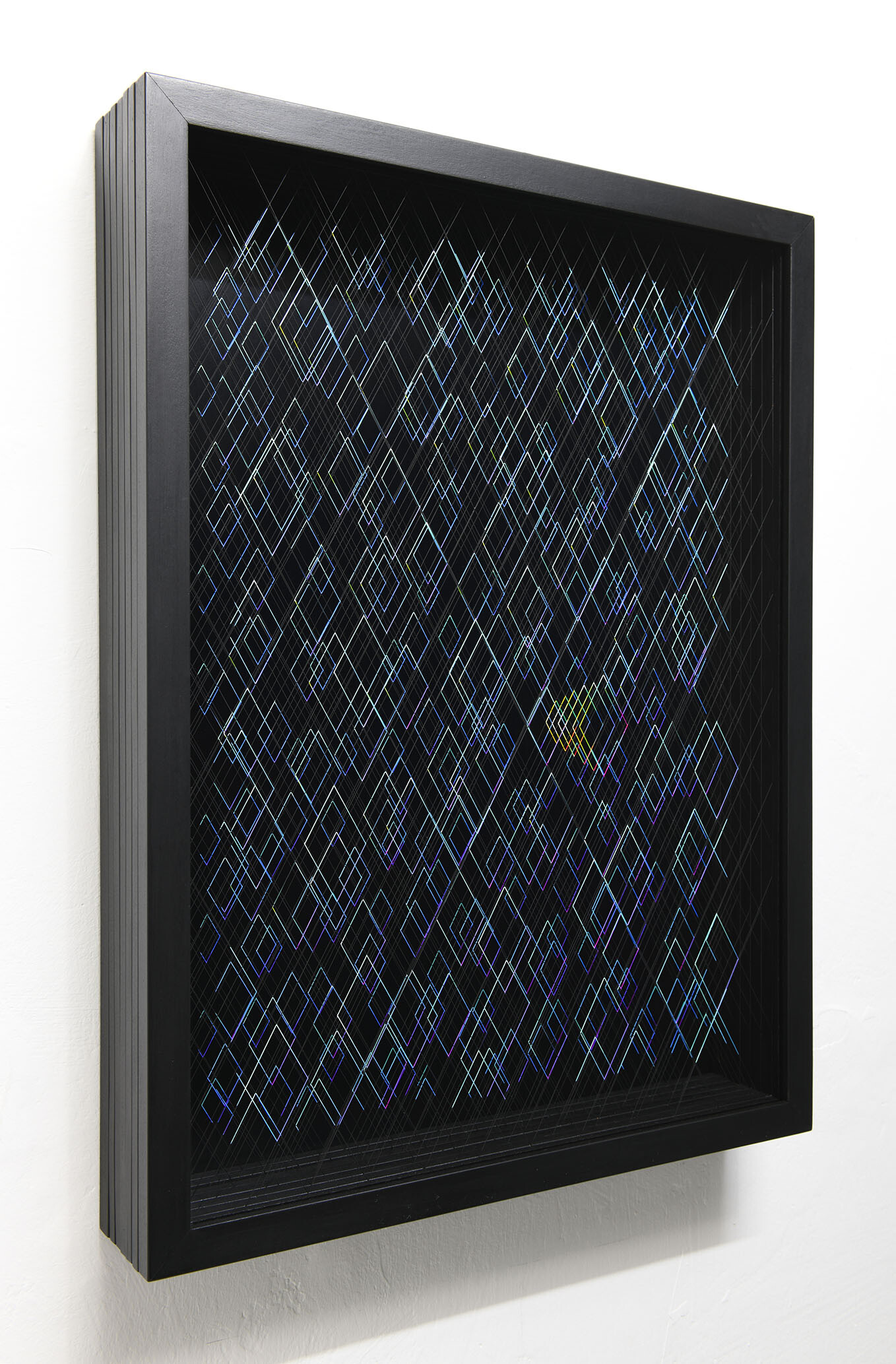 Enamel and acrylic on fluorocarbon thread, wooden frame, painted aluminum background, Museum Glass