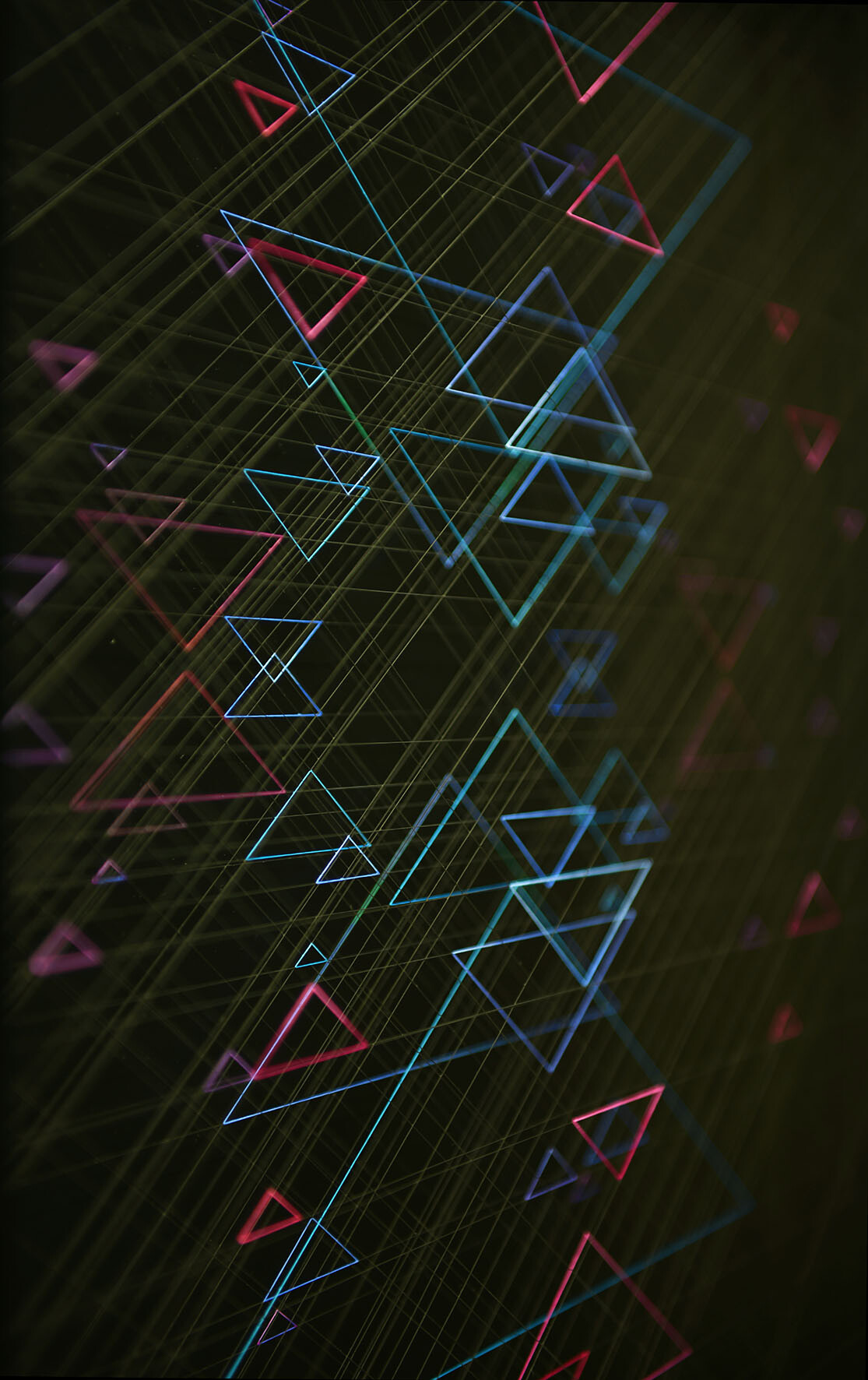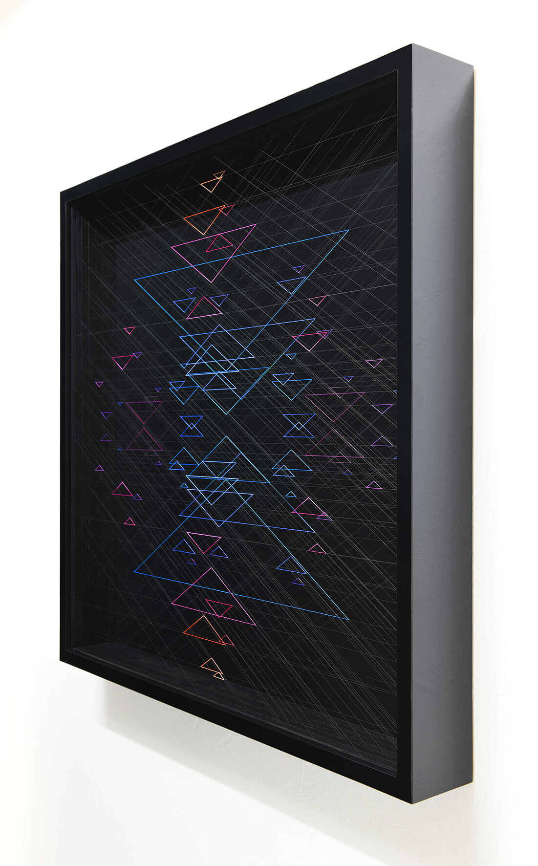 Enamel and acrylic on fluorocarbon thread, frame in wood and glossy black laminate, internal frames in lacquered wood and steel, painted wood background, Museum Glass