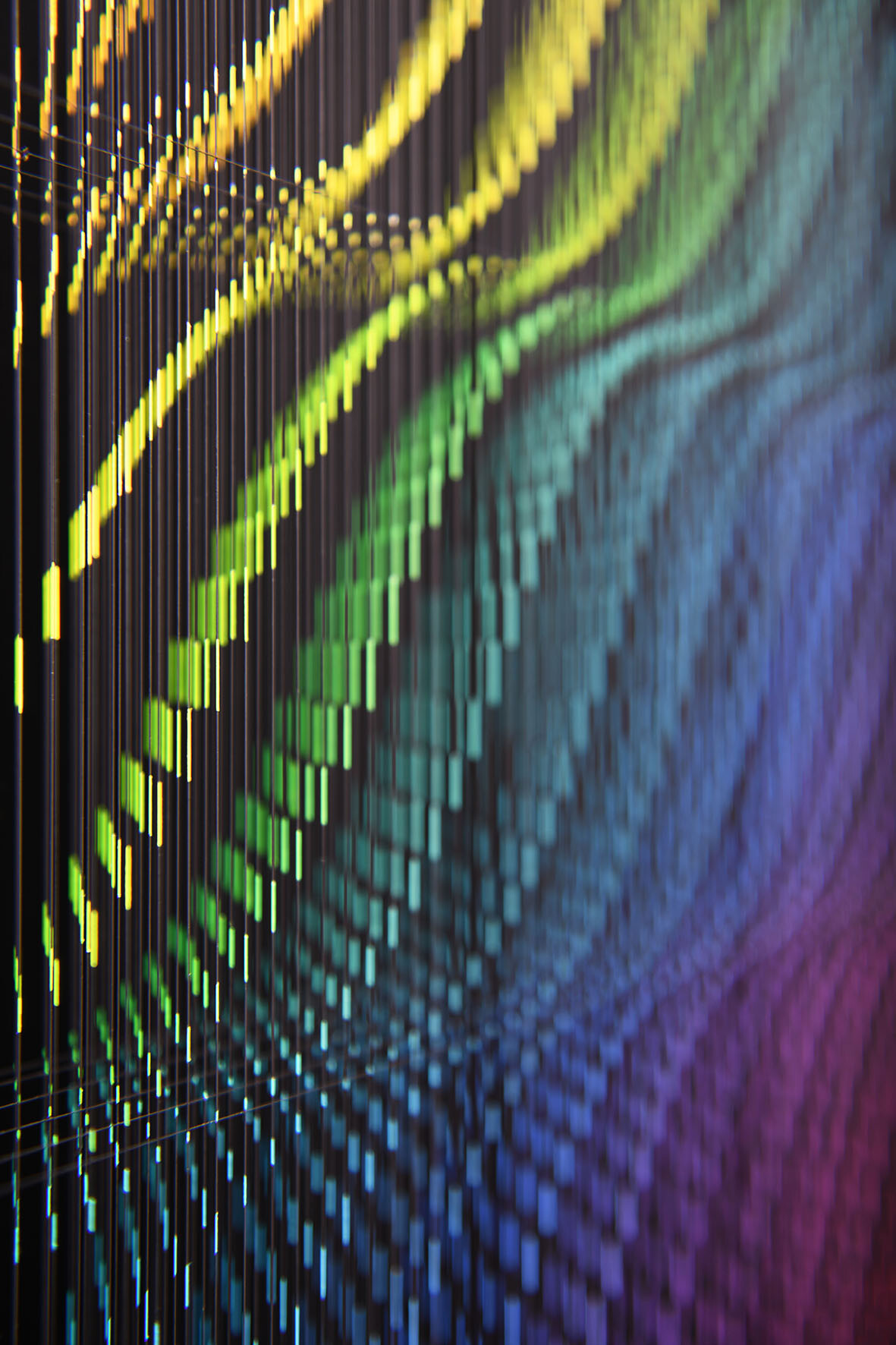 Enamel and acrylic on fluorocarbon thread, wooden frame, painted aluminum background, Museum Glass