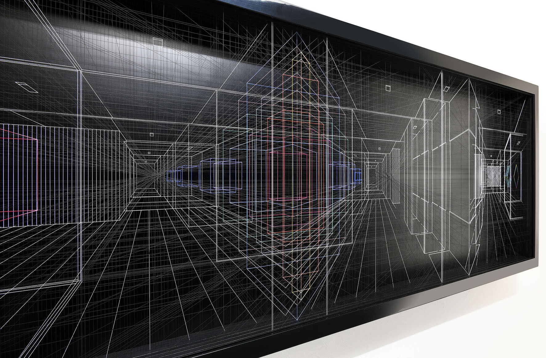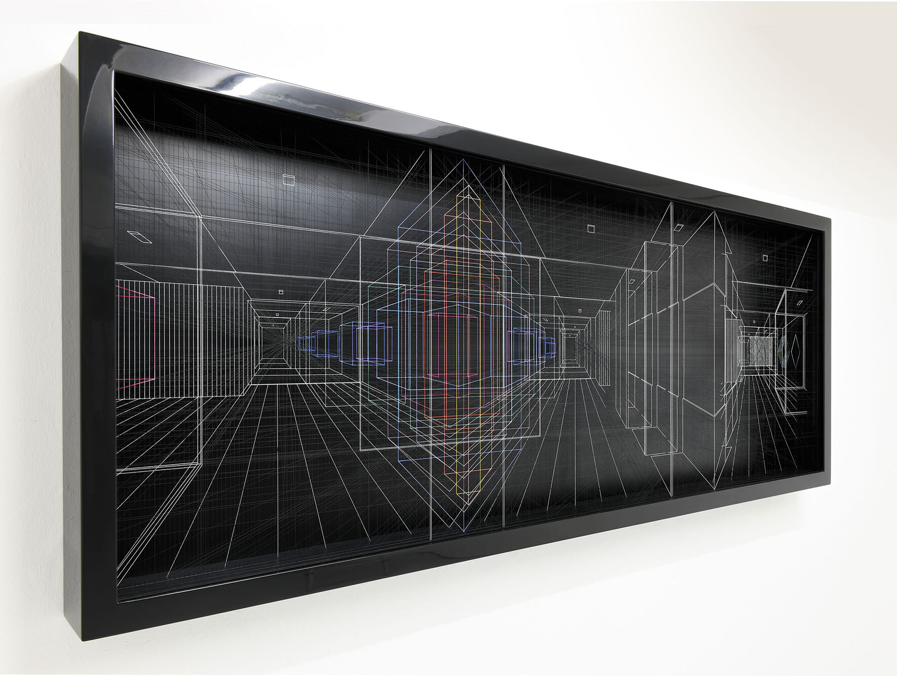 Smalto e acrilico su filo di fluorocarbonio, cornice in legno laccato, telai interni in legno laccato e acciaio, fondo in alluminio verniciato, Vetro Museale