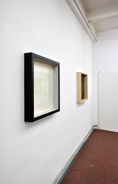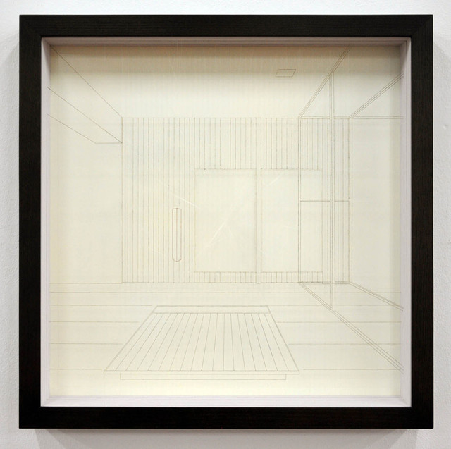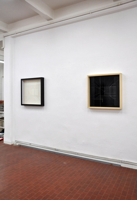 acrylic on fluorocarbon line, wood frame, metal background, plexiglas