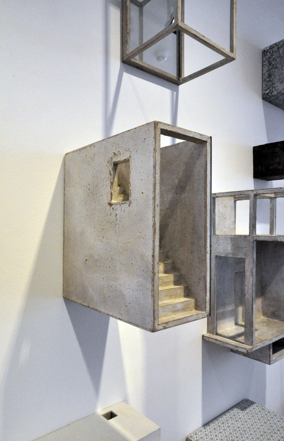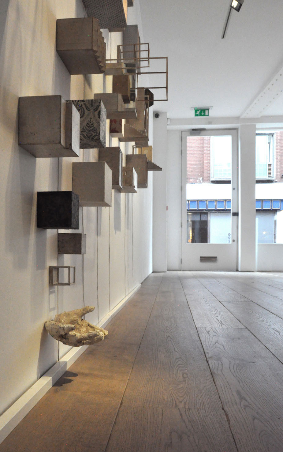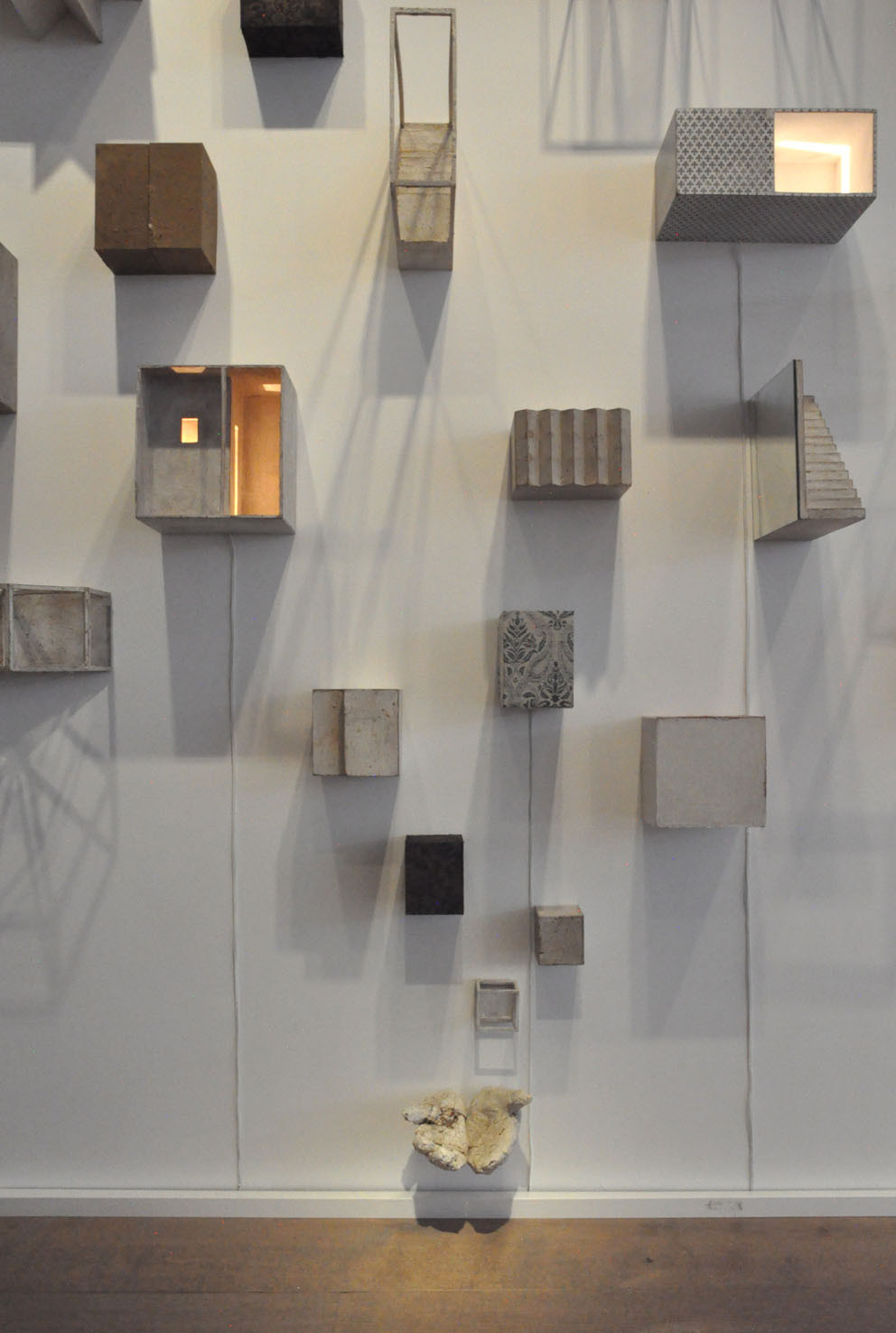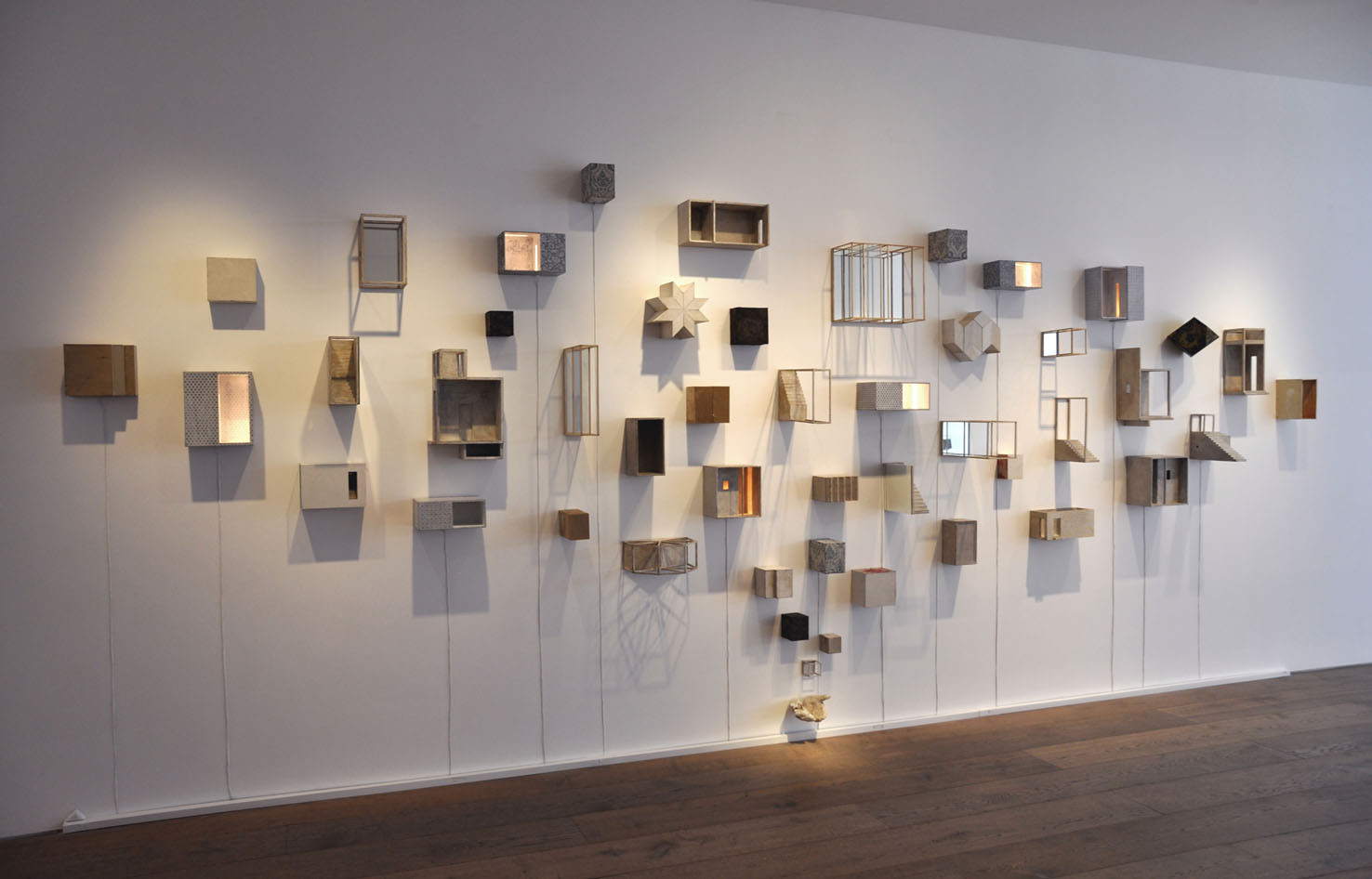 The piece Hands, a large 6 meter wall installation, is a further exploration of the Berlin based piece Icona (2010), a sound and visual installation, which featured in our Memory: Contemporary International Sculpture exhibition in 2011. To quote Paolo Cavinato’s own description, ‘The ‘universe’ I have created features many cells of varying sizes, boxes, architectural spaces and rooms, which recall both Medieval Art, Old Master Paintings (Giotto, Maso di Banco and Simone Martini), Italian Metaphysical Art, geometry, Platonic solids and Alchemy’. Memory and evocation are in a continual dialogue; each individual detail exists on its own terms but is also an integral part of the greater whole.