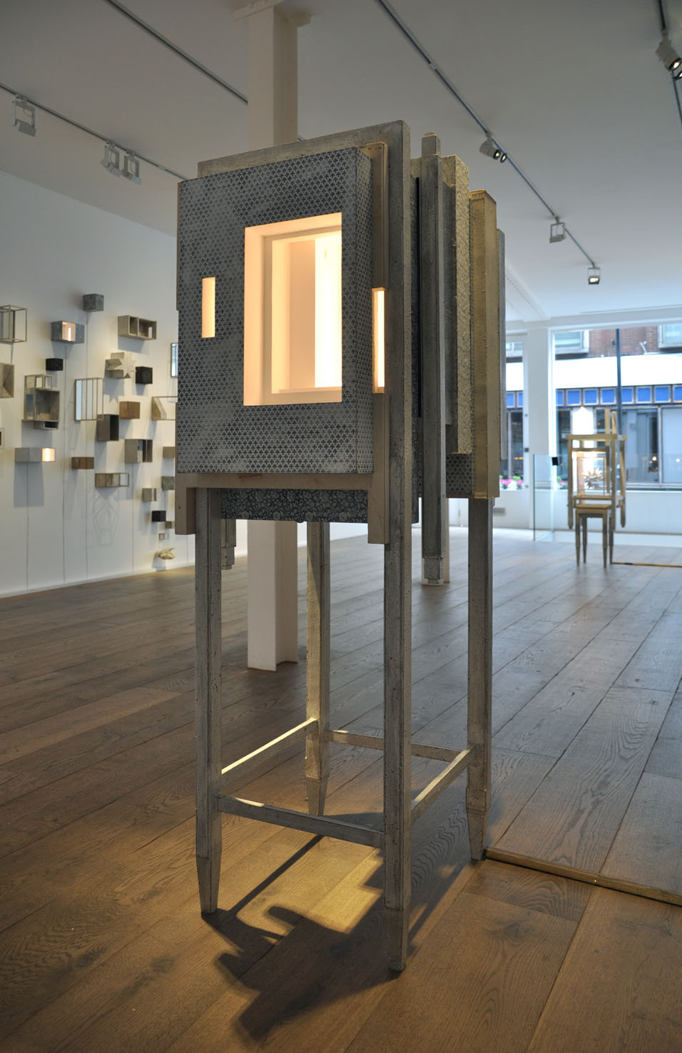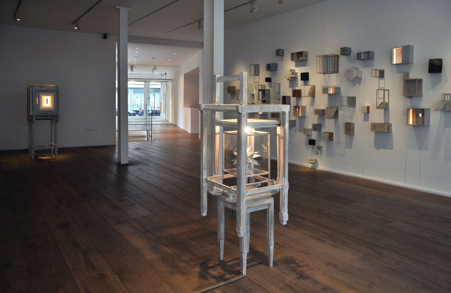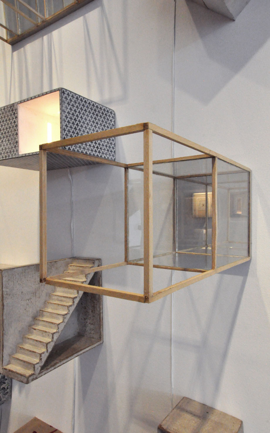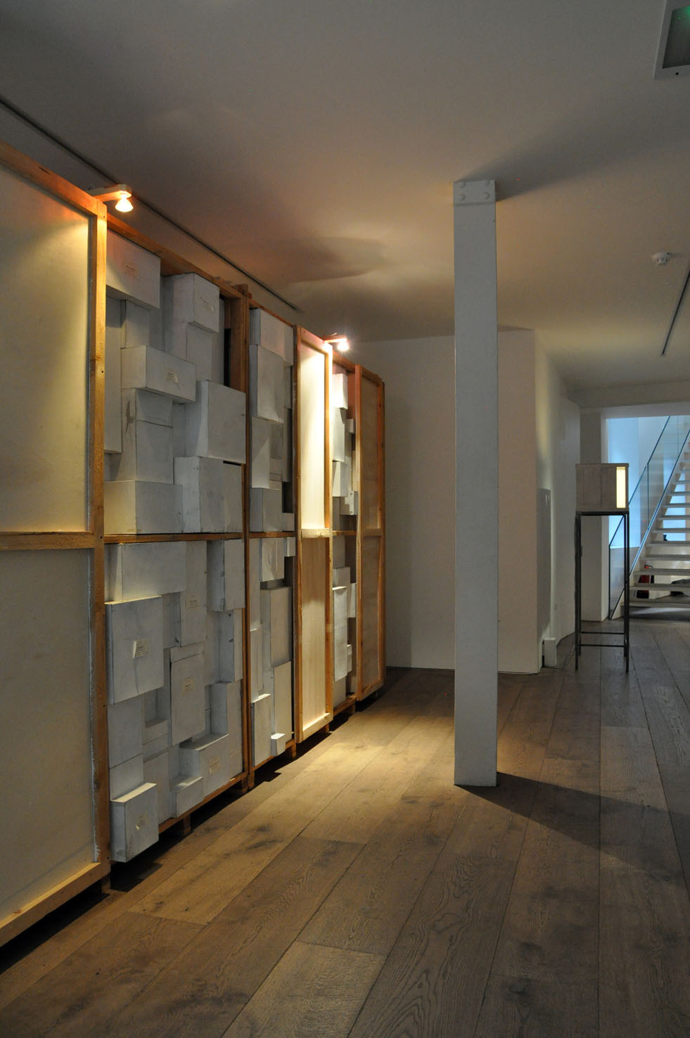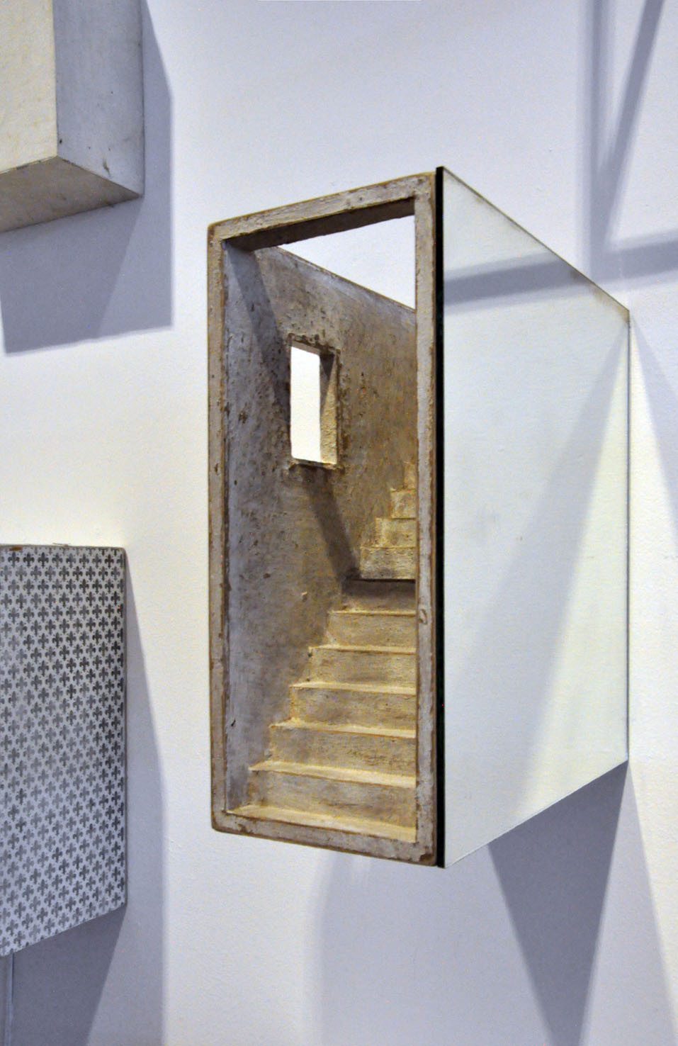 The piece Hands, a large 6 meter wall installation, is a further exploration of the Berlin based piece Icona (2010), a sound and visual installation, which featured in our Memory: Contemporary International Sculpture exhibition in 2011. To quote Paolo Cavinato’s own description, ‘The ‘universe’ I have created features many cells of varying sizes, boxes, architectural spaces and rooms, which recall both Medieval Art, Old Master Paintings (Giotto, Maso di Banco and Simone Martini), Italian Metaphysical Art, geometry, Platonic solids and Alchemy’. Memory and evocation are in a continual dialogue; each individual detail exists on its own terms but is also an integral part of the greater whole.