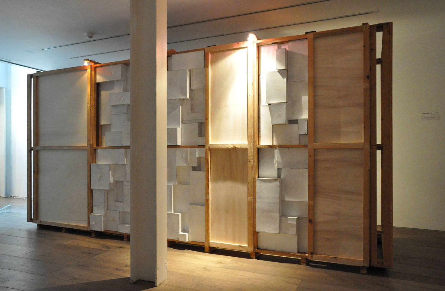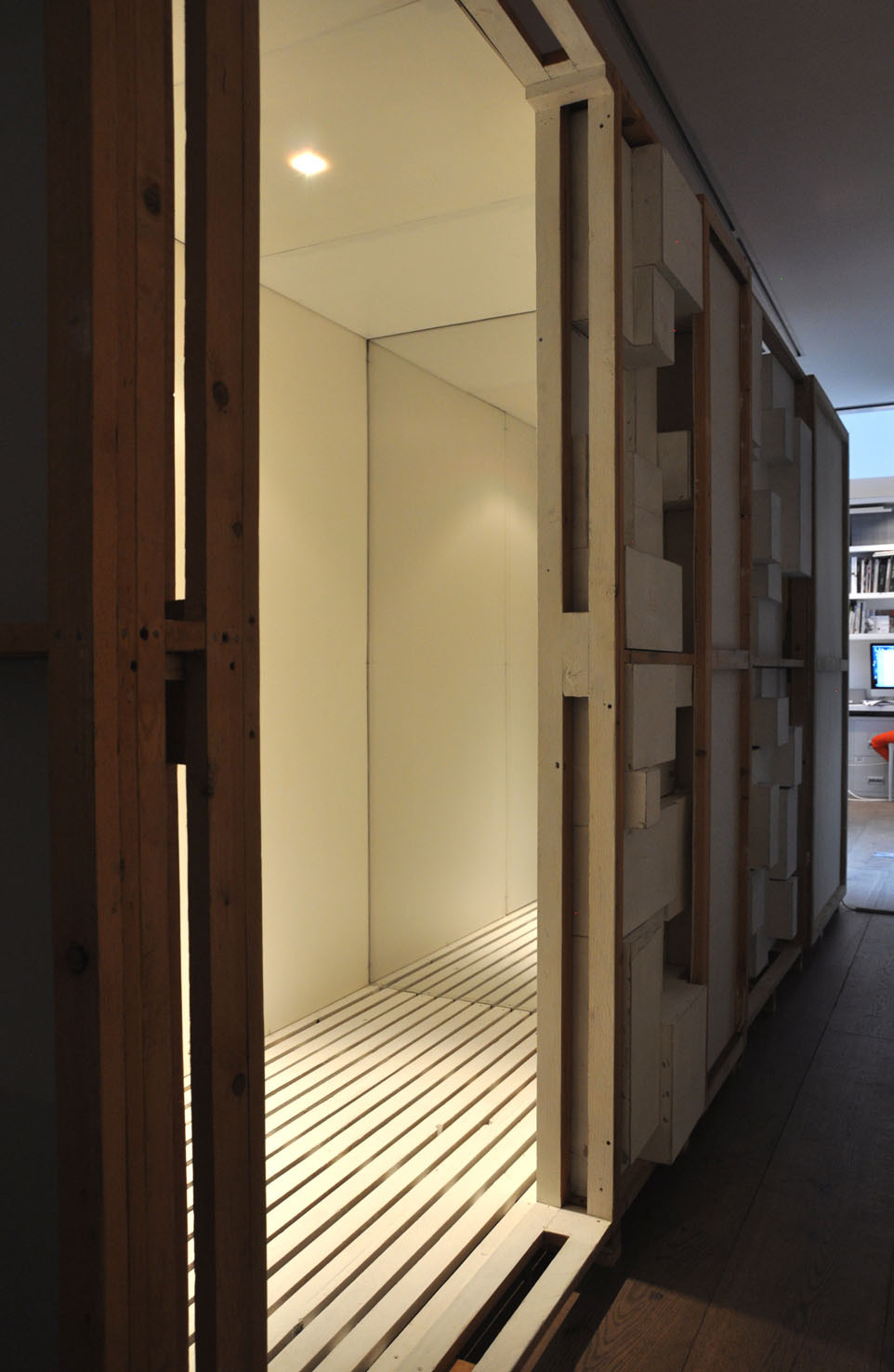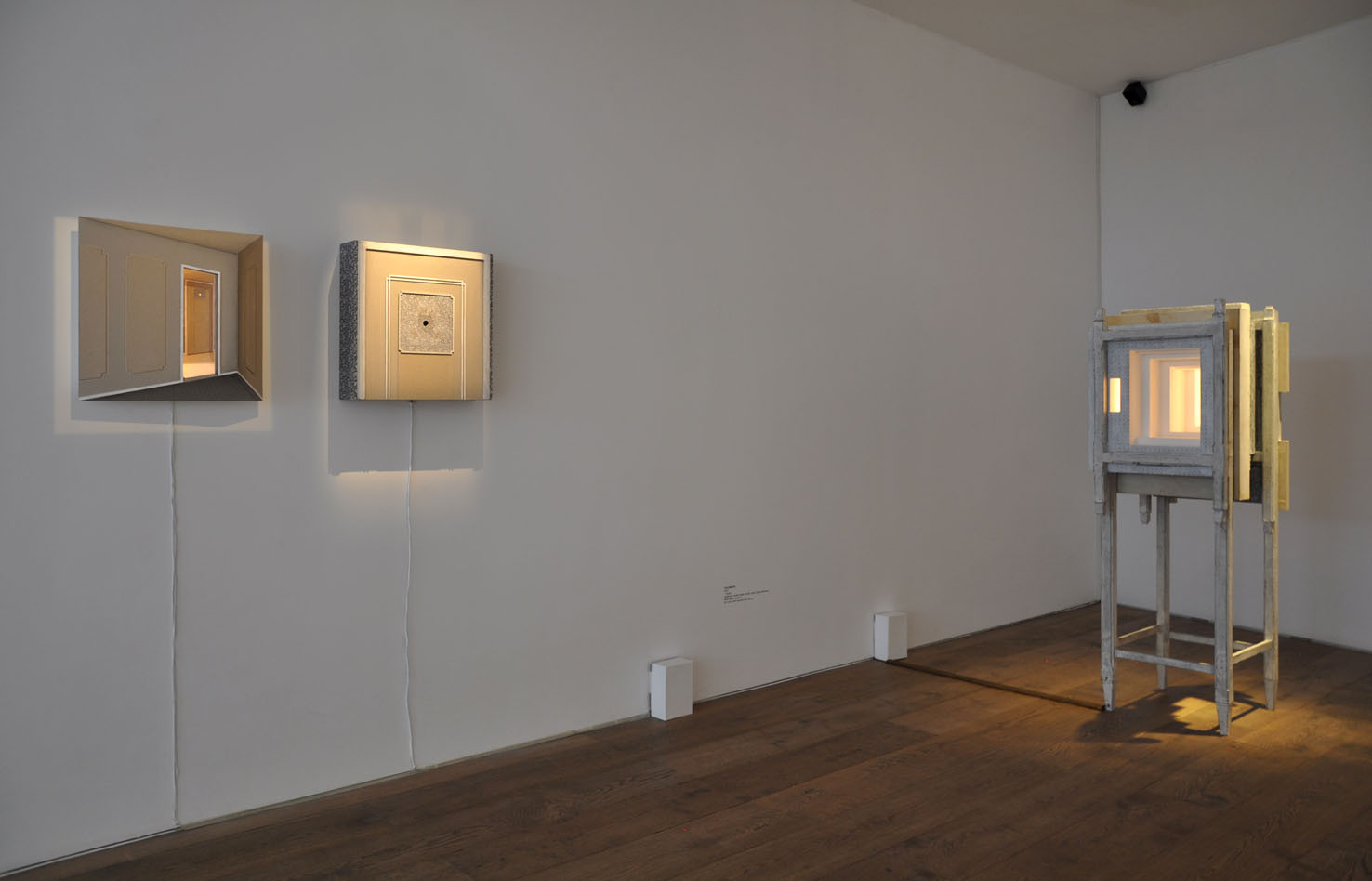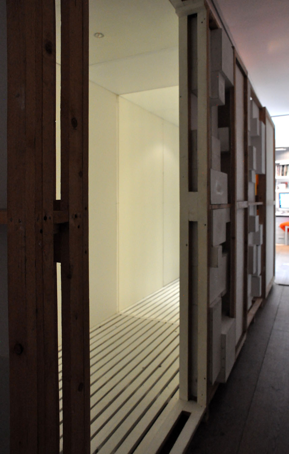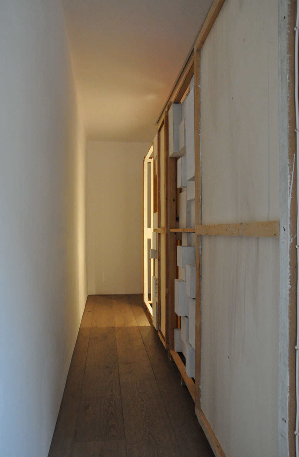 Lost, another work from this year, creates a wood labyrinth-like space where, from the outside, the spectator sees a myriad of possible corridors and thus loses any point of reference; the illusion is further exacerbated by lights, within the labyrinth, which illuminate some areas whilst others are plunged into darkness. The sound created by Trevisi will accompany the spectator both from within and outside the installation.