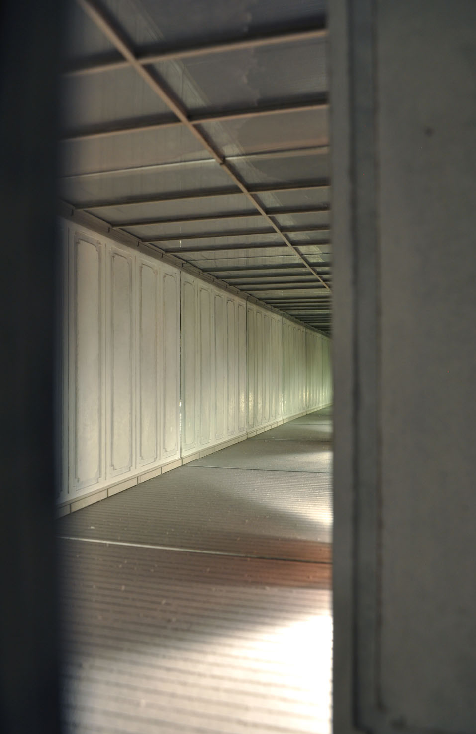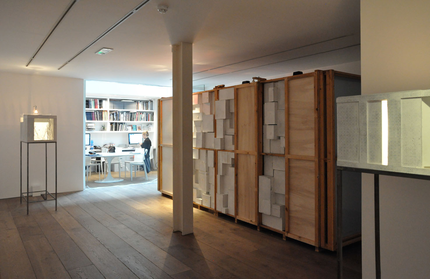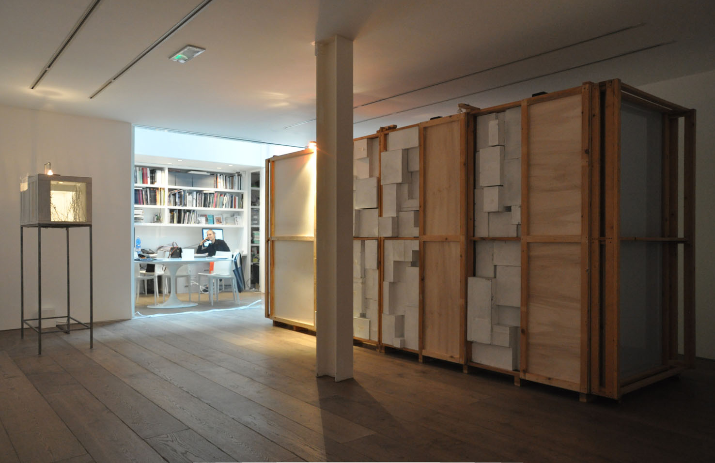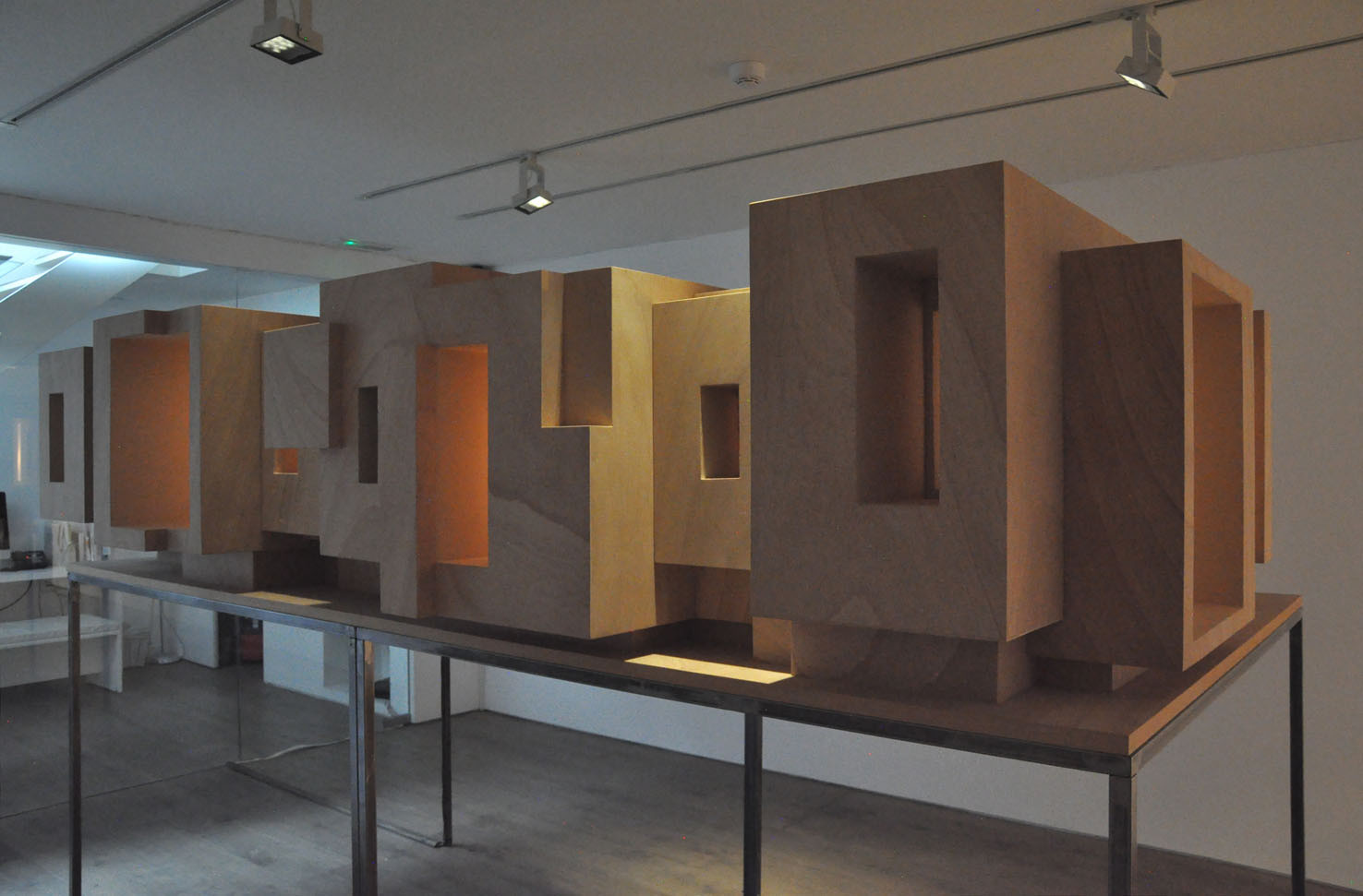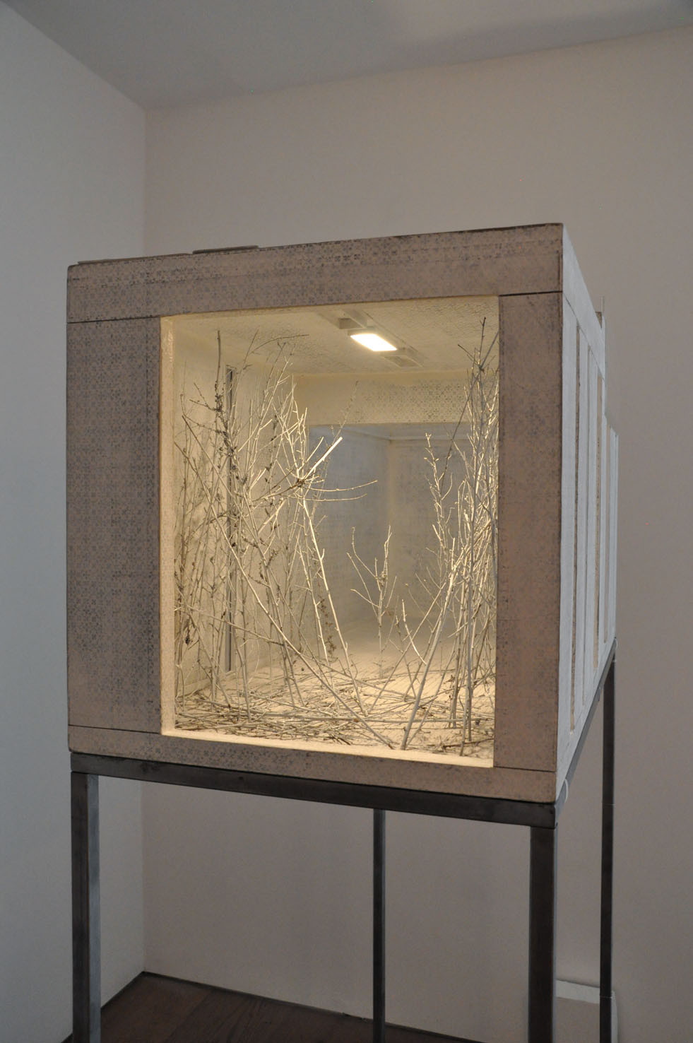 Lost, another work from this year, creates a wood labyrinth-like space where, from the outside, the spectator sees a myriad of possible corridors and thus loses any point of reference; the illusion is further exacerbated by lights, within the labyrinth, which illuminate some areas whilst others are plunged into darkness. The sound created by Trevisi will accompany the spectator both from within and outside the installation.