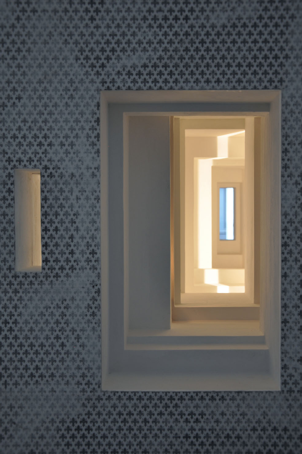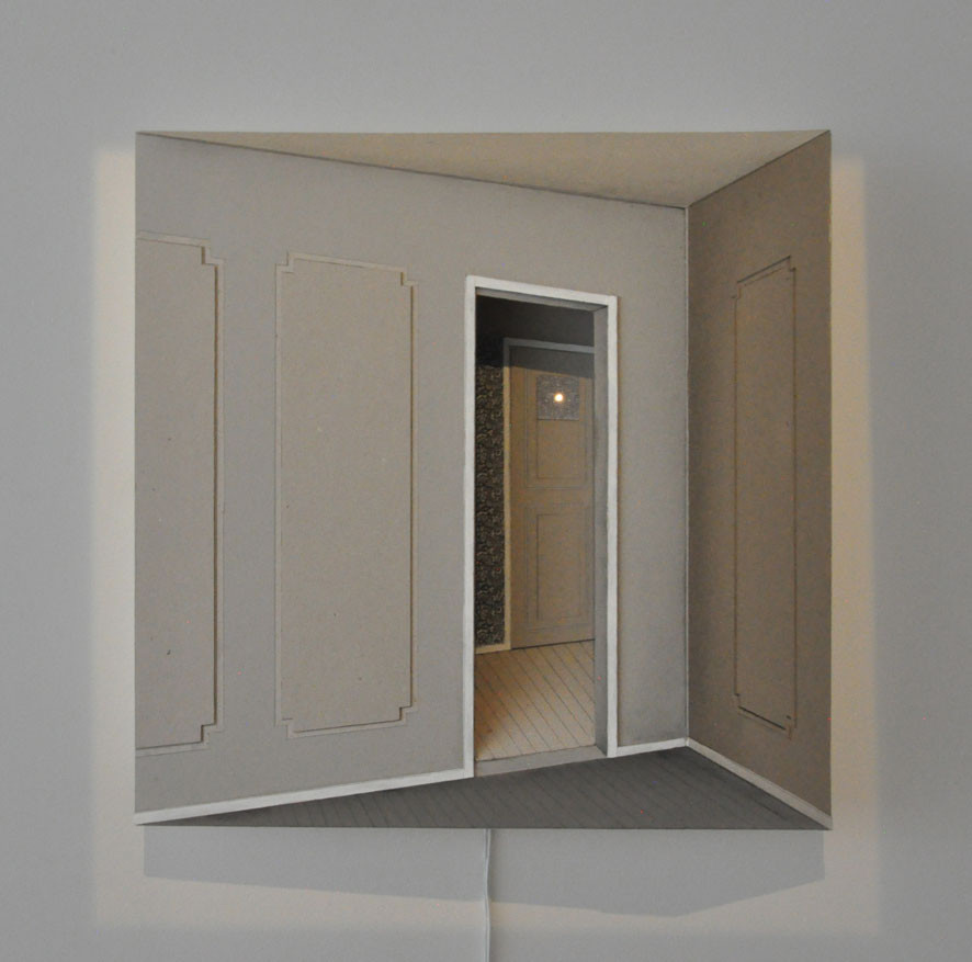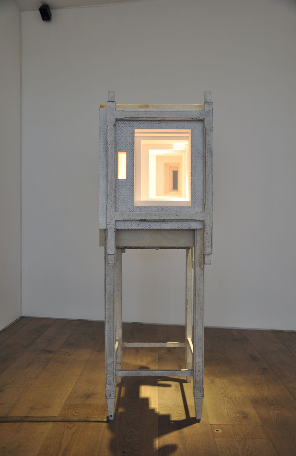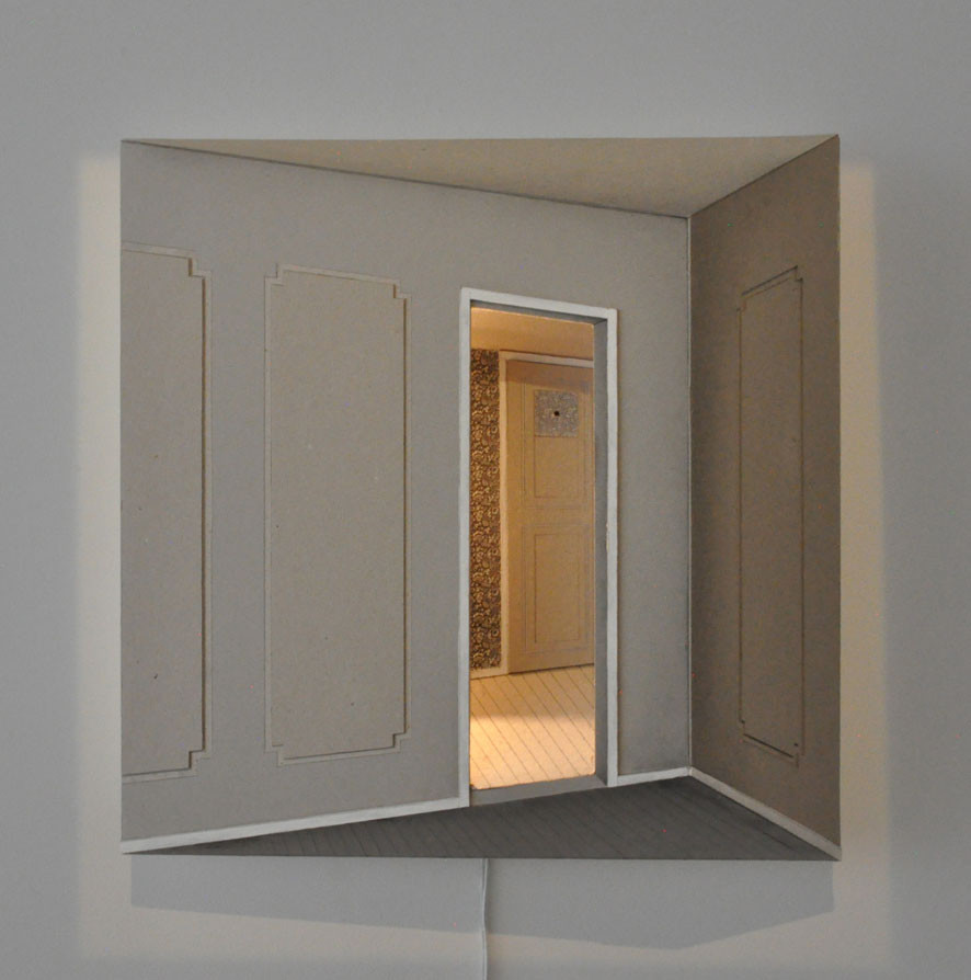 Spazio Visivo is an artistic collaboration, which combines the sound compositions of musician Stefano Trevisi within the framework of sculptor Paolo Cavinato’s installation-scapes. Lyrical yet disconcerting, their unique world is composed from photographs, mirrors, paint, faded wallpaper, wood and strange surrealistic visions of ominous corridors, reminiscent of Paolo Cavinato’s previous life as a stage designer; whether intentionally narrative or not, this visual complexity results in a deeply immersive experience with the sound composition often emanating from a variety of hidden sources. There is an innate mystery dominating the installations, which in turn is concerned with the idea of space –both real and imaginary, and time in order to achieve the duo’s ideal of an ‘absolute space’. The interplay between: Sound and vision; sound and silence; real space and imagined space is played out with great skill and intelligence.