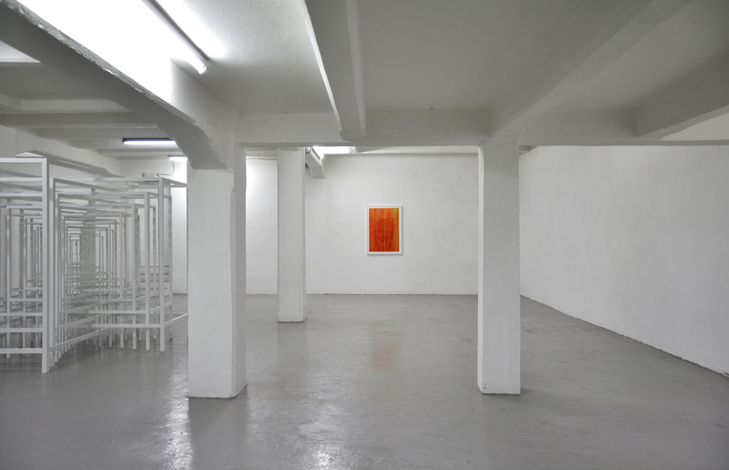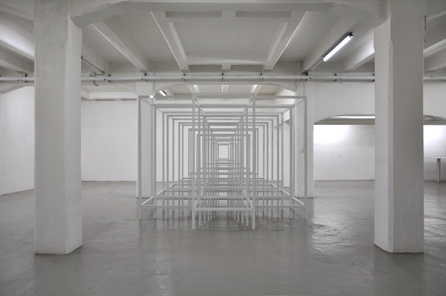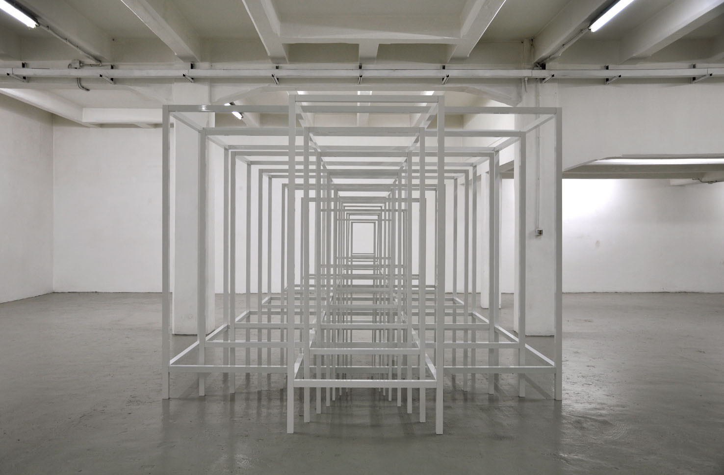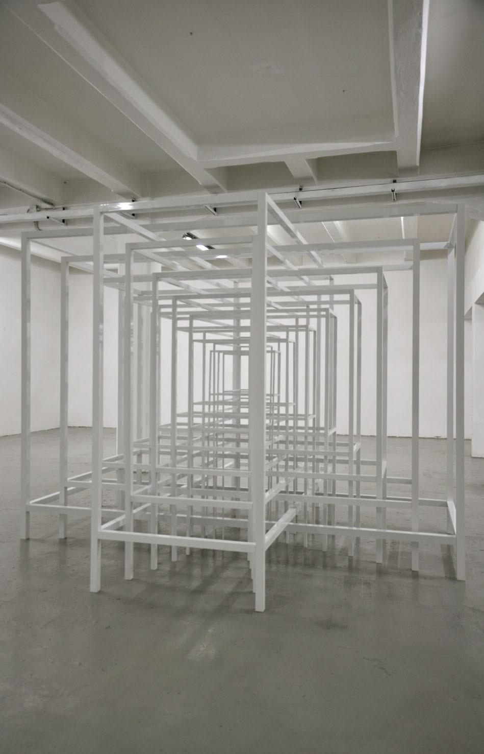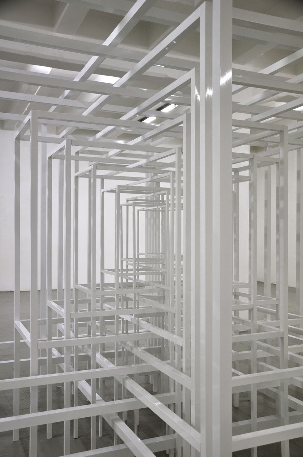 With RESONATOR, The Flat – Massimo Carasi introduces a new group of works created by Paolo Cavinato during his six-month sojourn in Shanghai. In this first chapter a series of hand carved forms cut into special paper by the artist, and a large environmental sculpture titled "Protection", are presented to the public for the first time. Here, the preceding concept of activating a physical space in the observer’s memory using a web of nylon thread is replaced by a large metal structure composed of intersecting segments, which describe a modular space and contain its original nucleus. To simultaneously occupy space and contain it, expanding the size of an object while limiting the range of its contours, are the core principles Protection. Convertible Sculpture. The sculpture adapts to the size of a habitable nucleus by confining its dimensions to the spatial limits of a room, however, when located in an open air environment, it can expand indefinitely, extending and amplifying its reach like a sonar signal. The artist’s recent stay in China – where he lived in close contact with the disconcerting architectural panorama of Shanghai – stimulated Cavinato to produce mesmerizing multi-coloured drawings and paper carvings typical of the Oriental tradition, adding a new element to his continually evolving artistic language.