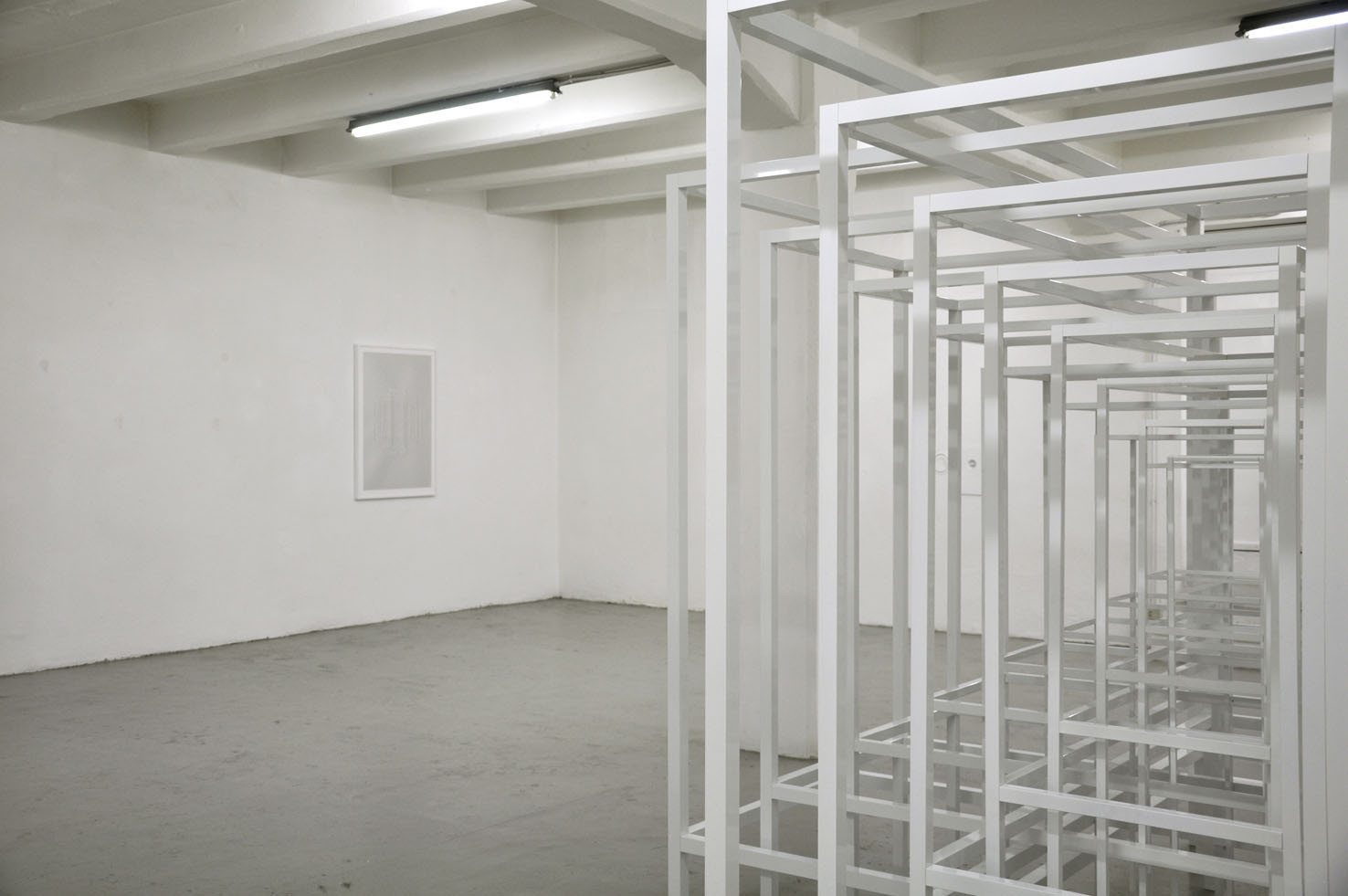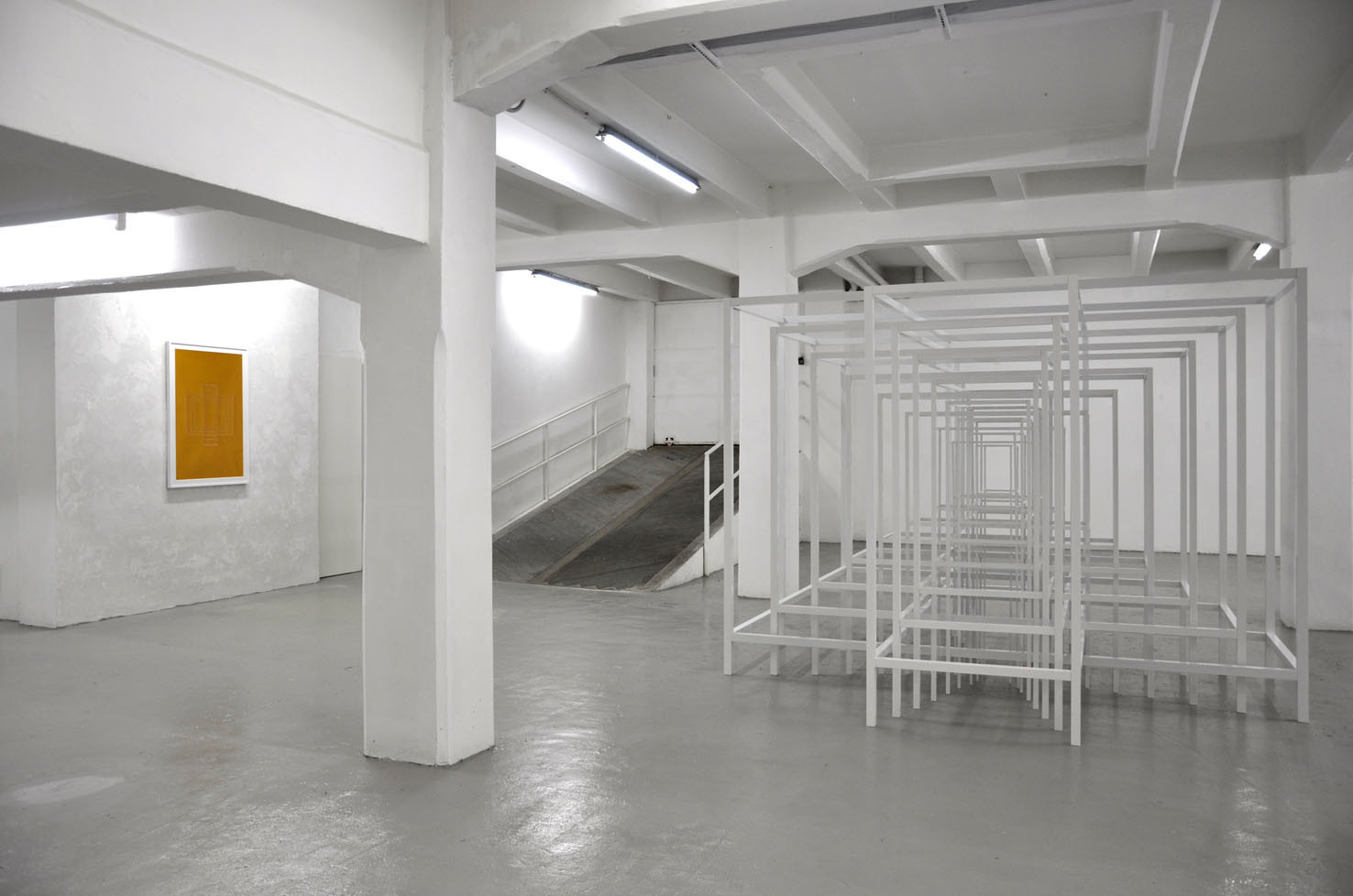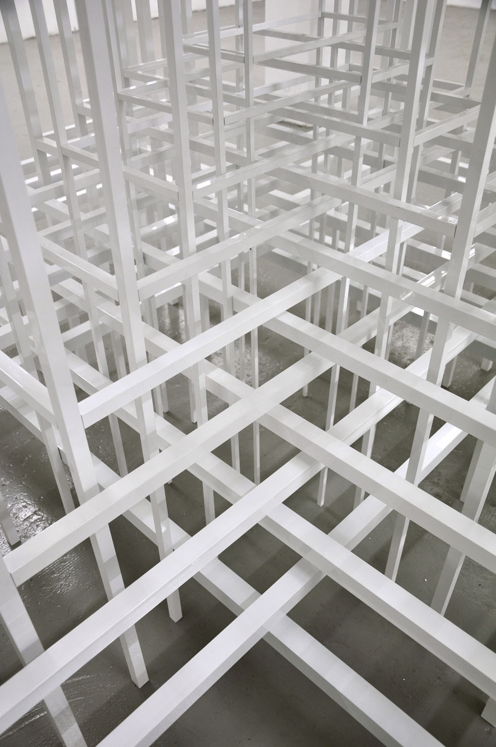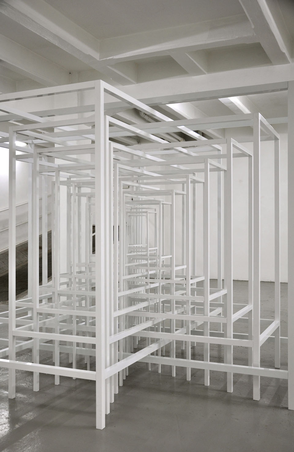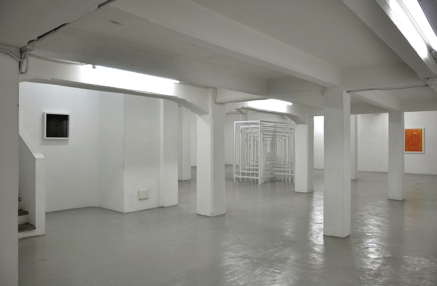 With RESONATOR, The Flat – Massimo Carasi introduces a new group of works created by Paolo Cavinato during his six-month sojourn in Shanghai. In this first chapter a series of hand carved forms cut into special paper by the artist, and a large environmental sculpture titled "Protection", are presented to the public for the first time. Here, the preceding concept of activating a physical space in the observer’s memory using a web of nylon thread is replaced by a large metal structure composed of intersecting segments, which describe a modular space and contain its original nucleus. To simultaneously occupy space and contain it, expanding the size of an object while limiting the range of its contours, are the core principles Protection. Convertible Sculpture. The sculpture adapts to the size of a habitable nucleus by confining its dimensions to the spatial limits of a room, however, when located in an open air environment, it can expand indefinitely, extending and amplifying its reach like a sonar signal. The artist’s recent stay in China – where he lived in close contact with the disconcerting architectural panorama of Shanghai – stimulated Cavinato to produce mesmerizing multi-coloured drawings and paper carvings typical of the Oriental tradition, adding a new element to his continually evolving artistic language.