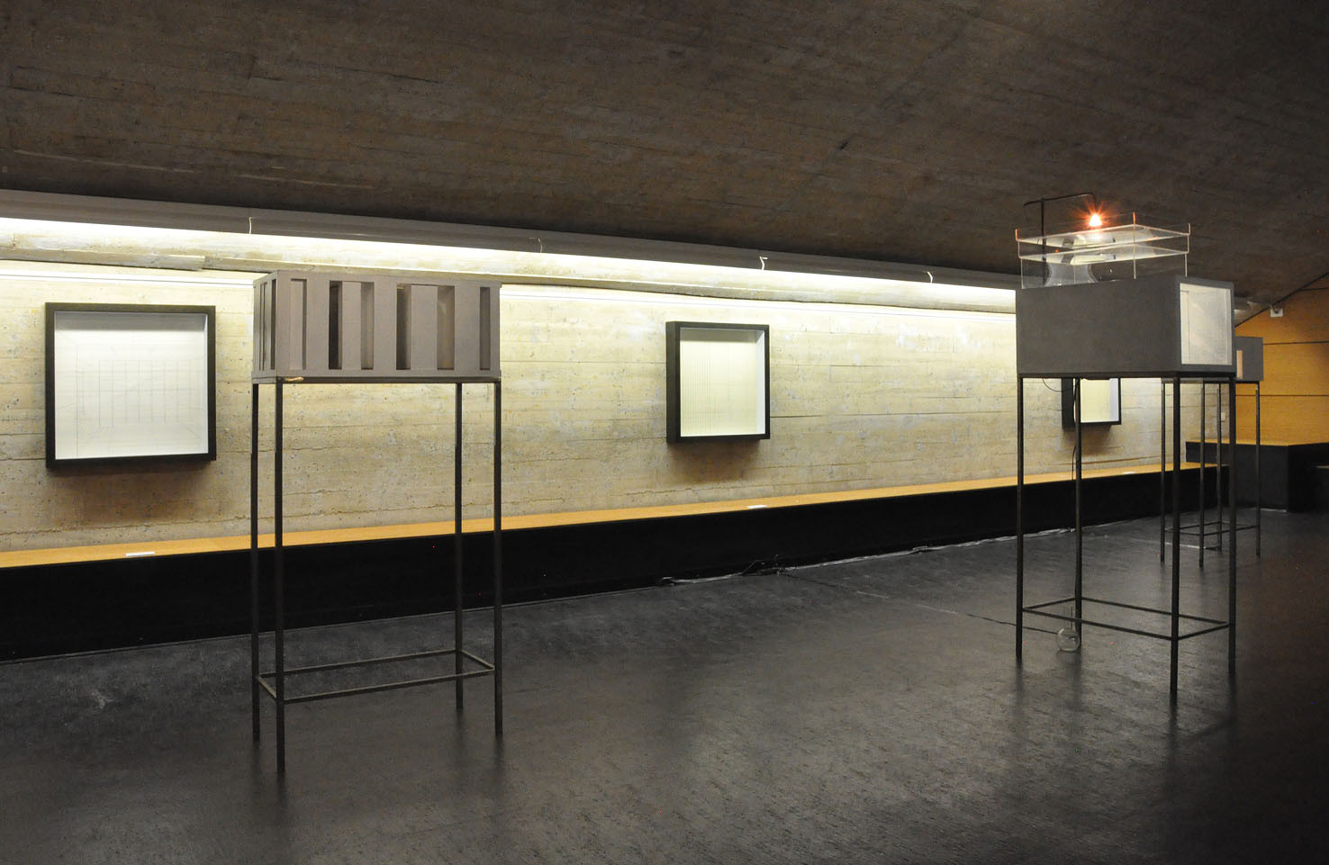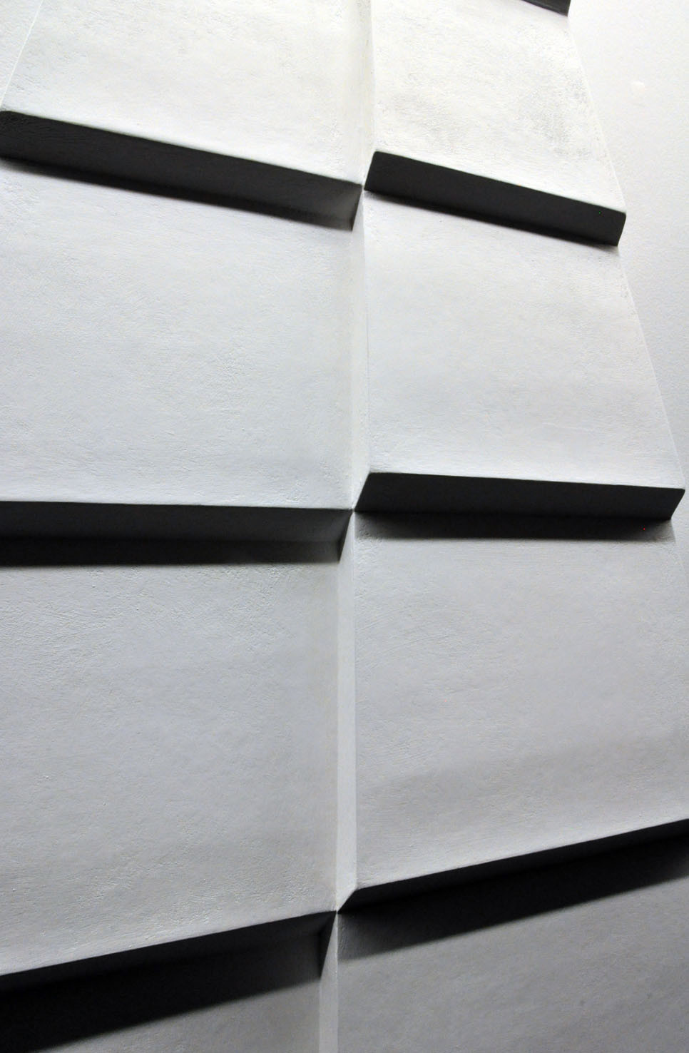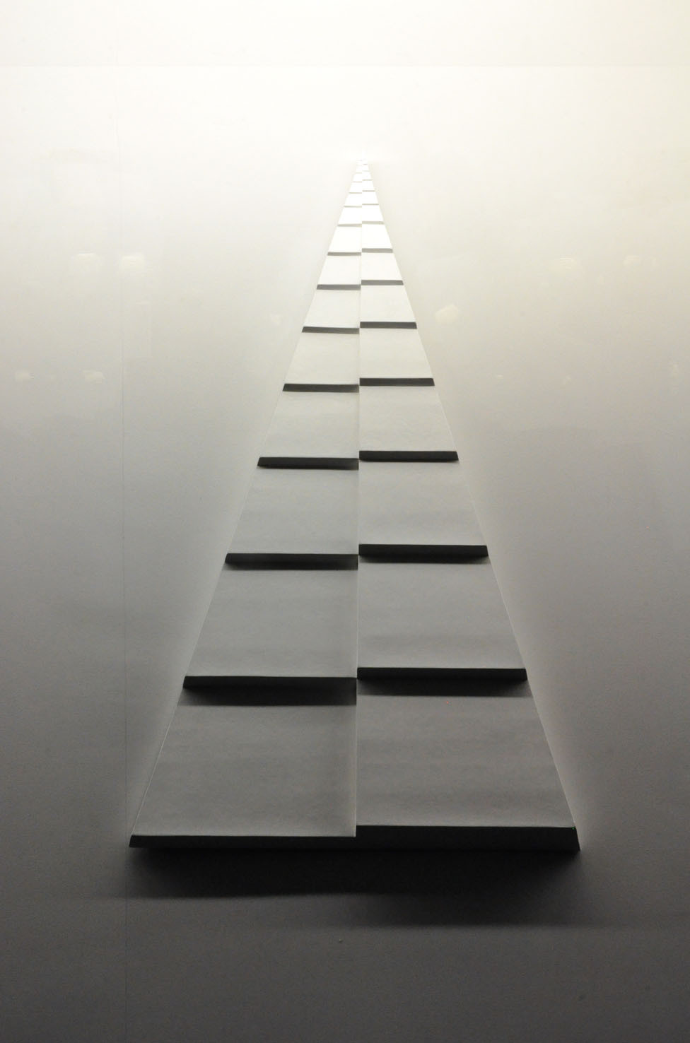 In the works on the wall such as Libration, a perspective drawing breaks down the distinction between the literal geometric illusion and the continuation of the lines on the other side of the surface. The work Via, a path in relief which illusory three-dimensionality is suggested by the shape, and also by a surface which invites to walking, immediately recalls the experience.
