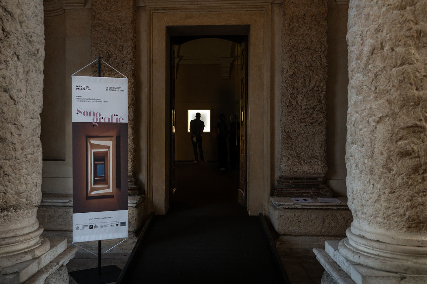 The exhibition designed for the spaces of the Sala dei Tinelli of Palazzo Te offers the viewer an amplified and multisensory aesthetic experience: welcomed in a dimly lit space, already from the threshold, we are attracted by luminous elements and captured by sounds that magically emerge both from the works on the wall and from the installations on the ground.