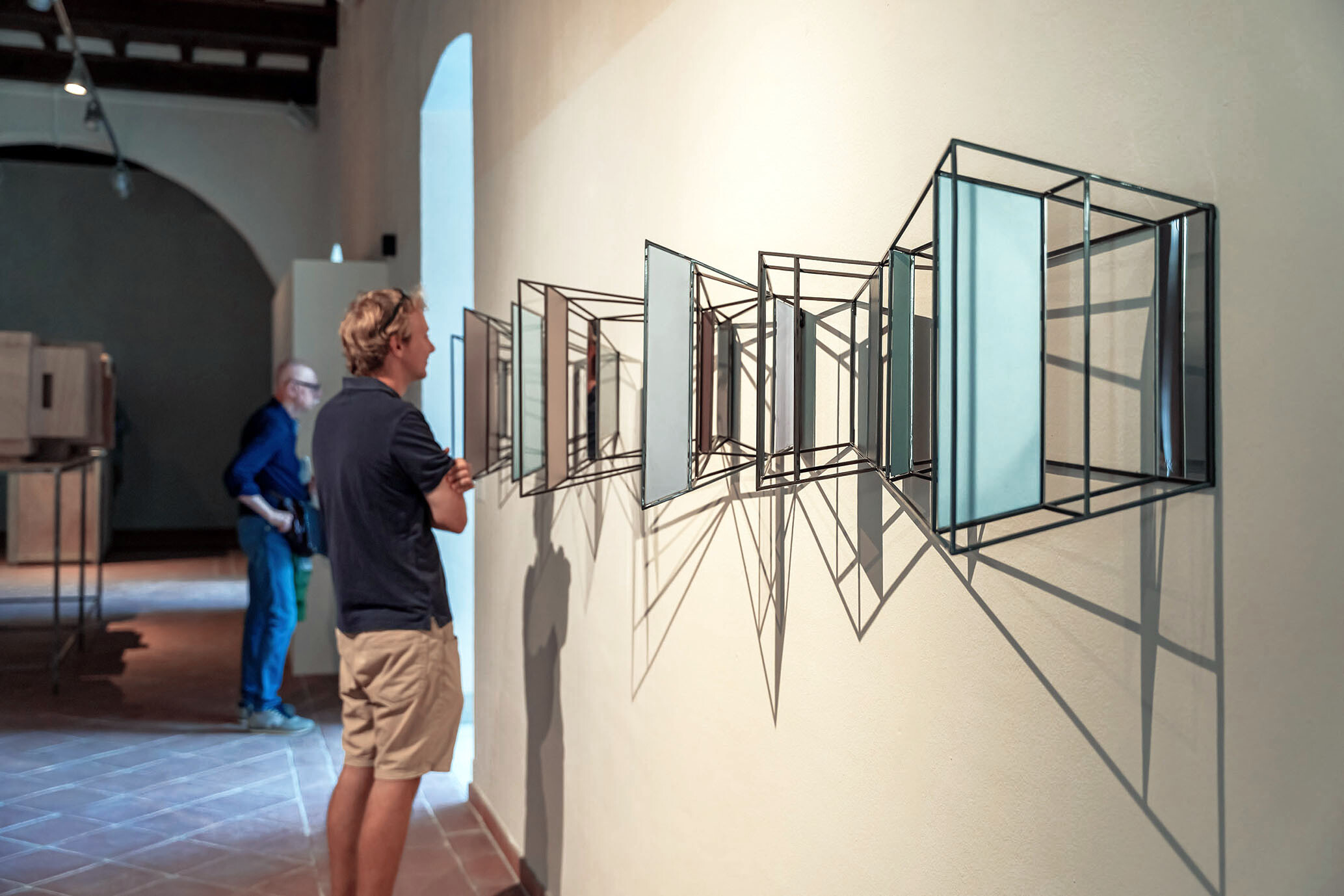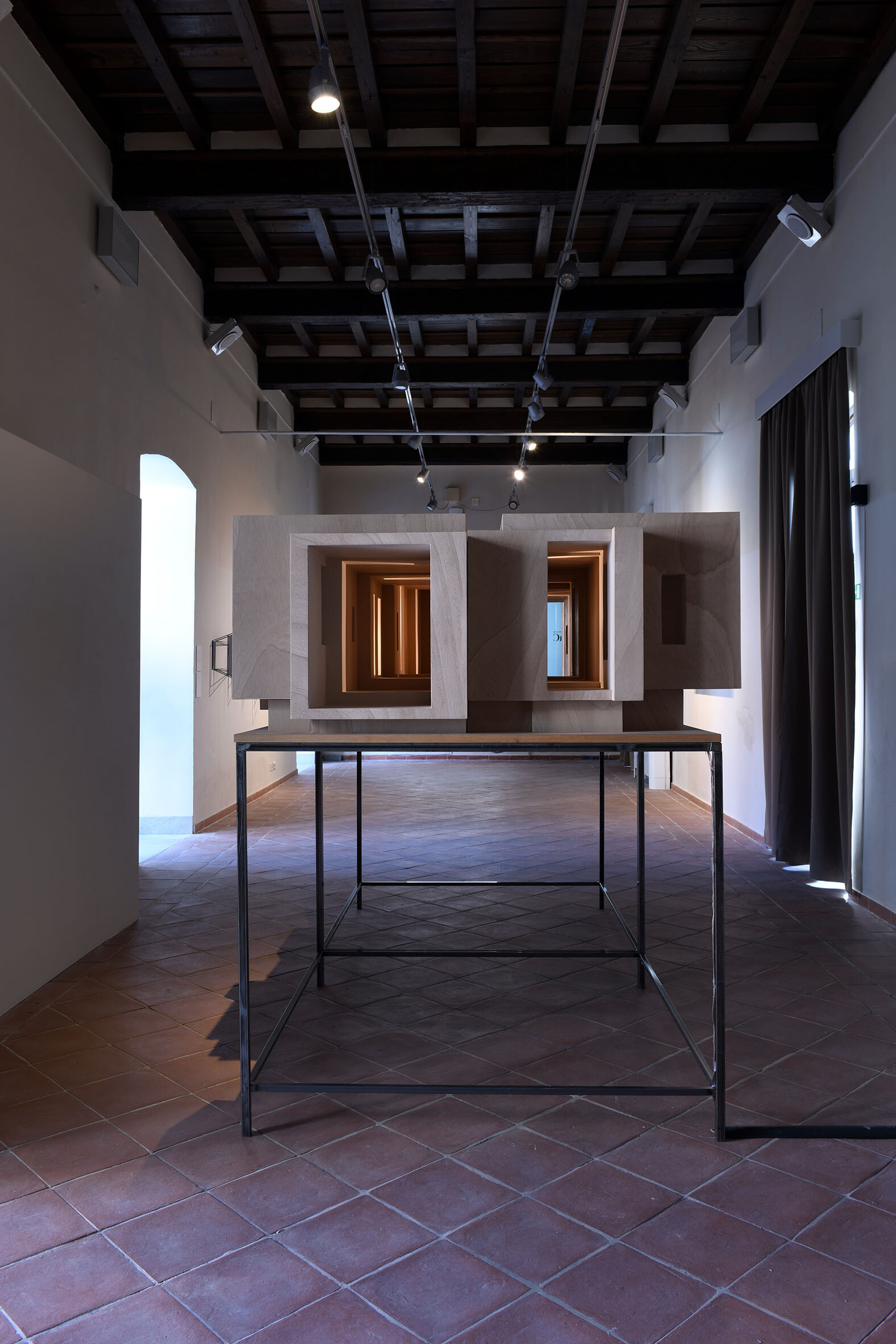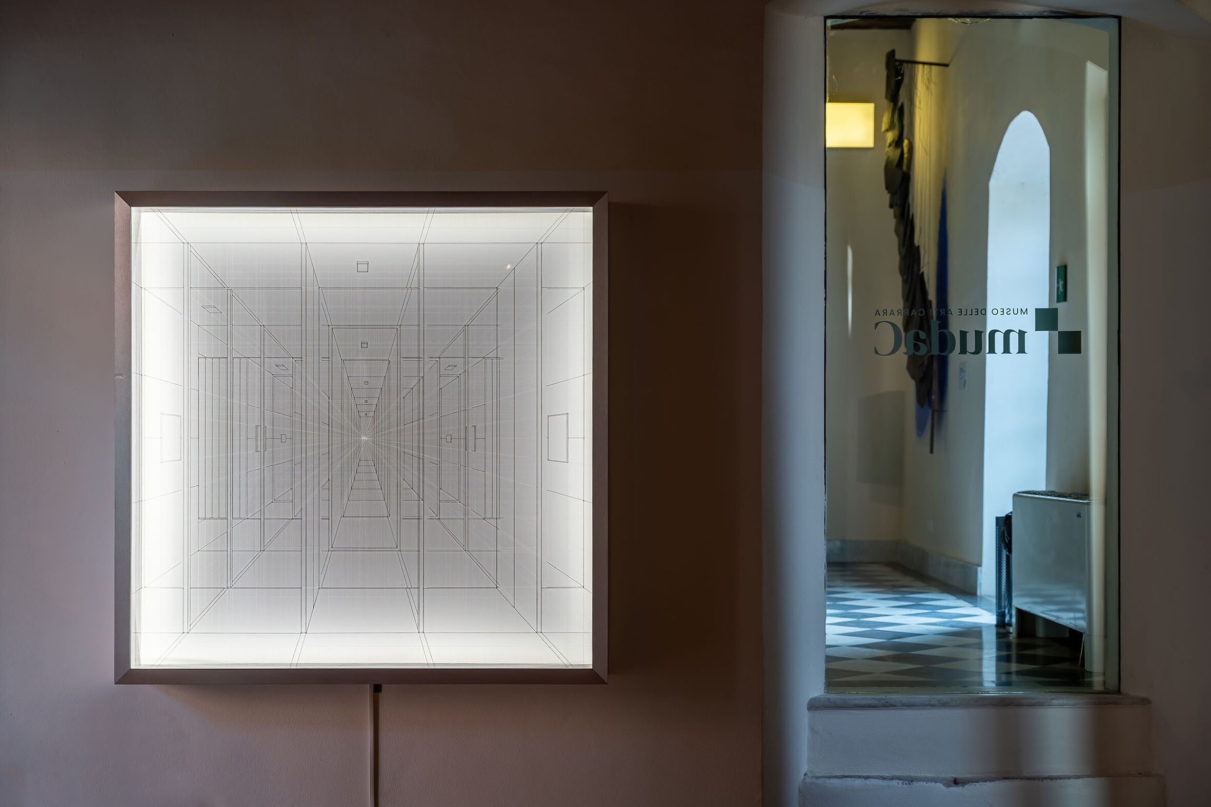 Using a maieutic approach, Cavinato seems to straighten out the lines of that labyrinth and offer us a pre-ordered world in which the artist has had the role of demiurge. Via works from museums and recent works including Solaris#5 produced site-specifically for the mudaC, the exhibition offers the opportunity to enter directly in contact with the artist’s production, allowing space for new visions, thresholds, limits and perspectives. The museum itself (housed in a 17th-century convent with a cloister in the centre which acts as its fulcrum) becomes a place for experimentation, a space for the coming together of the unreal, the perceived and the improbable, transforming or evolving the common concept of reality, accompanying us on the discovery of an inner world in which, once the chaos has been ordered, we feel at home. Really. The works conjoin empty and filled, accessible or illusory spaces, geometric or anthropised forms. Cavinato avoids categorisation, finding his expression in a unique visual language which combines painting, sculpture, photography, architecture, set-design and music. Paolo explores space and time, the inner and the outer stimulating us to investigate the limits and potential of our relationship with the world around us, and to increase our awareness of antithetic themes such as body and mind, nature and artifice. His installations provoke wonder and disquiet, shedding doubt on every certainty and spurring us on to face up to complexity.
