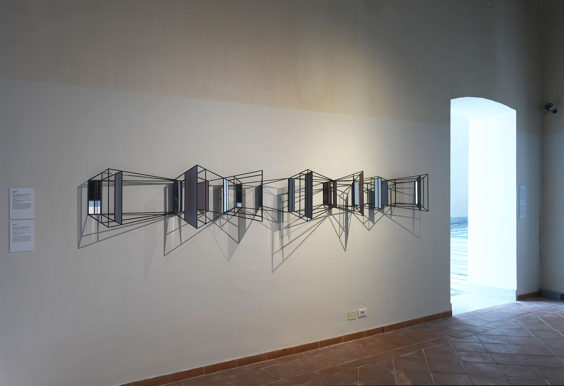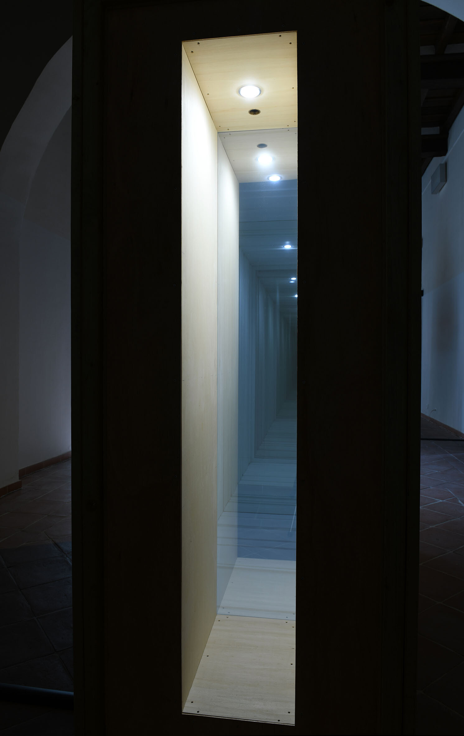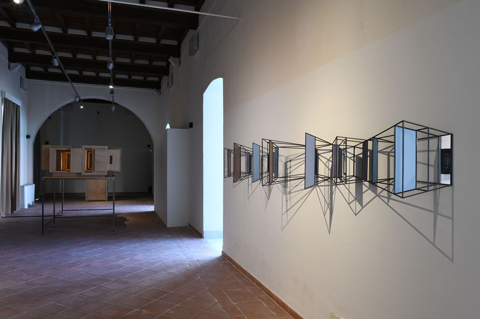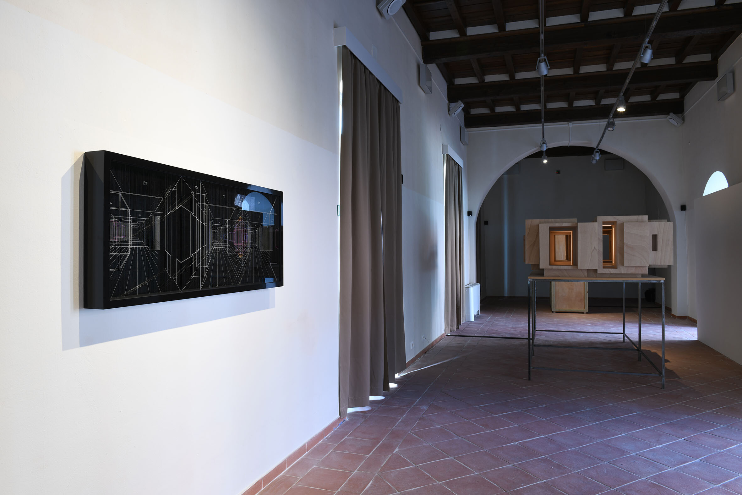 In recent years Paolo Cavinato's artistic research has developed through various disciplines, using techniques and languages of art: photography, drawings, graphic elaborations, large installations, sculptural objects. The characteristic elements regarding perspective, empty space, points of view and the relationship between finite and infinite recur as main milestones. Some of his works, designed and created in relation to the surrounding space, are complex constructions of visual and sound elements, in which the public can enjoy the interior. Sculptural elements, sounds and vocal performances, fused together to form a complex immersive experience of space. The artist is always attracted by the intrinsic possibilities of human thought, for its uniqueness and distinction. Just as the "different" gaze becomes active and critical, the installations aim to offer different angles and observation points, starting from themselves to go to a possible elsewhere, in a continuous exchange between inside and outside.