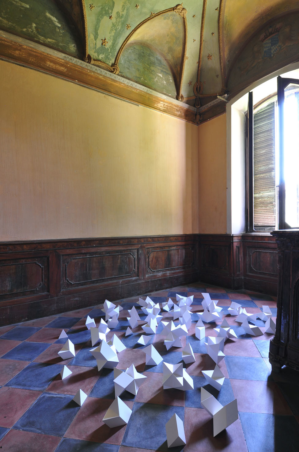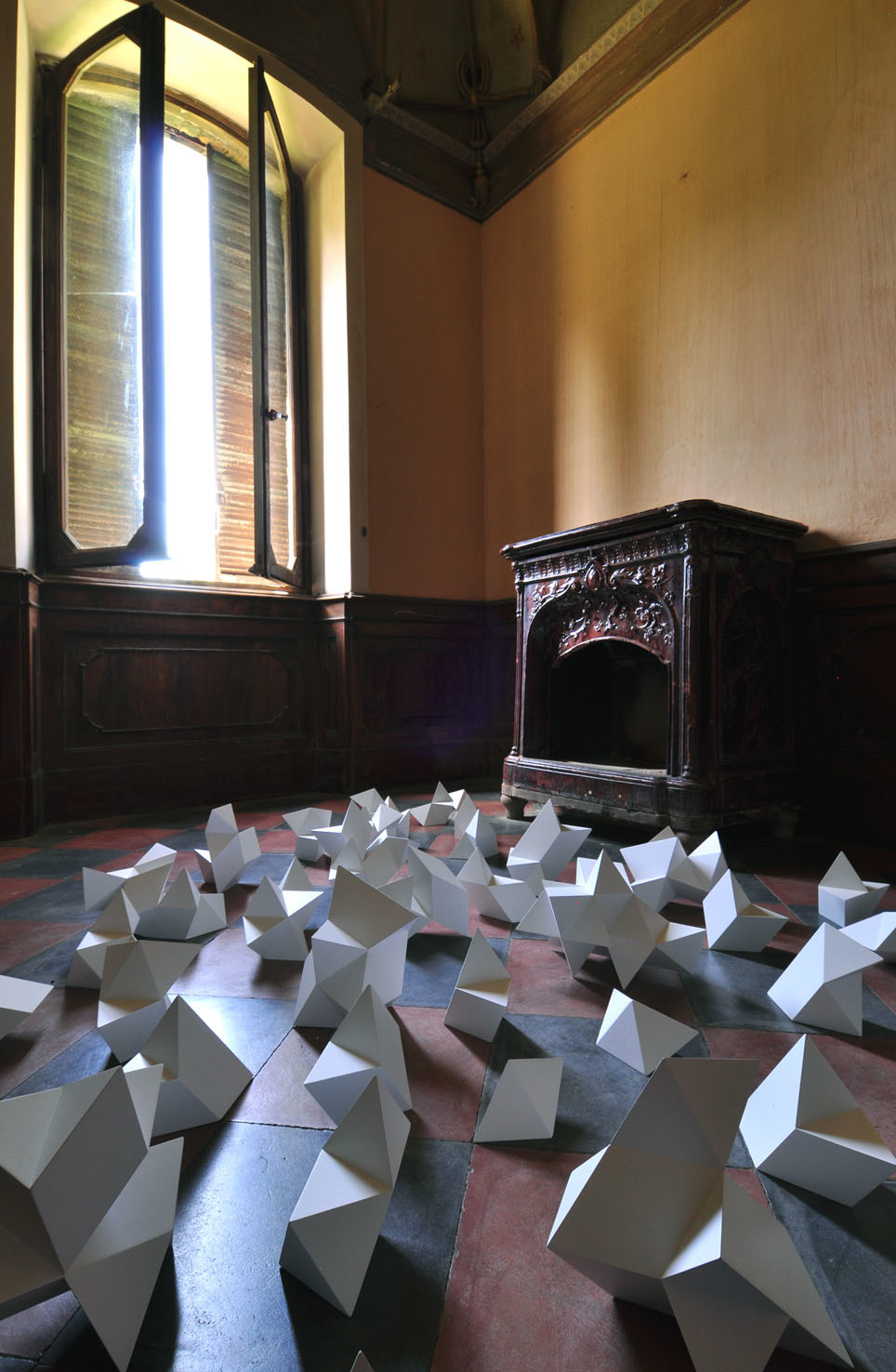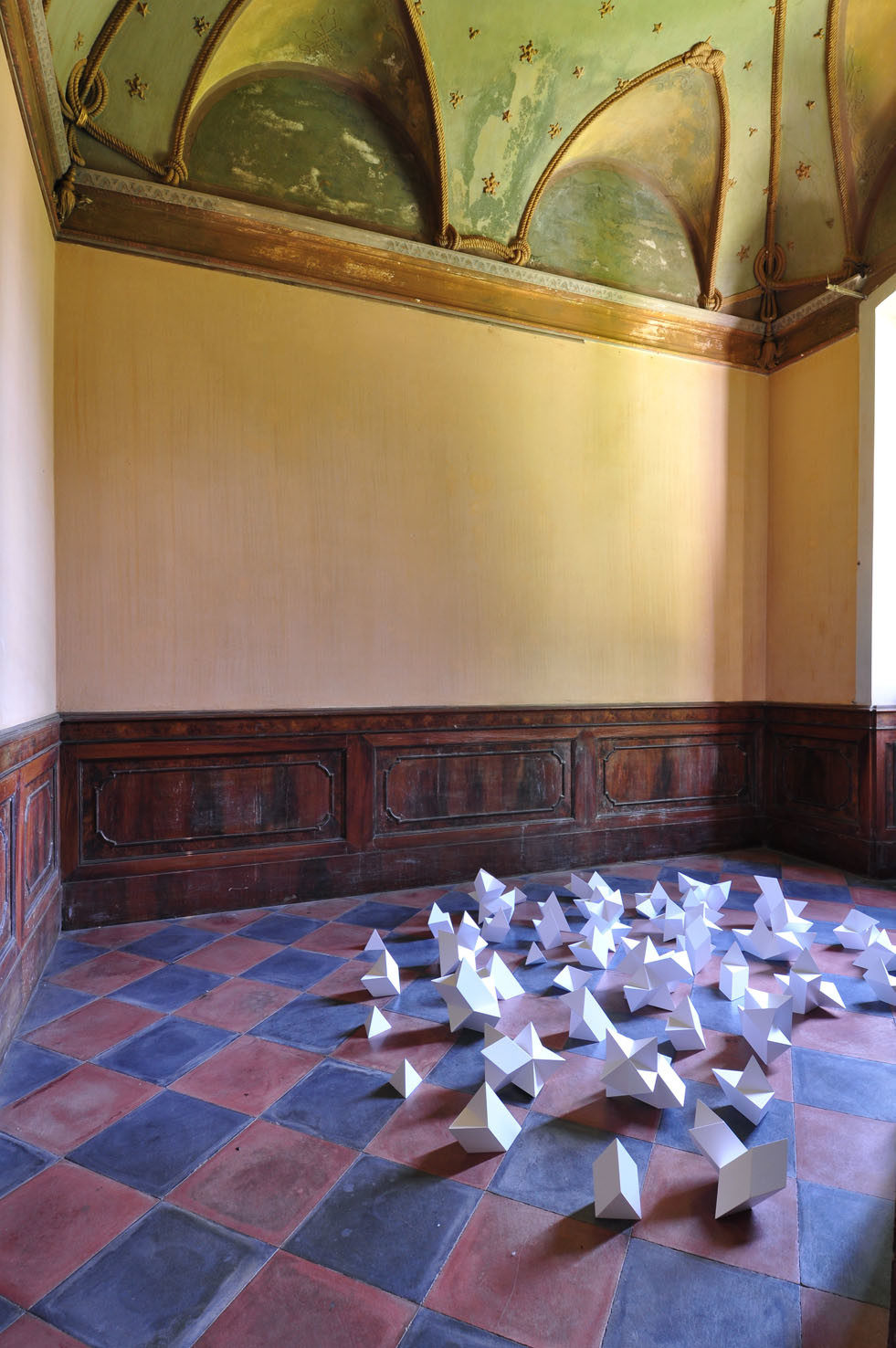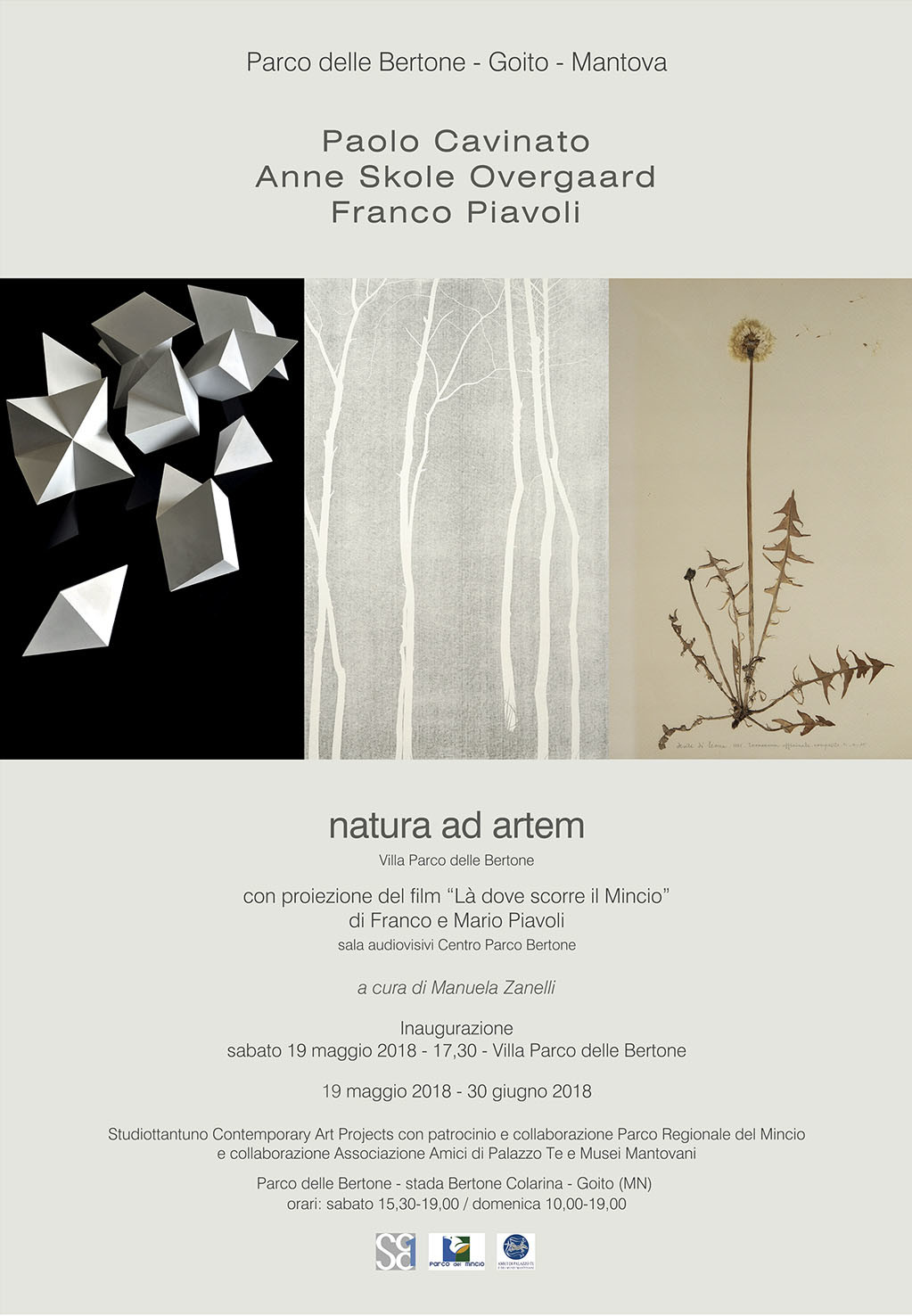 La mostra d’arte contemporanea proposta negli interni della Villa del Parco delle Bertone intende richiamarsi alla storia del luogo, che è passato nei secoli dalla presenza dell’originaria foresta planiziale con la sua spontanea e fitta vegetazione, all’addomesticamento della natura con la costruzione delle case coloniche e le loro coltivazioni agricole, fino alla costruzione della dimora nobiliare, con il passaggio dal bosco al giardino romantico voluto dai proprietari conti D’Arco nell’800. Proprio questo percorso nel tempo del contesto paesaggistico ha ispirato il titolo della mostra “Natura ad artem”. Paolo Cavinato, Anne Skole Overgaard e Franco Piavoli, ci riportano infatti con evocazioni e rimandi mentali ai tempi in cui il sito della dimora stessa era foresta, interpretando dunque il luogo primariamente come luogo della natura e delle sue trasformazioni e stabilendo una sorta di virtuale e immaginaria continuità tra gli esterni e gli interni. Le stanze per questo accolgono opere che sia con il lavoro site-specific pensato da Paolo Cavinato, sia con l’installazione di Anne Skole e l’esposizione delle opere-erbario di Franco Piavoli sono inserite in modo quasi necessario nell’intenzionalità emergente di riferirsi alla natura non solo come centralità tematica, perché cifra connotativa del posto, ma anche di rileggerla concettualmente riferendosi ai suoi principi costitutivi. Proprio sul richiamo di questi ultimi, si costruisce così una sorta di ideale percorso di circolarità simbolica: origine, crescita e morte-rinascita cui le opere nella loro intrinseca struttura di tecnica, di linguaggio, di progetto artistico alludono, aprendo diversi livelli di significato in più percorsi di possibile lettura in cui giocano fattori di memoria, evocazione e riferimenti colti. L’artista danese Anne Skole ci coinvolge con una tecnica tradizionale dei paesi nordici. Le sue incisioni xilografiche di rami e tronchi d’albero con stampe in positivo su leggere carte scendono dal soffitto a coprire le pareti di una delle prime due sale, alludendo alla presenza della foresta di un tempo in luogo della dimora, mentre nella seconda sala, come a specchio della prima, espone le stesse matrici al nero incise su legno. Ci sembra di poter dire che dall’idea di matrice si possa trarre il concetto di origine, di nascita riferibile alla natura stessa anche come inizio di quell’ideale percorso mentale, sotterraneamente allusivo, che va oltre all’idea della foresta storica cui si riferisce. A prevalere nel suo lavoro è soprattutto una dimensione temporale nel passaggio dalla matrice alle varie fasi delle sue stampe multiple fino a quelle al chiaro che ci presenta. Paolo Cavinato invece, artista mantovano attivo anche all’estero, costruisce tridimensionalmente a terra una sorta di “giardino” di forme astratte, seguendo la sua poetica legata al rigore della geometria dello spazio, questa volta applicata alla geometria dei frattali. L’elemento naturale viene richiamato nel concetto di crescita, nella “germinazione” di forme che da un semplice modulo si ripetono e si collegano, aggregandosi secondo un ipotetico ordine ma non di univoca percezione. I volumi astratti, espandendosi fino quasi a coprire a tappeto il pavimento dello spazio espositivo pongono, giocando sulla dimensione spaziale, l’accento sull’idea di sviluppo della natura nel riferimento traslato alla foresta, intesa come luogo dell’indistinto verso la separazione, l’individuazione di parti e di un ordine delle stesse. L’altra opera “Germoglio”, una leggera e quasi grafica scultura del vuoto di ascendenza costruttivista, allude sempre al principio di una geometria della natura ma forse anche ad un sotteso ordine cosmico regolatore, come altra faccia della medaglia del caos iniziale primigenio e insieme ci riporta all’idea di trasformazione alchemica. Se all’emergere dalla materia nera informe come terra sembra simbolicamente alludere il bianco delle strutture-oggetto, all’elemento acqua si riferisce la scura superficie dello specchio, simbolo di un profondo indistinto contraltare al razionale della forma che vi si specchia, ma soprattutto topos dell’elemento di vita e dunque di nuovo di un principio generatore. In un’altra tappa di un un altro “viaggio”, quello nella storia del luogo, l’opera nel suo complesso rappresenterebbe l’ideale giardino contrapposto al bosco. Franco Piavoli, noto regista cinematografico, espone una parte del suo erbario “artistico” in cui curiosità scientifica e creazione estetica si legano in un efficace connubio. Elementi minori della vegetazione come piccoli rami e foglie di erbe essiccate e con molta cura conservate intatte dalle radici alle piccole chiome, sottratte al ciclo naturale e bloccate nel tempo, sembrano esprimere il principio di una fine stessa della natura. Esse diventano l’emblema di una trasmutazione nella loro essenza, di una rigenerazione superiore che è poi alla fine quella dell’arte stessa, quella che conferisce loro il gesto fondamentale dell’artista che le preleva, le sposta anche da un ideale contesto scientifico, le indica e mettendole in cornice le assume nella dimensione estetica, le fa diventare ideali “nature morte” fissate nel tempo “assoluto” dell’arte. Nel loro aspetto quasi grafico-pittorico richiamano in modo scarno e minimale il mondo della vegetazione circostante nella parte meno spettacolare ma altrettanto significativa di tale contesto. Con esse si fa anche un passo allusivo nella storia, richiamando l’interesse del grande naturalista quale fu il padrone di casa Carlo D’Arco, con i suoi studi scientifici sulla natura e gli interventi concreti. Oltre infatti alla piantagione nel suo giardino di rare specie arboree secolari, realizzò un prezioso erbario custodito nel palazzo di città. La proiezione infine del cortometraggio “Là dove scorre il Mincio”, realizzato da Franco e Mario Pia