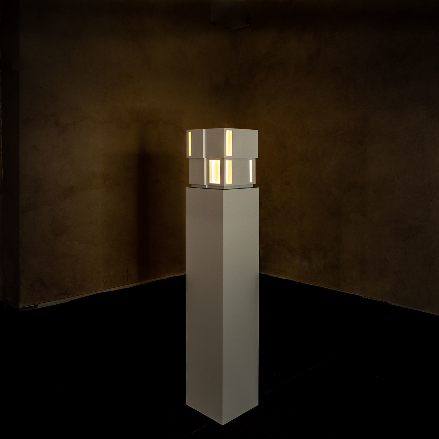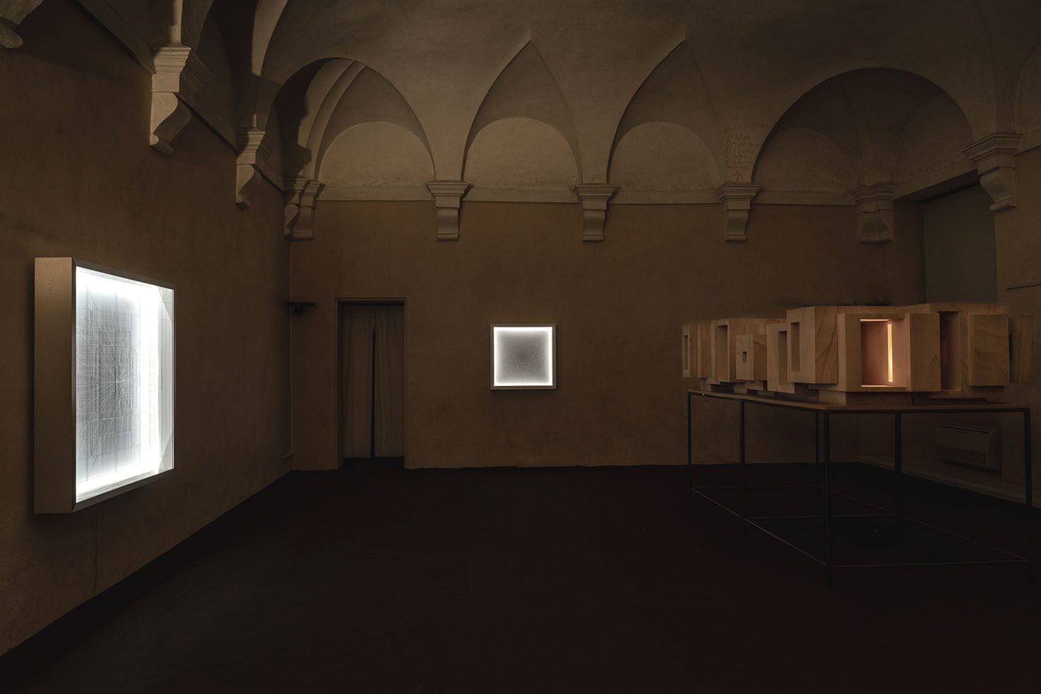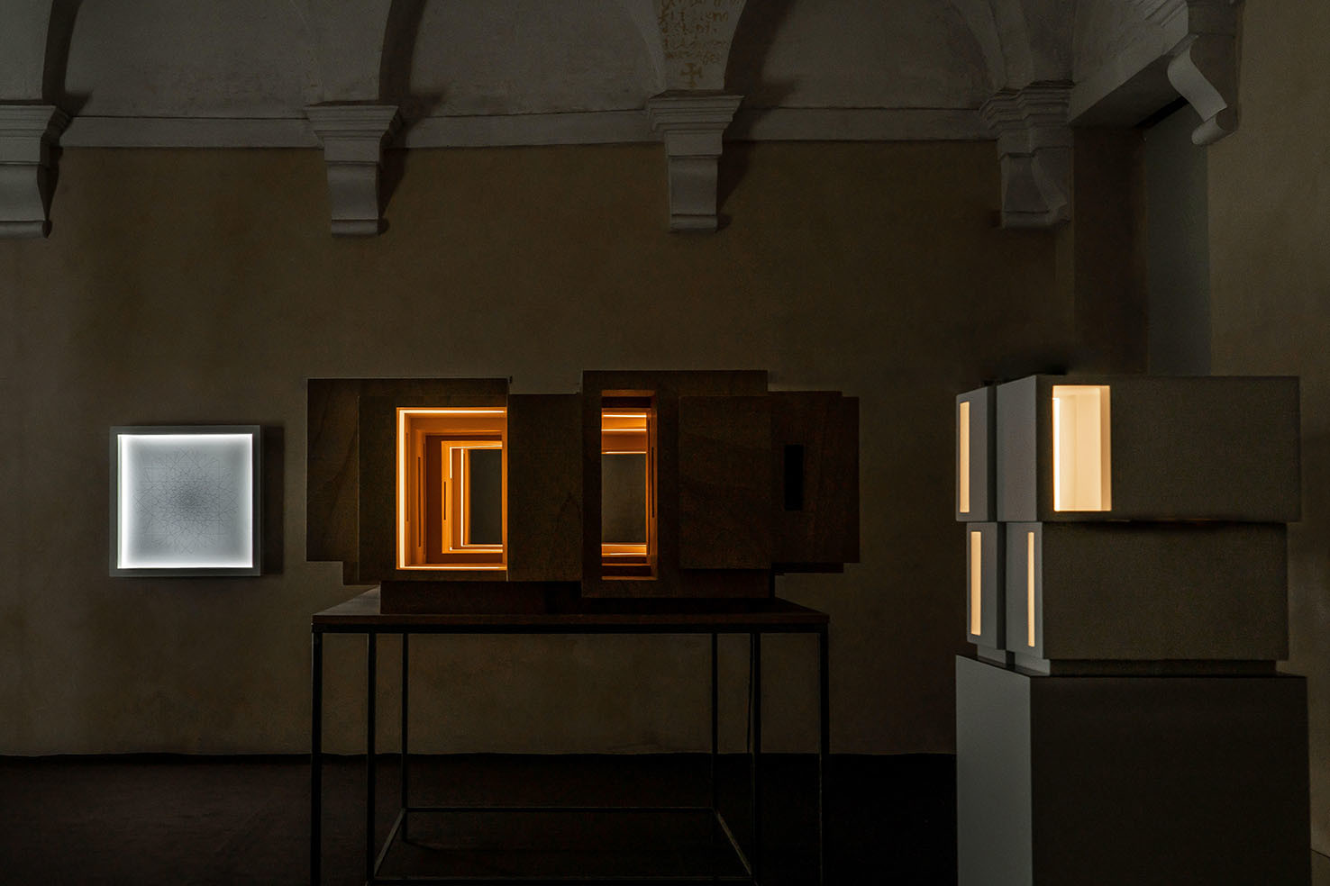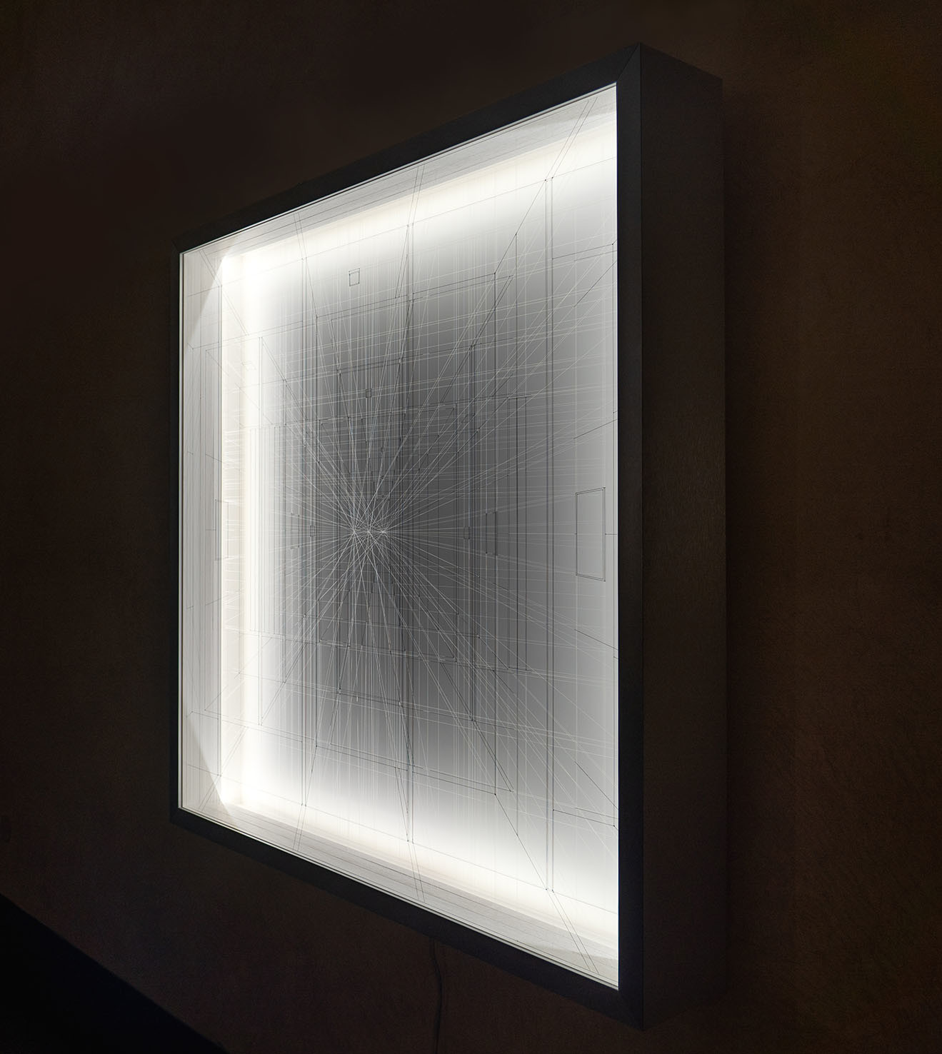 La rassegna raccoglie quattro opere inedite: il disegno tridimensionale luminoso Limen (2021) che si presenta come una visione, uno spettro fluttuante, fortemente evanescente e impalpabile; l’installazione lignea Lost (2015), per la prima volta esposta in Italia dopo Shanghai e Londra, in cui si ritrova la dimensione del labirinto; il mandala tridimensionale luminoso Cosmo (2021) realizzato con fili di fluorocarbonio a partire da precisi calcoli matematici; e la piccola scultura Luce (2021) che rimanda alle architetture fantasma.