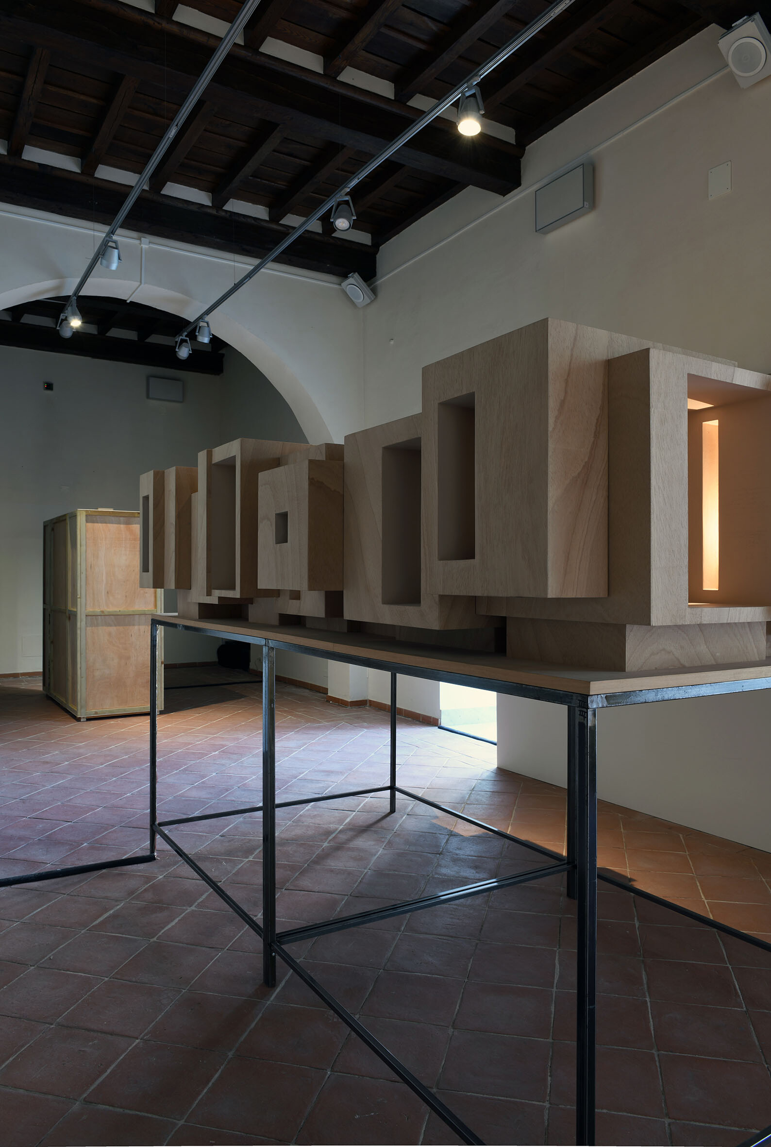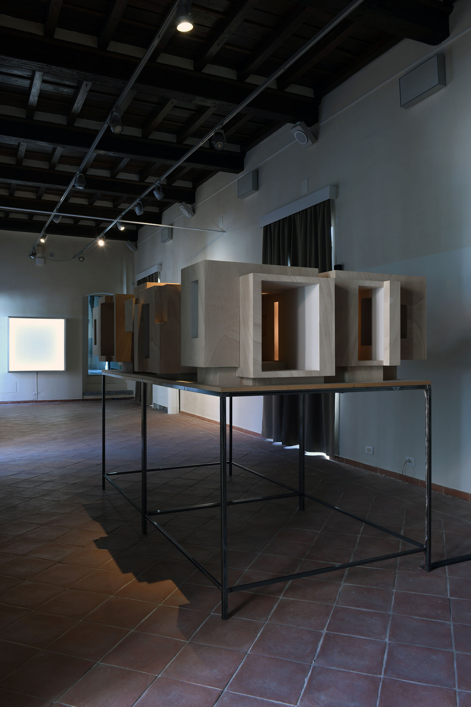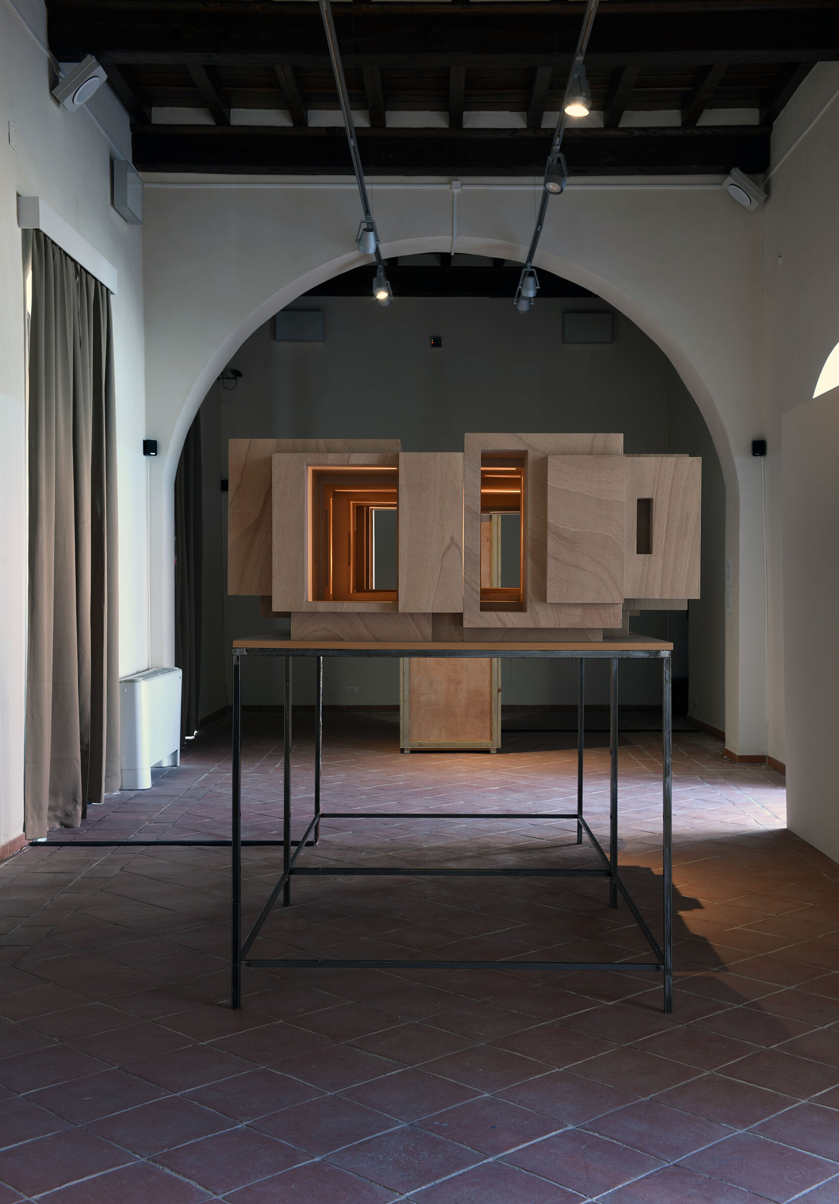 Paolo Cavinato con un approccio maieutico sembra offrirci un mondo preordinato in cui l’artista ha avuto un ruolo da demiurgo. Attraverso opere musealizzate e recenti, tra cui Solaris#5 prodotta site specific per il mudaC, la mostra rappresenta l’opportunità di entrare direttamente in contatto con la produzione dell’artista lasciando spazio a nuove visioni, soglie, limiti e prospettive. Il museo, ospitato in un convento seicentesco, diviene simbolicamente luogo di sperimentazione, spazio di incontro tra l’irreale, il percepito e l’inverosimile trasformando o evolvendo il consueto concetto di realtà, accompagnandoci alla scoperta di un mondo interiore nel quale, una volta ordinato il caos, ci si ritrova. Le opere coniugano spazi vuoti e pieni, percorribili o illusori, forme geometriche o antropizzate. Distante da categorizzazioni, Cavinato individua la sua cifra in un linguaggio visivo unico che unisce pittura, scultura, fotografia, architettura, scenografia e musica. Esplora lo spazio e il tempo, il dentro e il fuori, stimolandoci a indagare i limiti e le potenzialità del nostro rapporto con il mondo che ci circonda e a prendere coscienza di temi antitetici come corpo e mente, natura e artificio. Le sue installazioni destano meraviglia e inquietudine, mettendo in dubbio ogni certezza e spronandoci a confrontarci con la complessità.