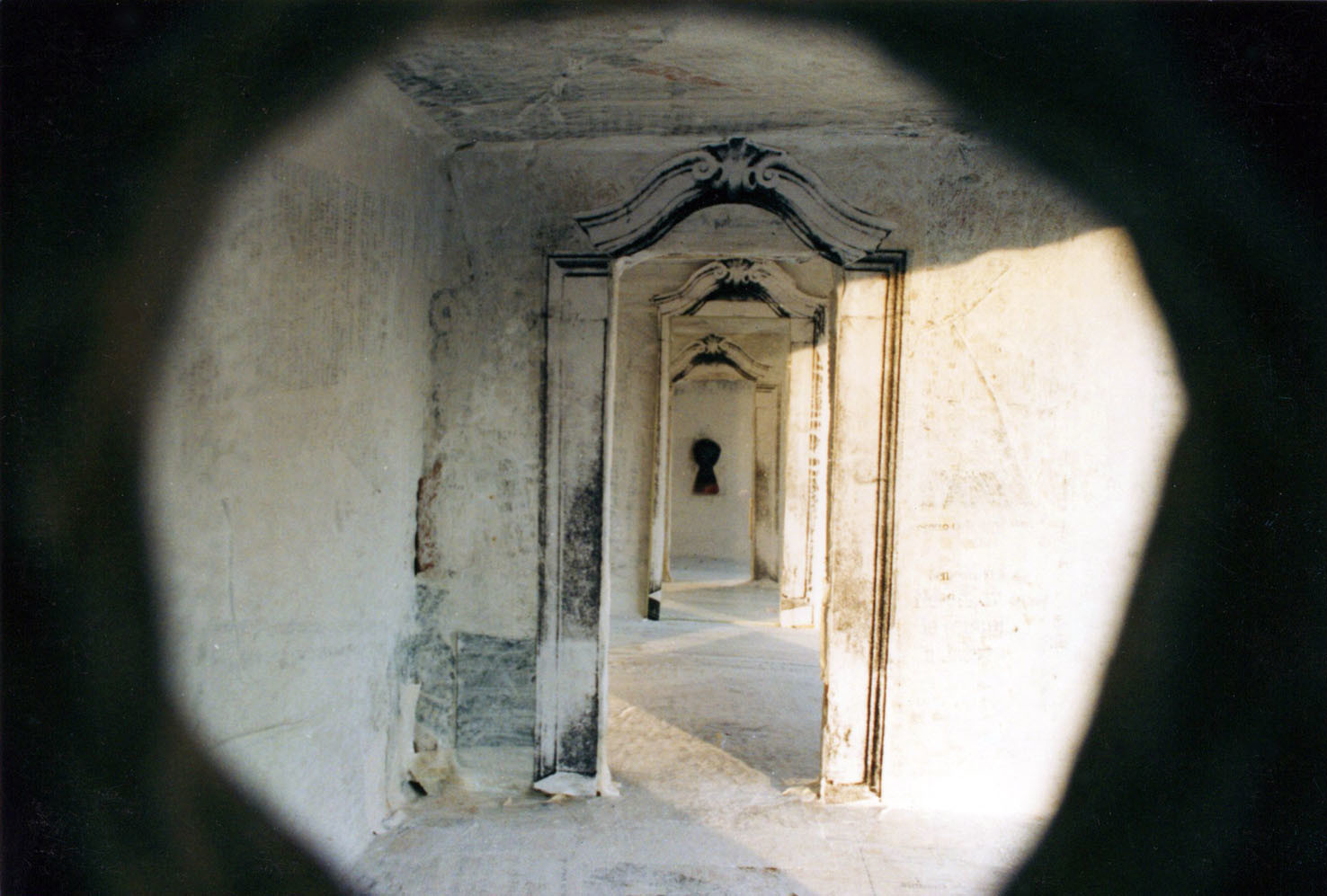 Altre stanze sono costruite con porte e fessure telescopiche: lo spettatore che guarda, può vedere il proprio occhio riflettersi all'interno.