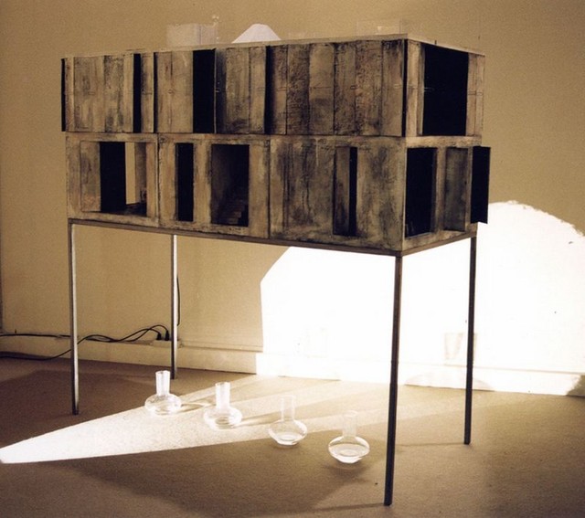 Una specie di armadietto con diverse ante, custodisce all'interno mondi fragili ricostruiti in miniatura.