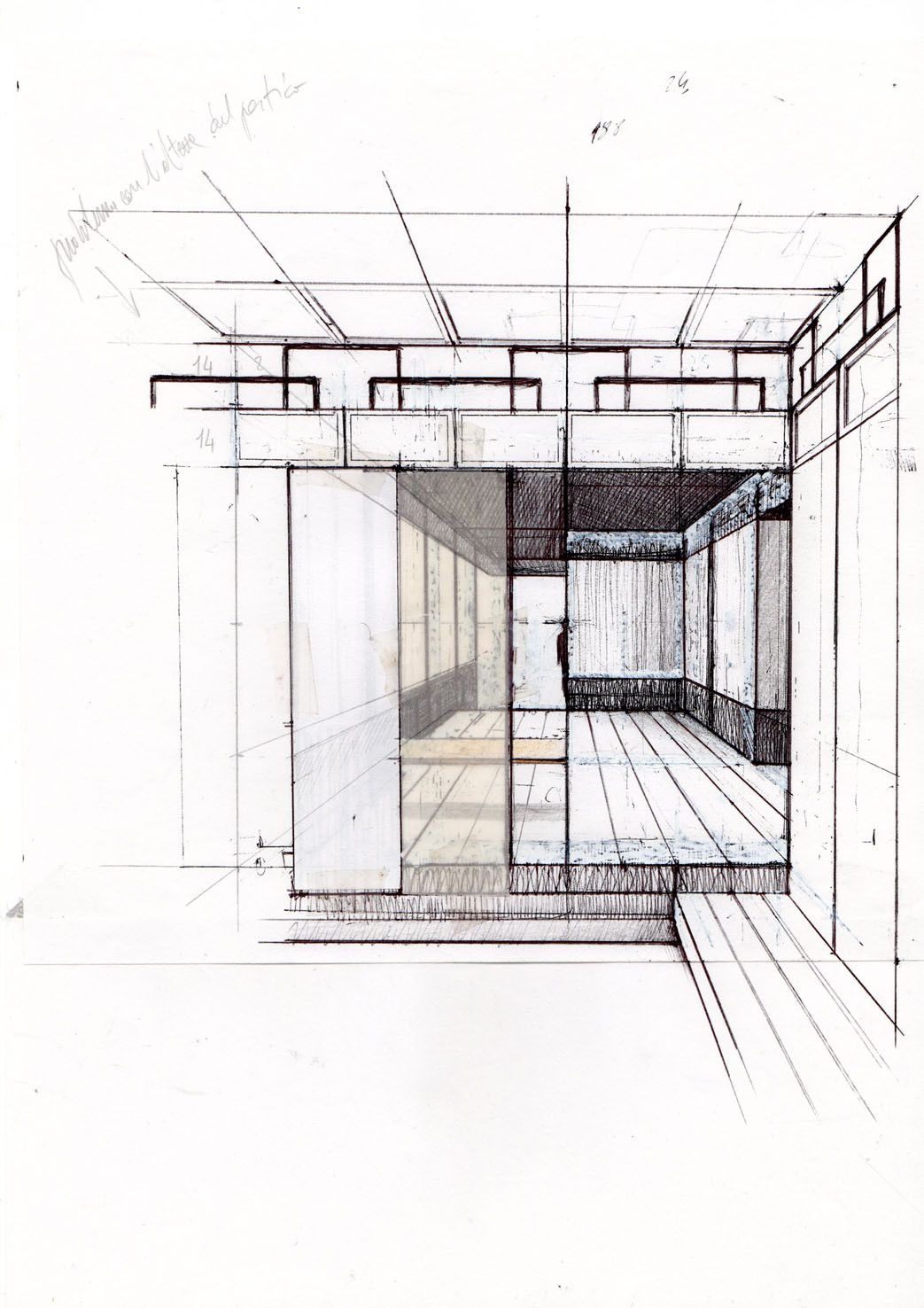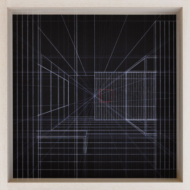 Ricerca Interna è un’opera formata da 4 disegni prospettici. Sono 4 punti d’osservazione che aprono lo sguardo sui 4 lati di un’ipotetica stanza quadrangolare.