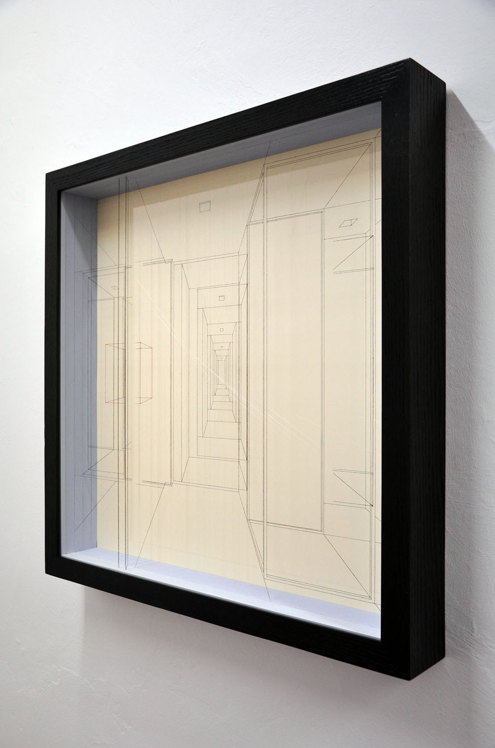 acrilico su filo in fluorocarbonio, fondo in alluminio verniciato, cornice in legno, plexiglas esterno portettivo