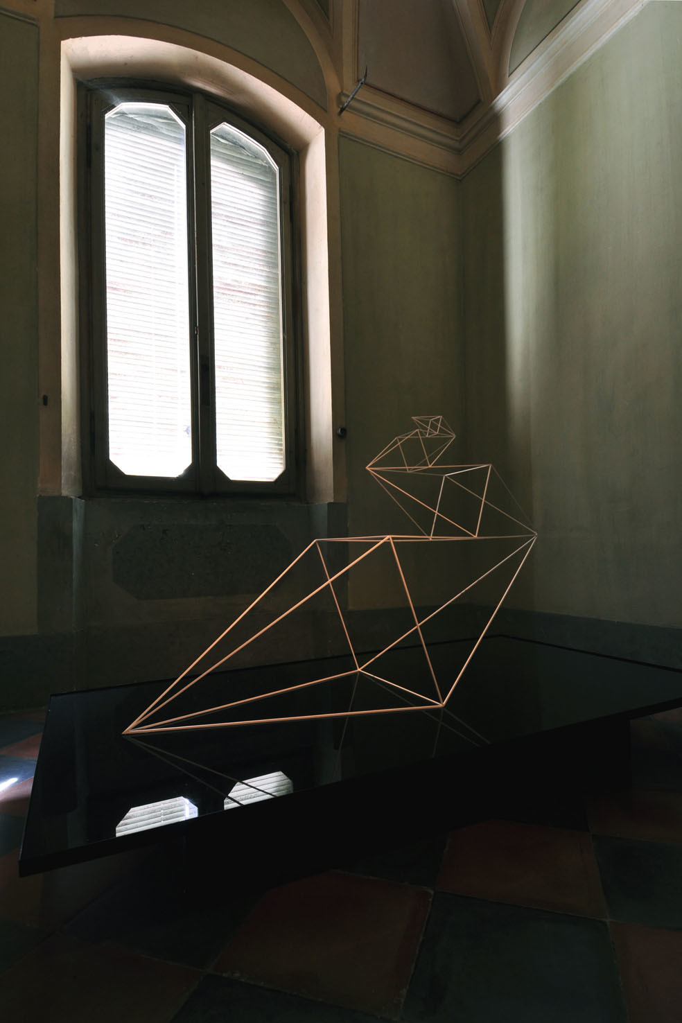 Una leggera e quasi grafica scultura del vuoto di ascendenza costruttivista, allude al principio di una geometria della natura e ad un sotteso ordine cosmico regolatore, come altra faccia del caos primigenio che insieme ci riporta all’idea di trasformazione alchemica. La scura superficie dello specchio si riferisce all’elemento dell'acqua, simbolo di un profondo e indistinto contraltare al razionale della forma che vi si specchia, ma soprattutto topos dell’elemento di vita e dunque di nuovo di un principio generatore.