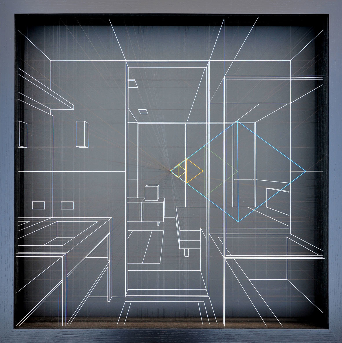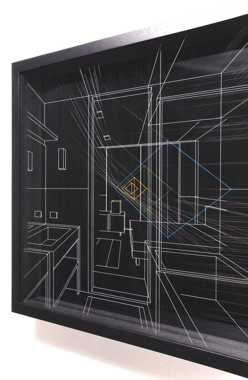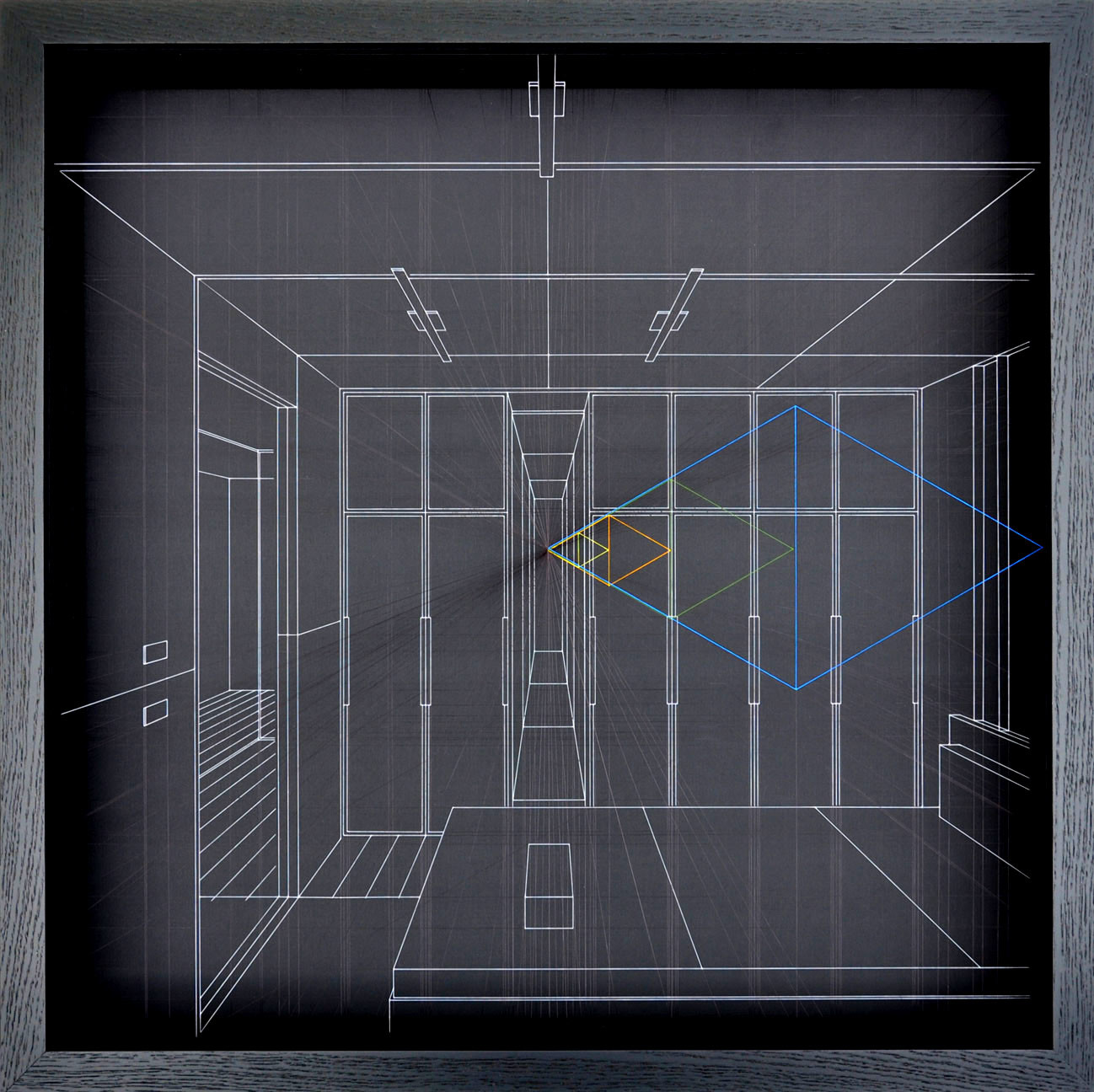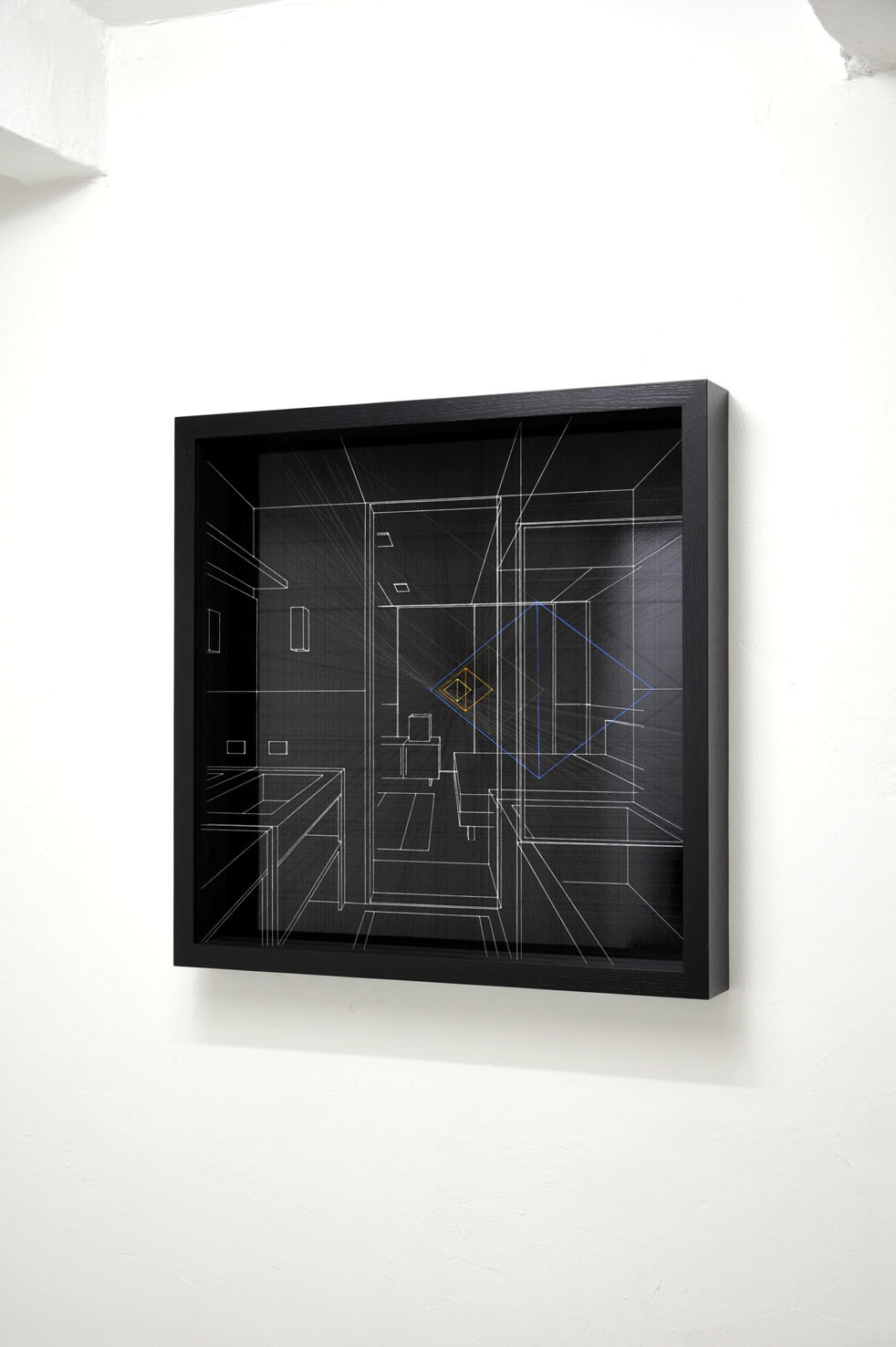 L’opera è un disegno prospettico bianco su fondo nero e rappresenta un interno domestico, dove alcuni elementi geometrici rimandano ad una dimensione astratta e metafisica.