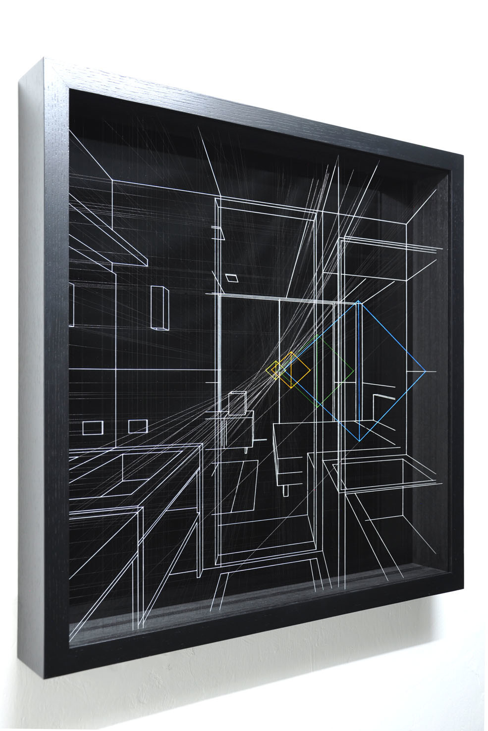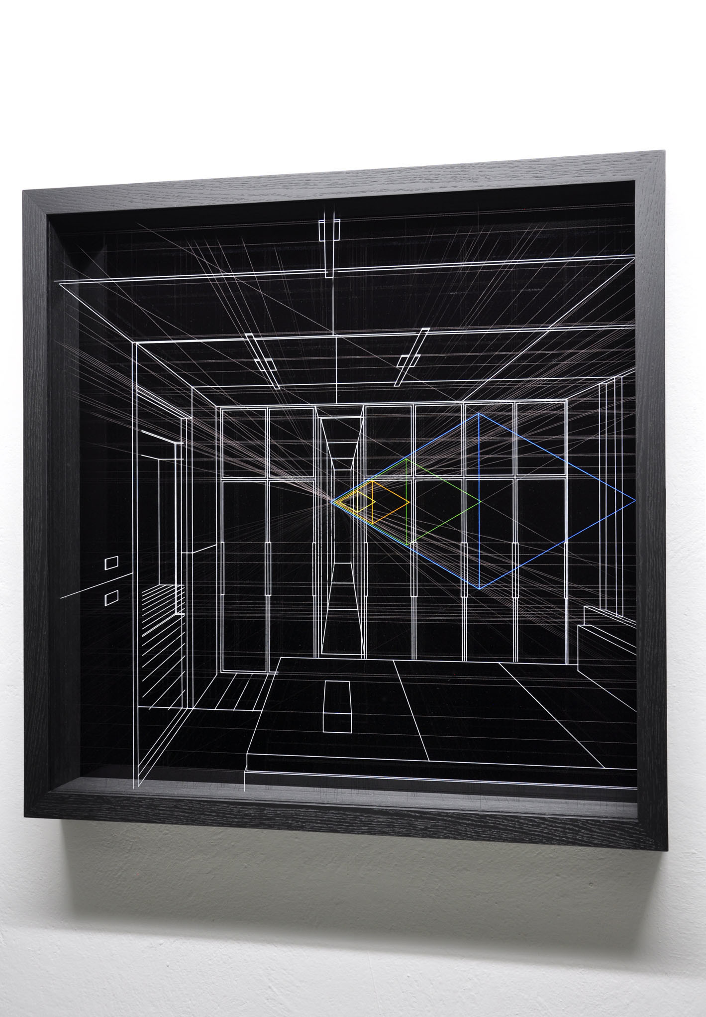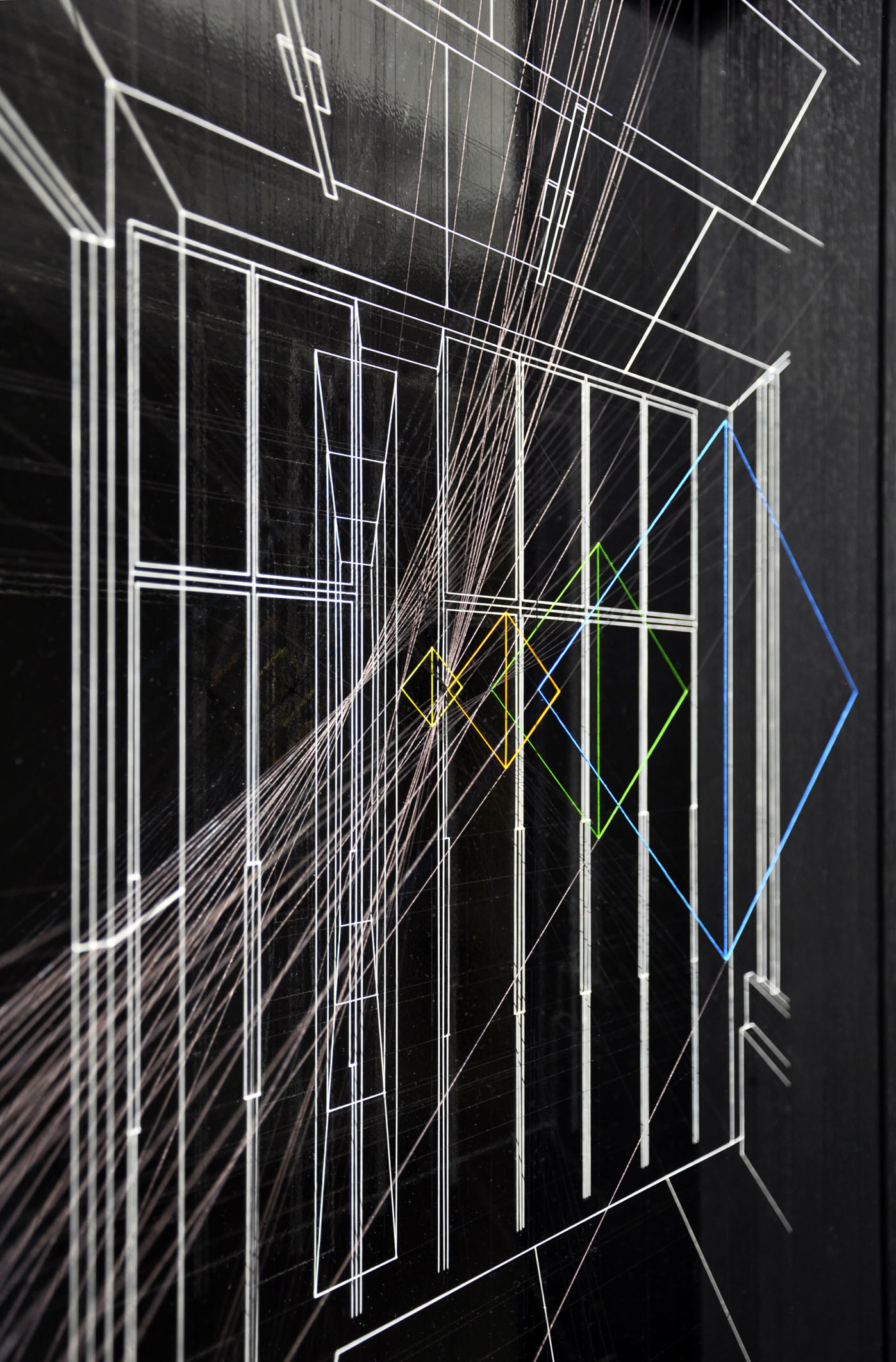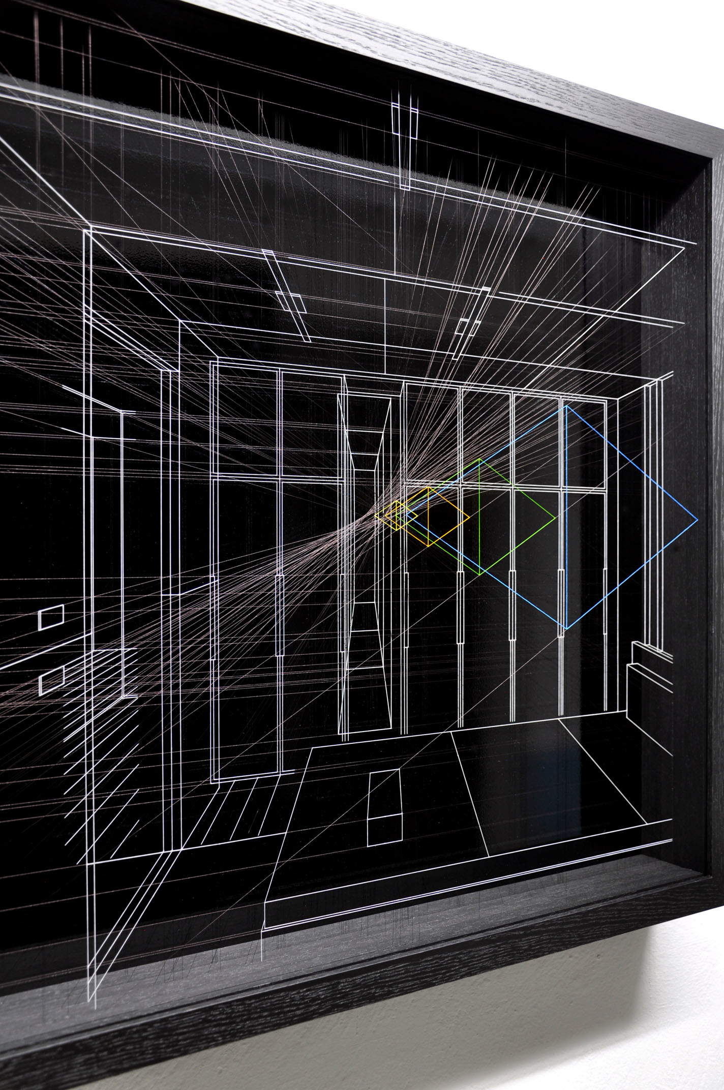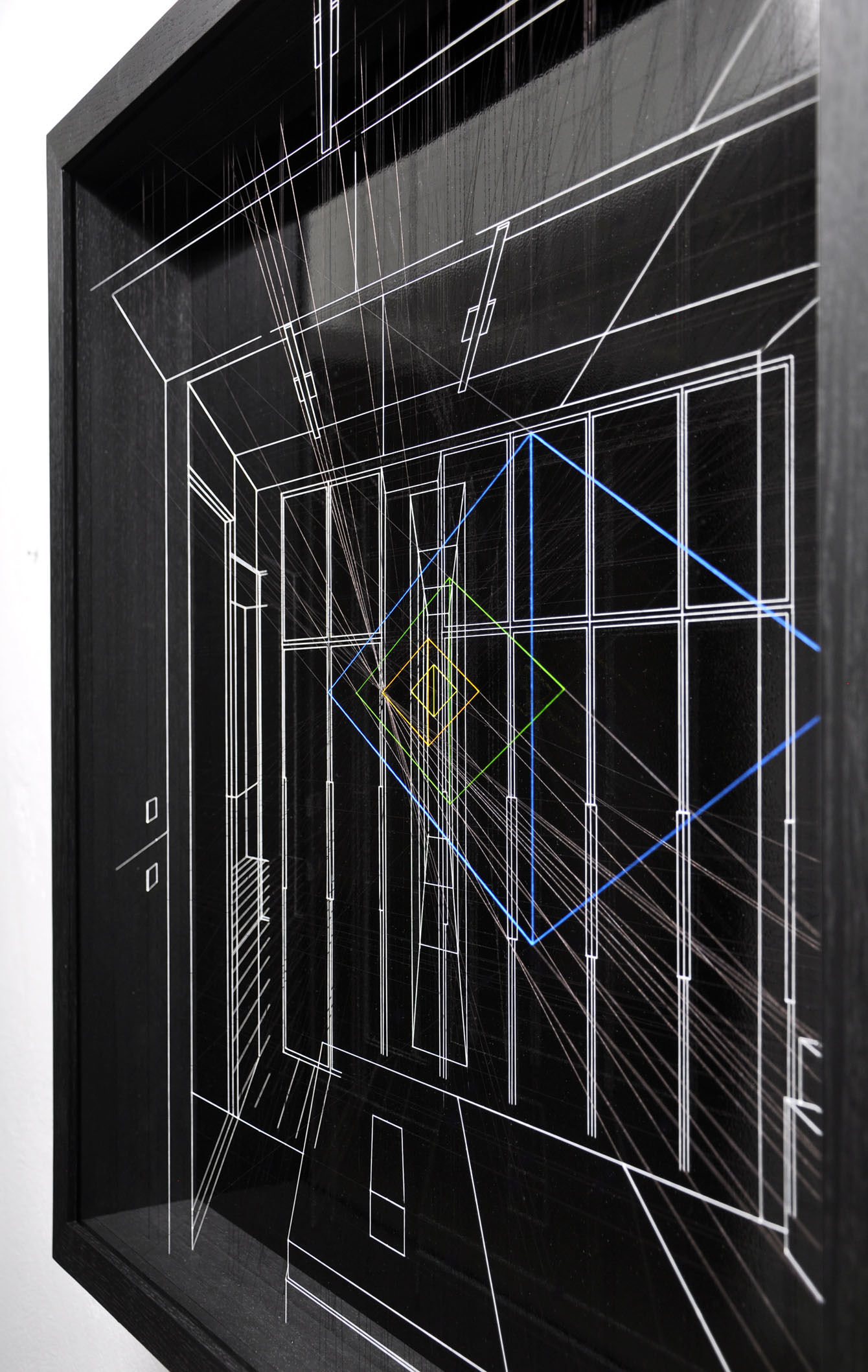 Smalto su filo in fluorocarbonio, cornice in legno laccato, fondo in alluminio verniciato, vetro museale
