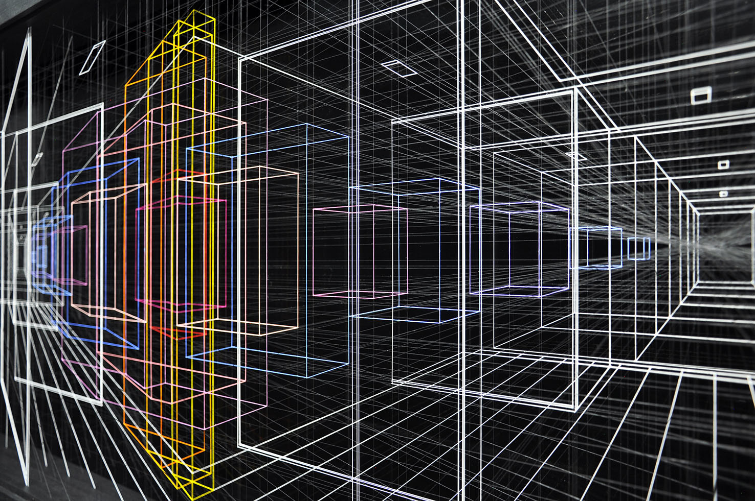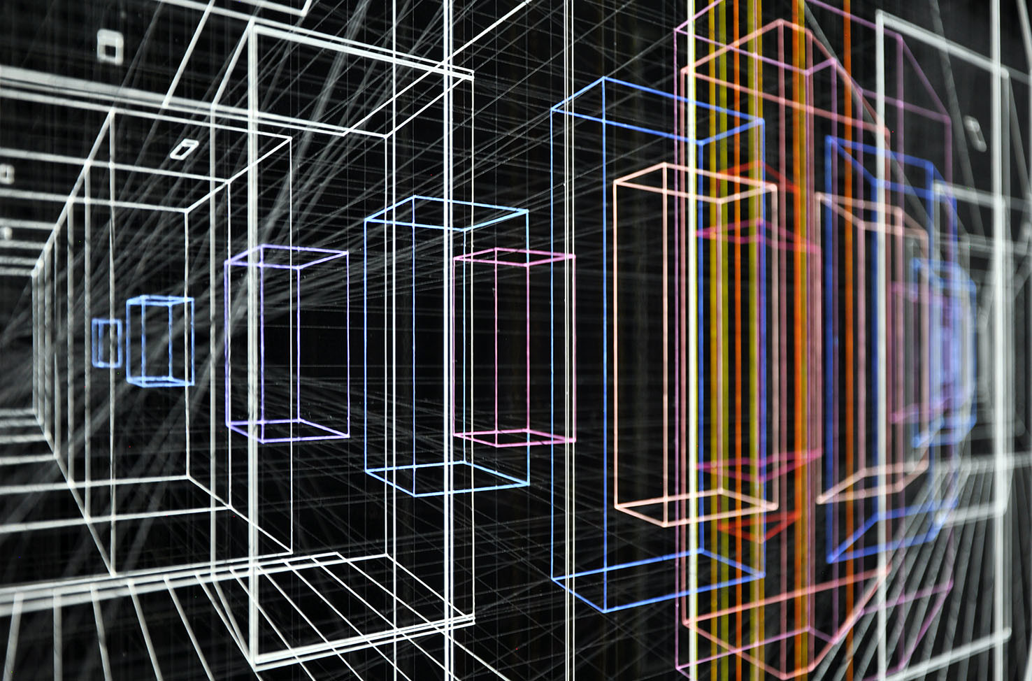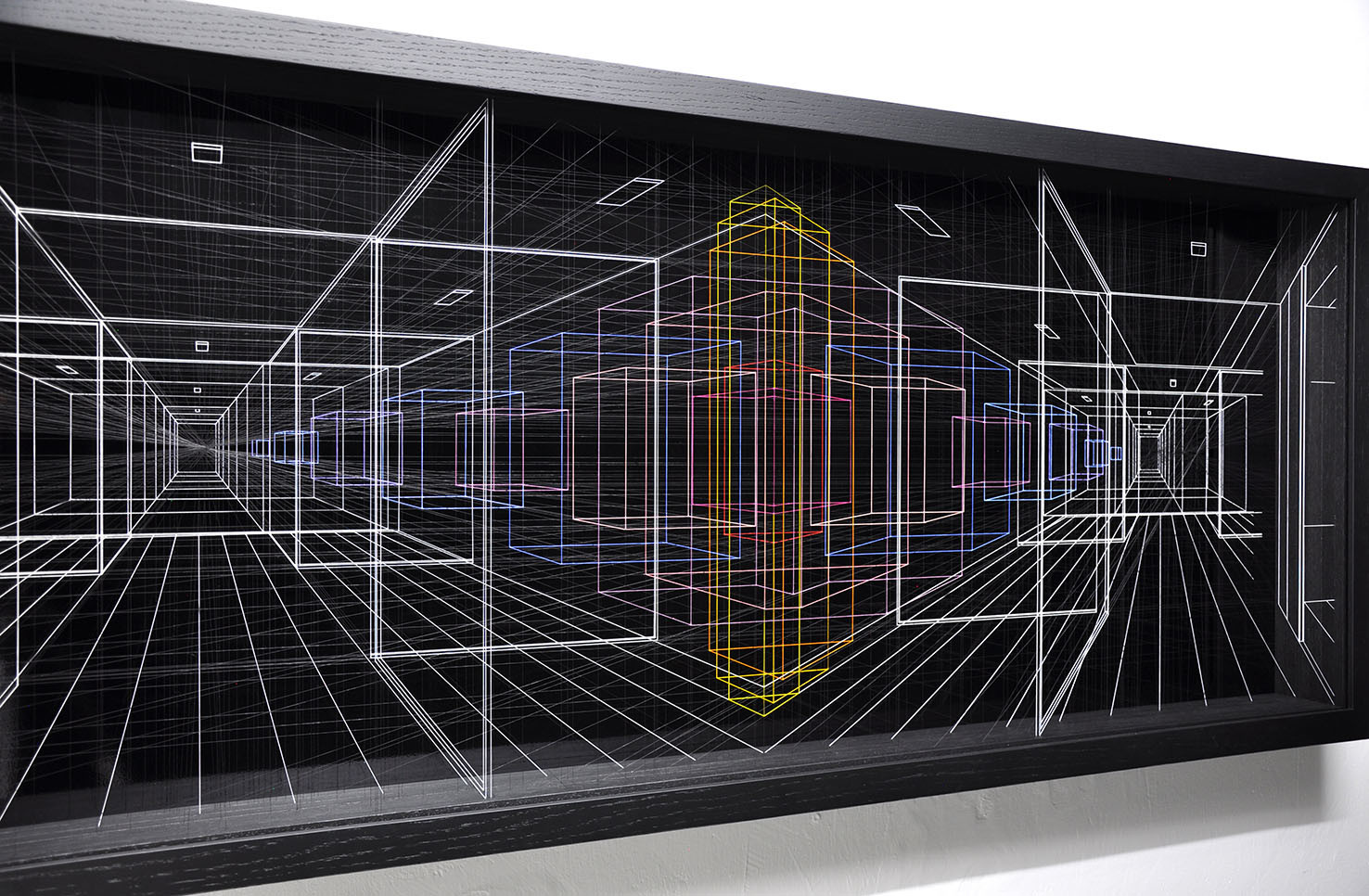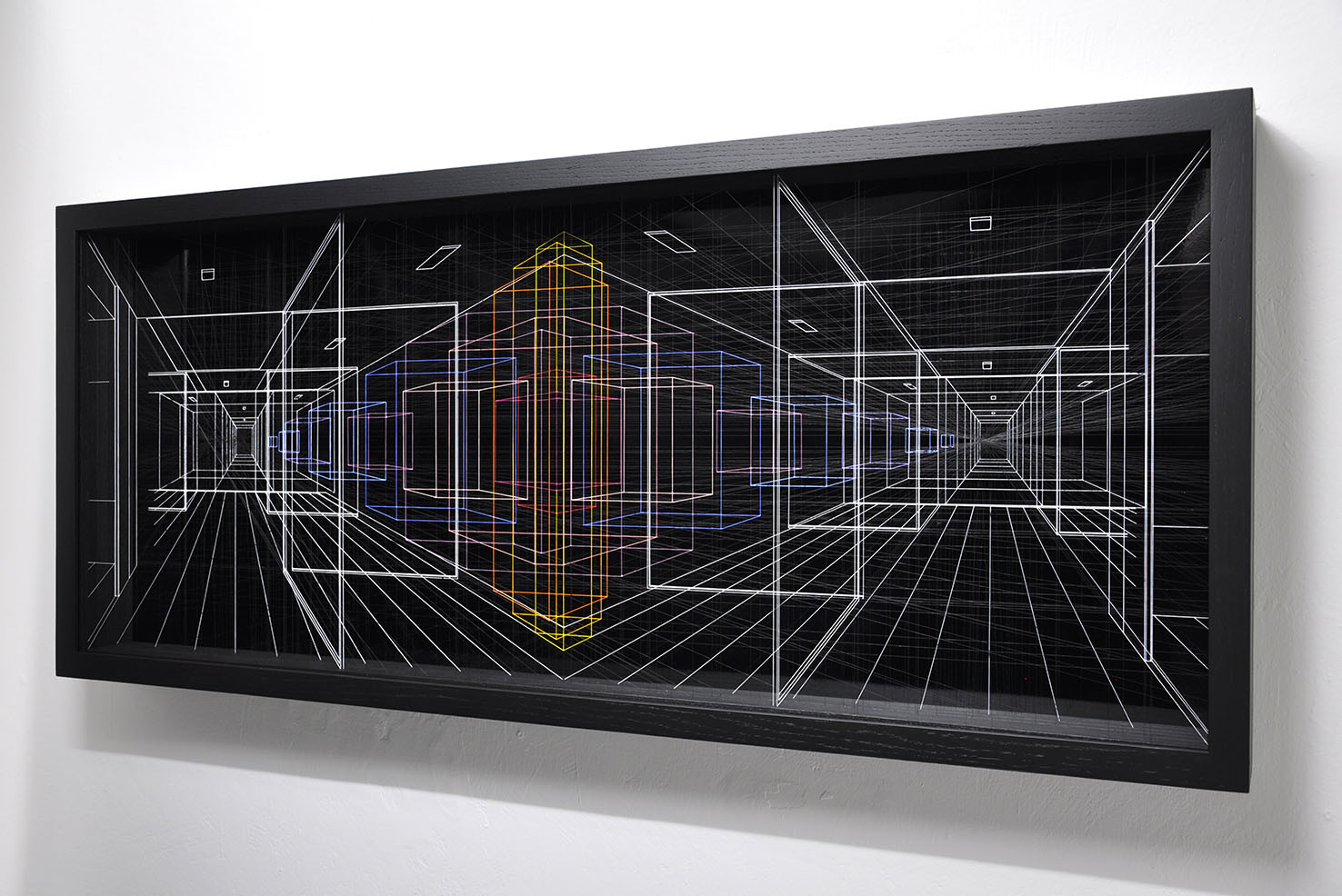 Smalto e acrilico su filo in fluorocarbonio, cornice in legno, fondo in alluminio verniciato, vetro museale protettivo esterno
