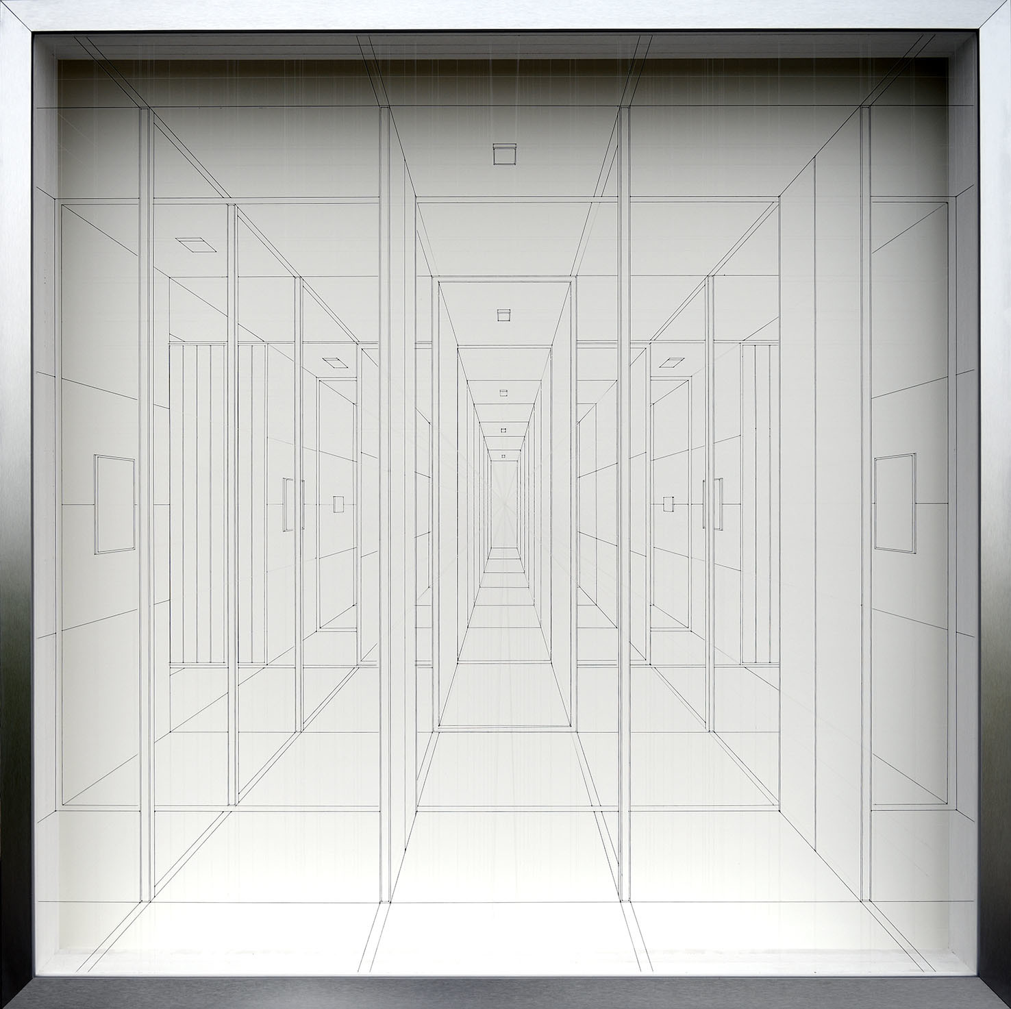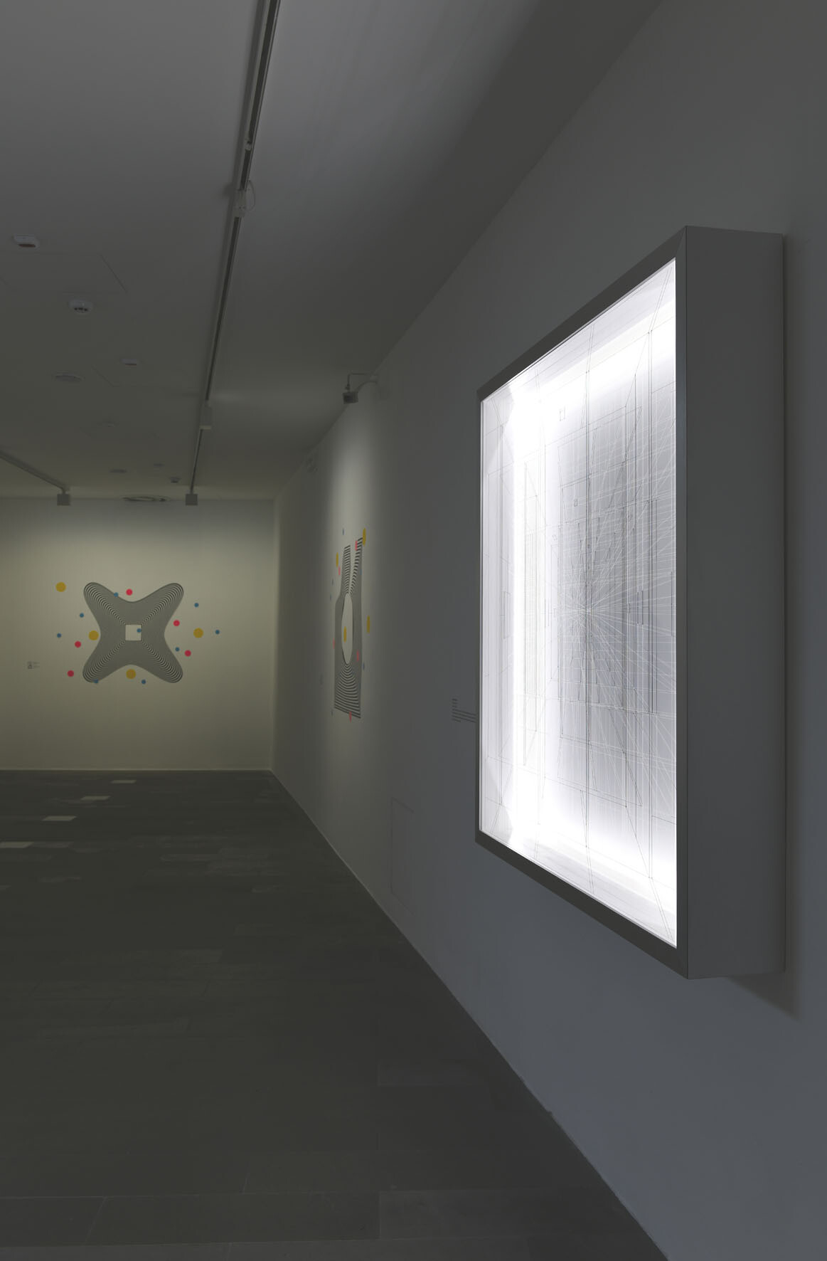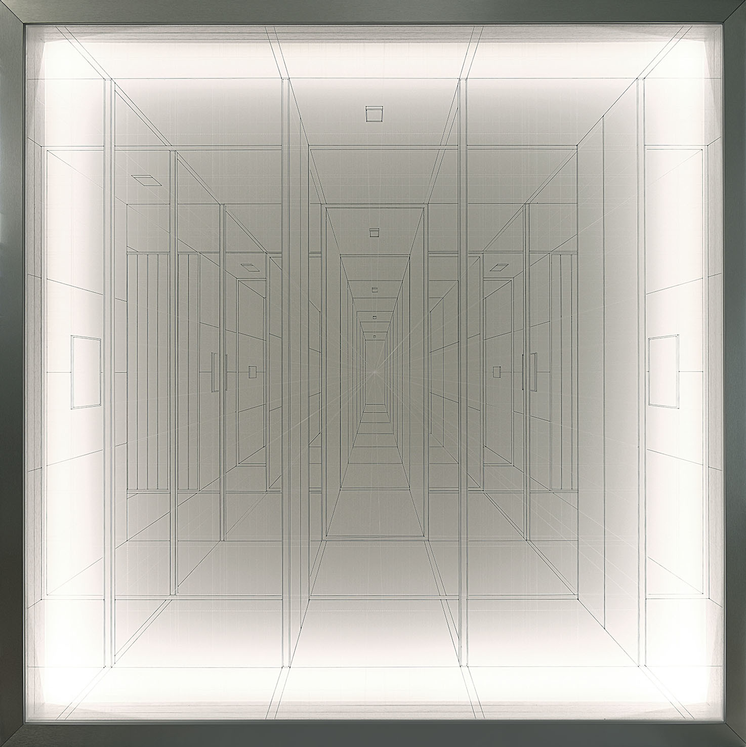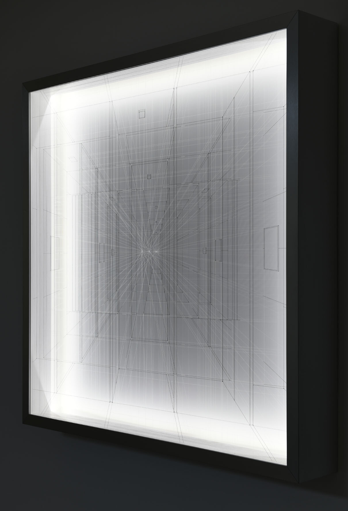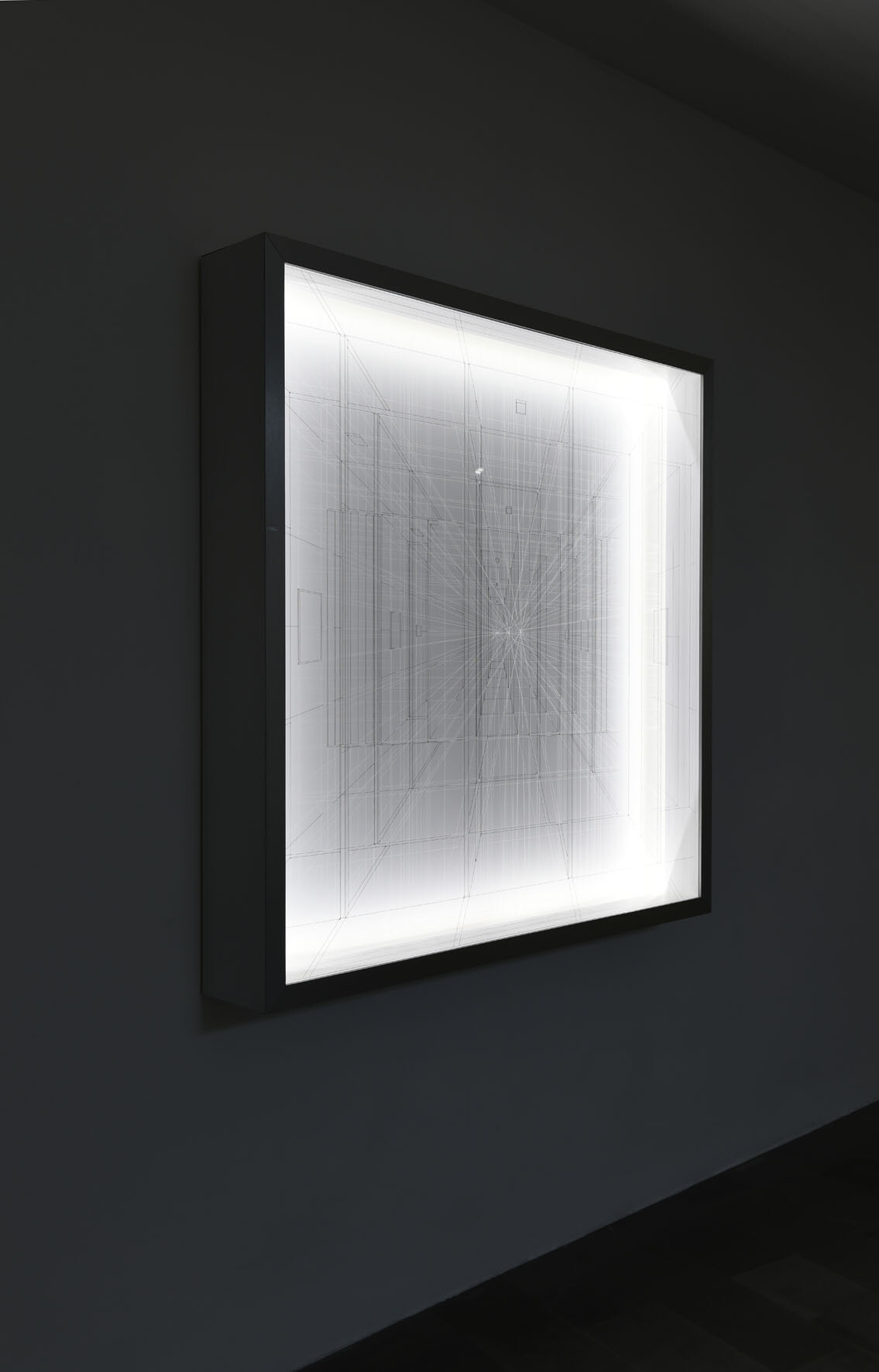 Smalto su filo in fluorocarbonio, telai e fondo in legno laccato, cornice in alluminio. Circuito luminoso LED con dimmer (regolatore d'intensità), plexiglas protettivo esterno