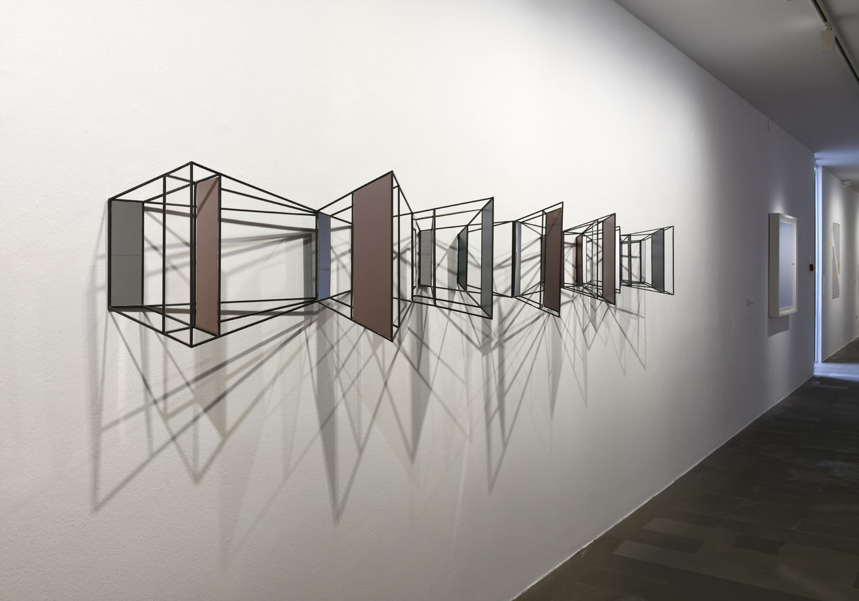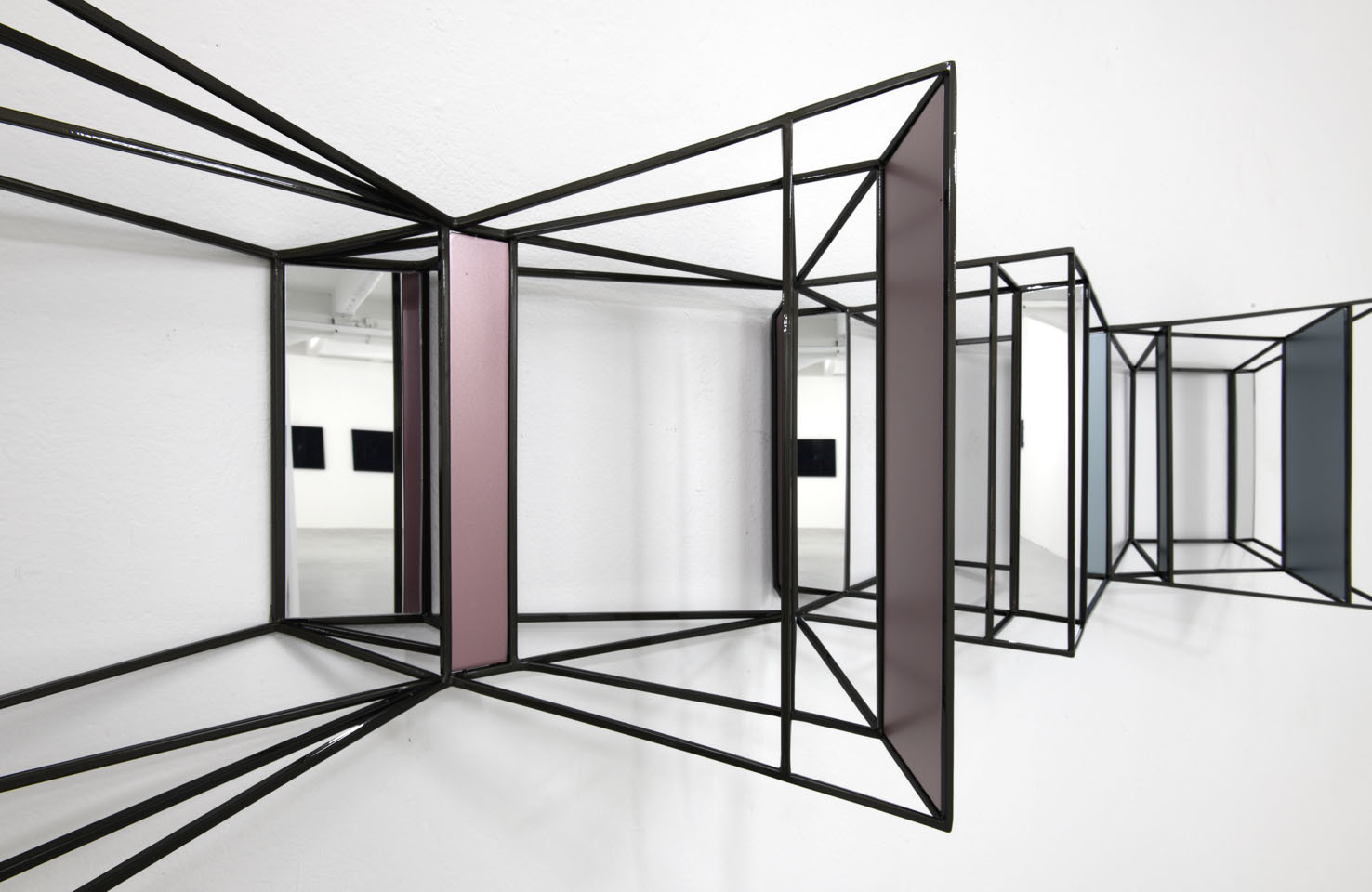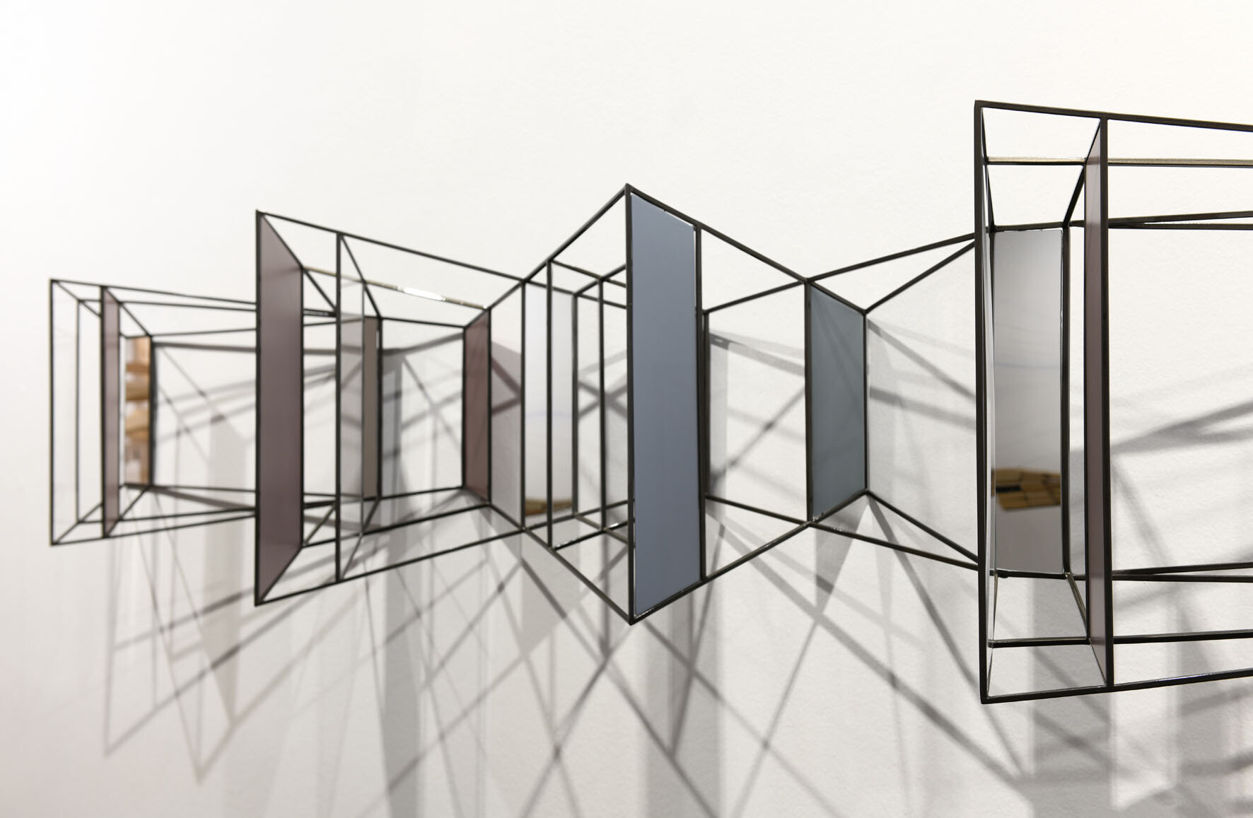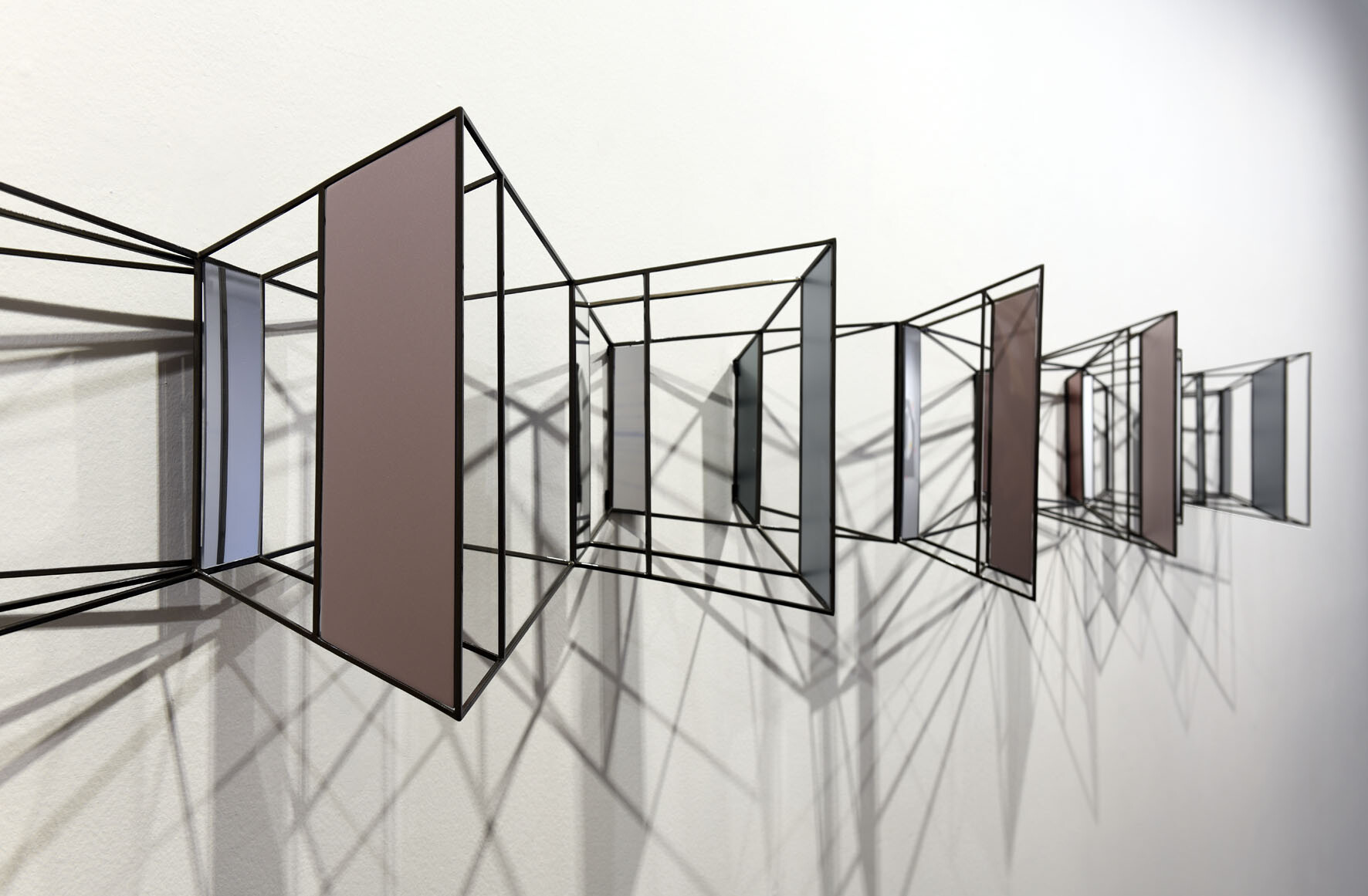 Questa installazione a parete, sorta di struttura panoramica ipnotica, è la visione di uno spazio labirintico in cui il nostro punto d'osservazione si perde. Aperture e chiusure, stanze e corridoi e superfici opache o specchianti che alludono ad altri spazi o ne moltiplicano le direzioni come in una visione caleidosopica. Direzioni, prospettive, vie, possibilità varie in cui lo sguardo perde ogni punto di riferimento.