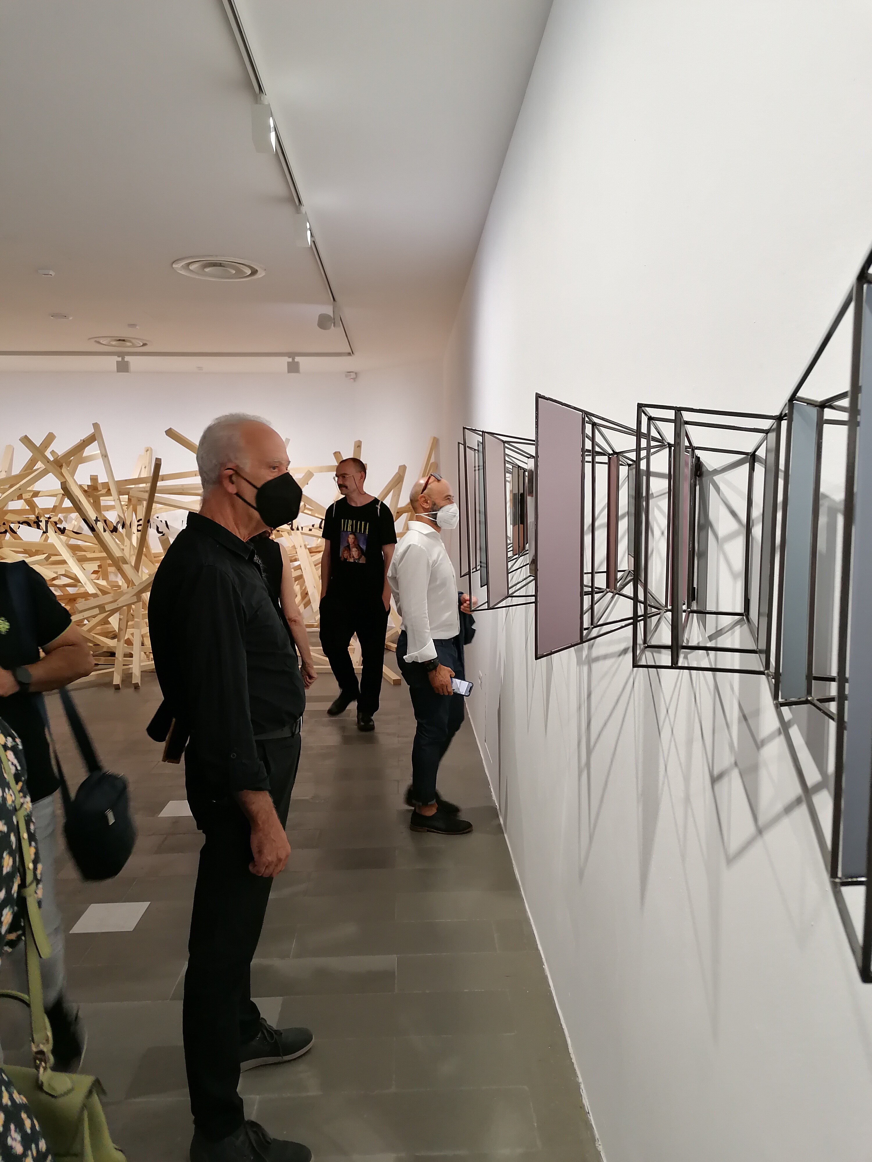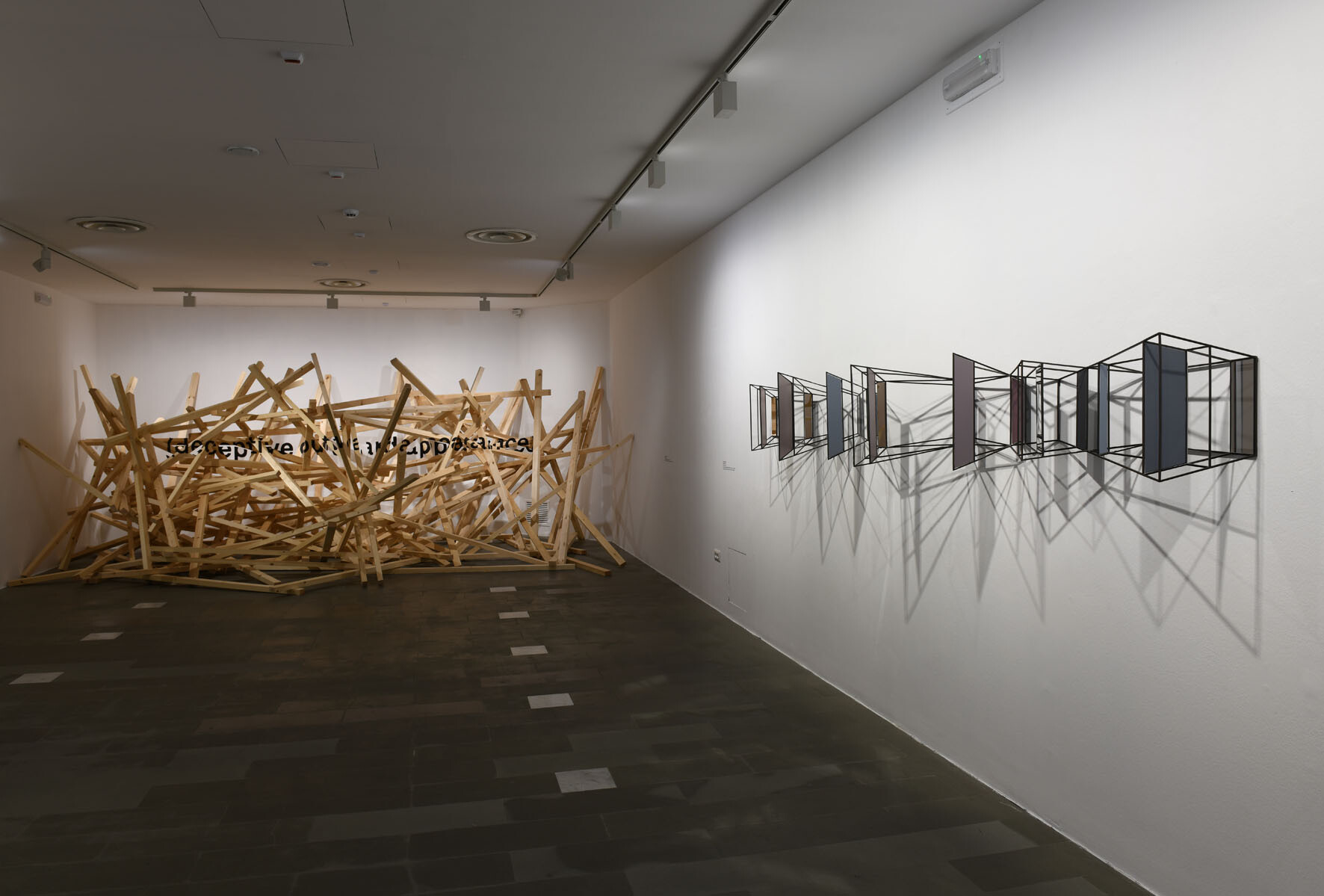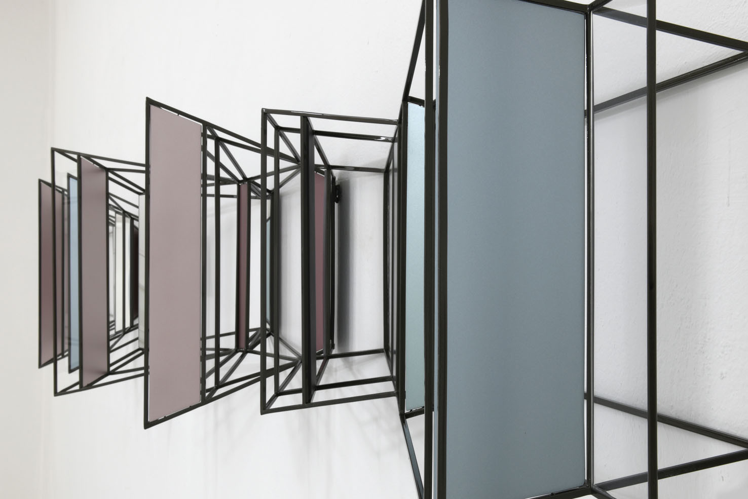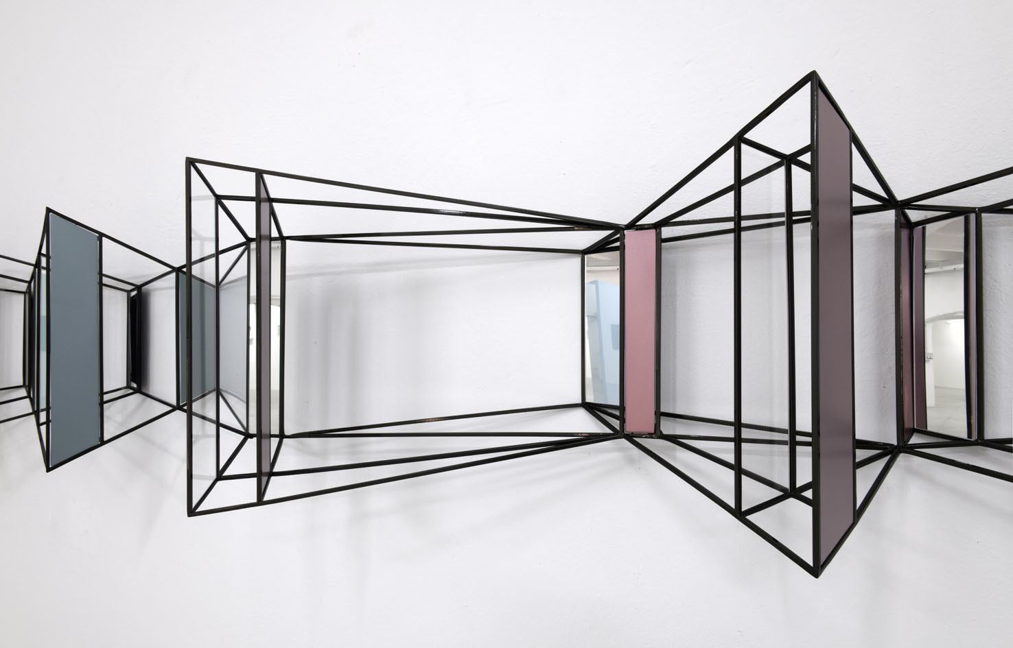 Questa installazione a parete, sorta di struttura panoramica ipnotica, è la visione di uno spazio labirintico in cui il nostro punto d'osservazione si perde. Aperture e chiusure, stanze e corridoi e superfici opache o specchianti che alludono ad altri spazi o ne moltiplicano le direzioni come in una visione caleidosopica. Direzioni, prospettive, vie, possibilità varie in cui lo sguardo perde ogni punto di riferimento.