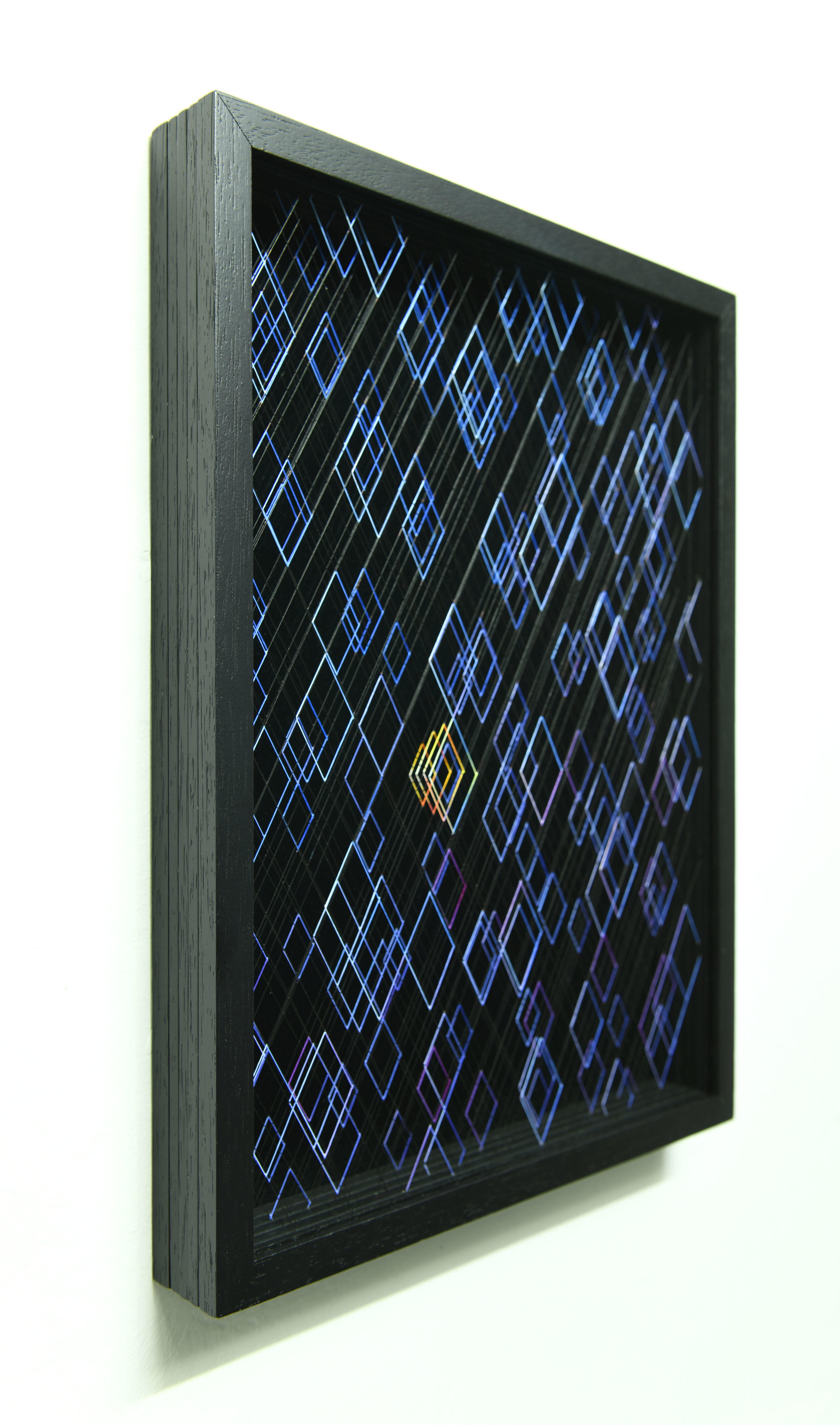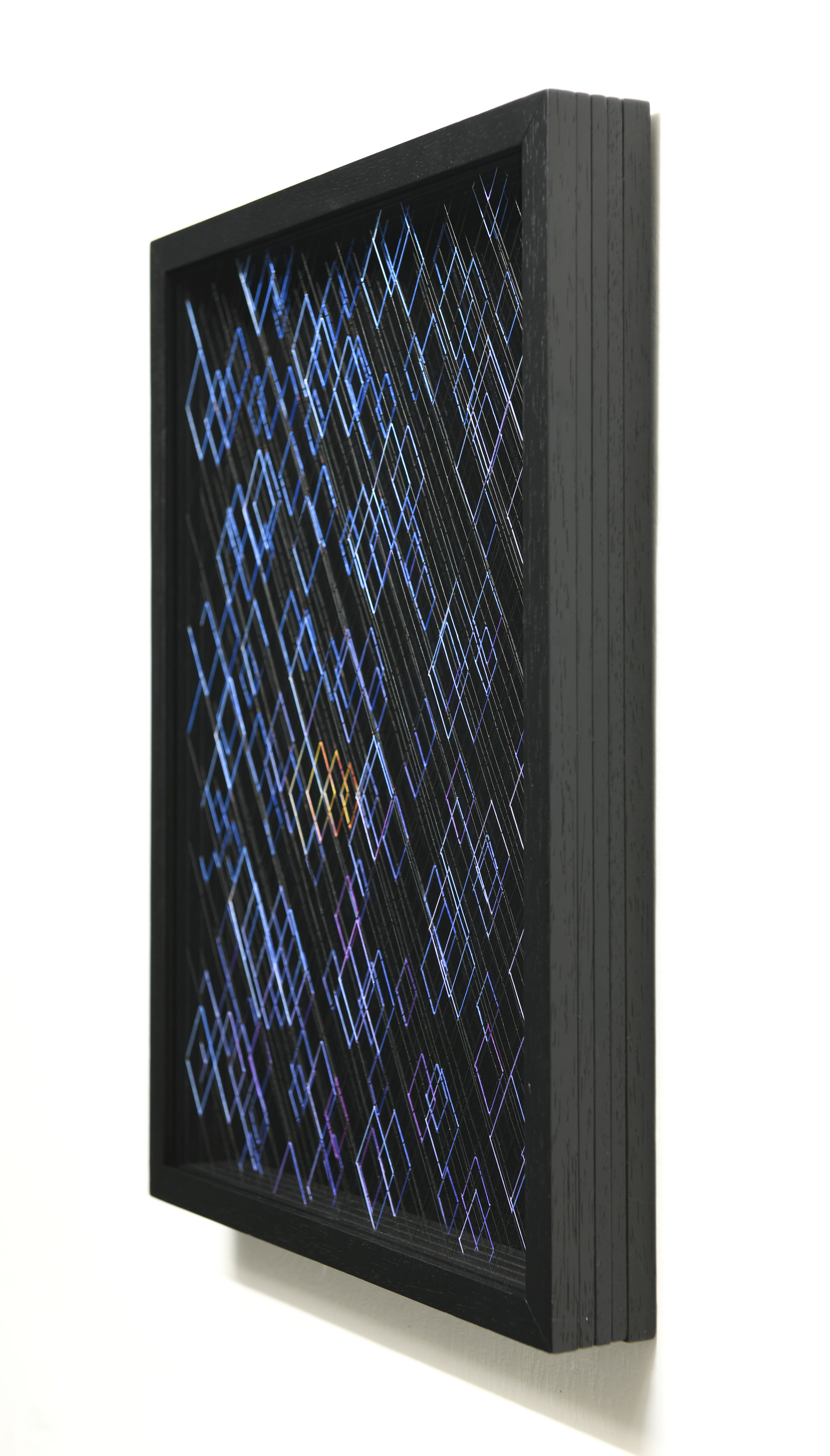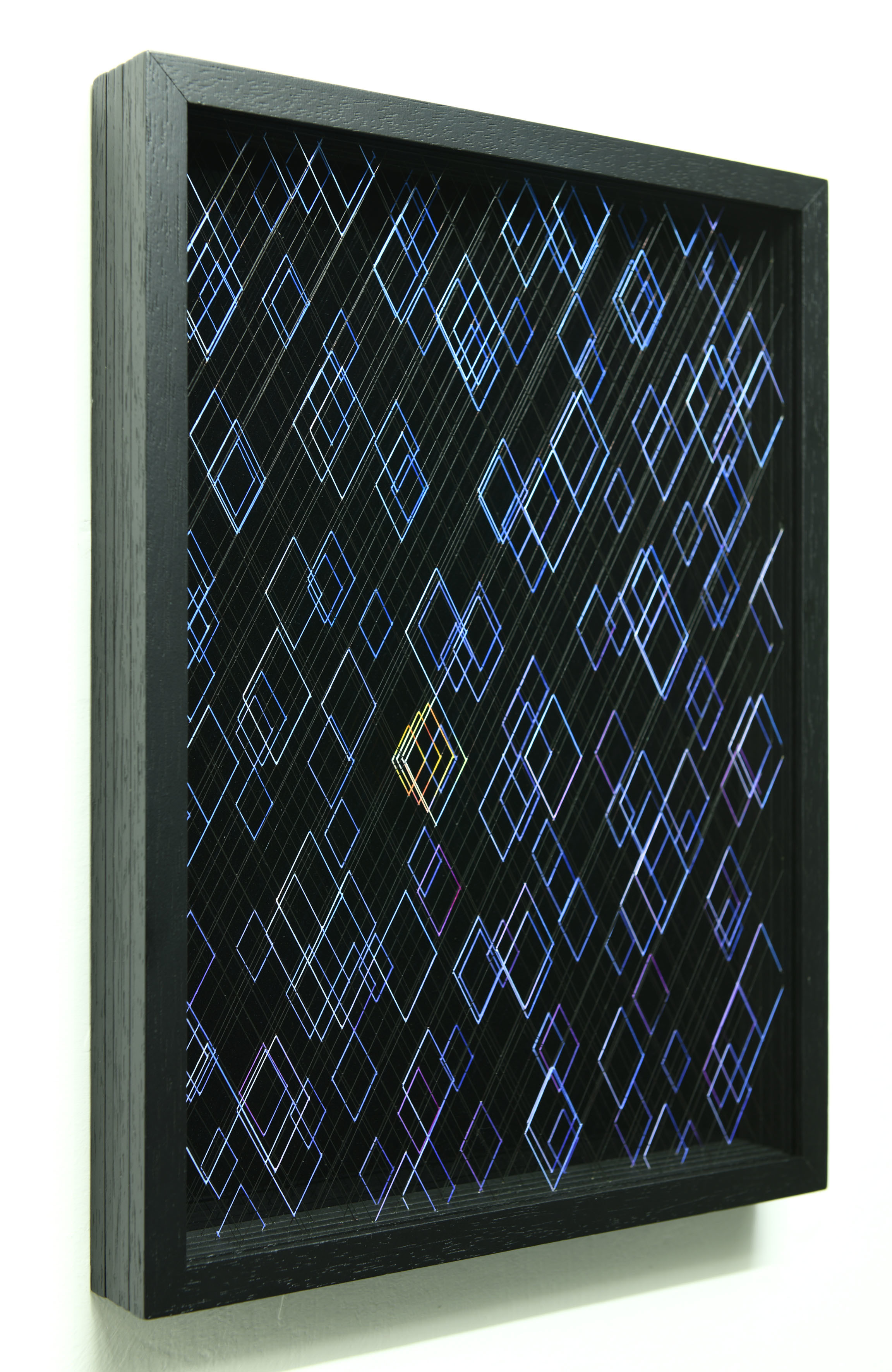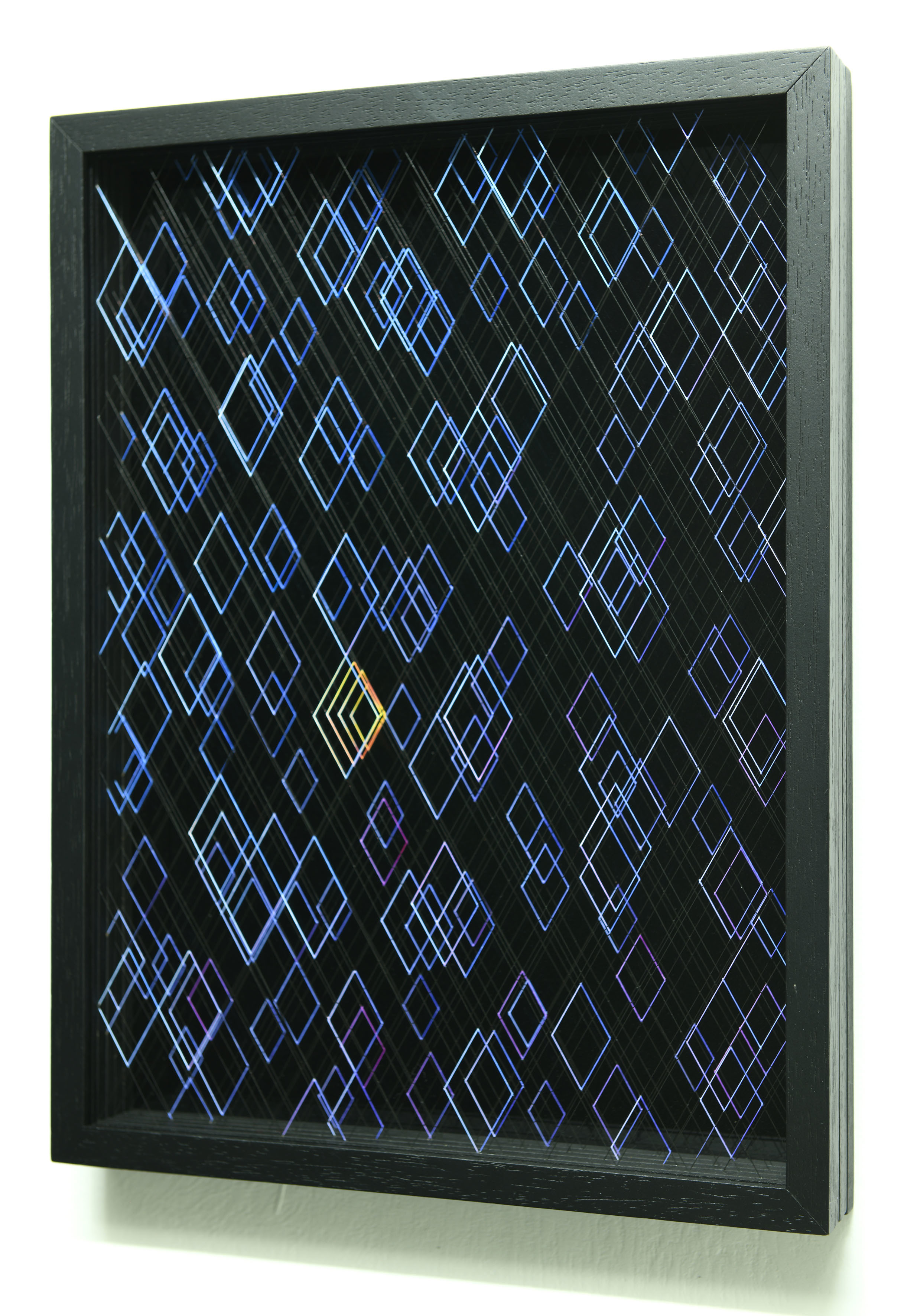 Smalto e acrilico su filo in fluorocarbonio, cornice in legno, fondo in alluminio verniciato, vetro museale protettivo esterno