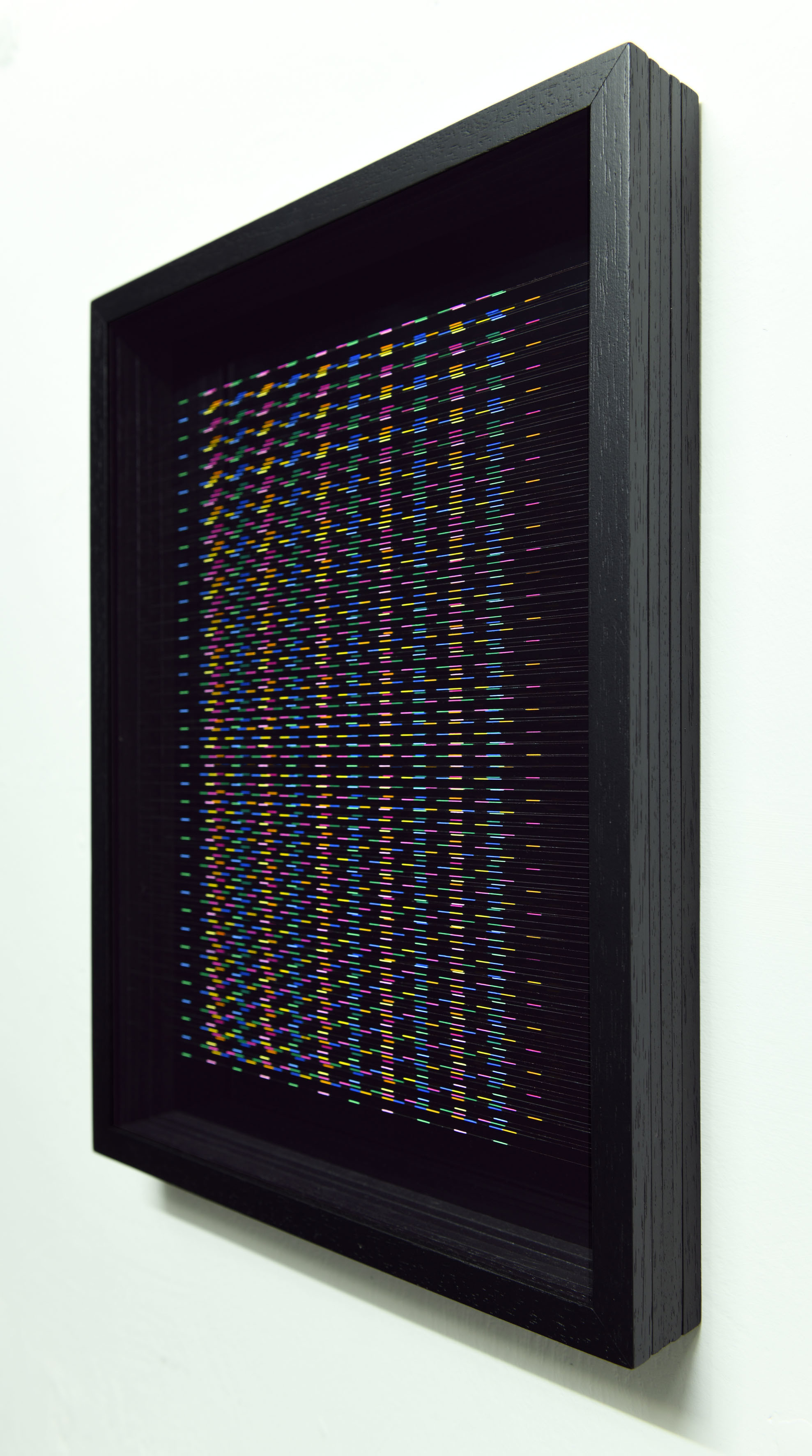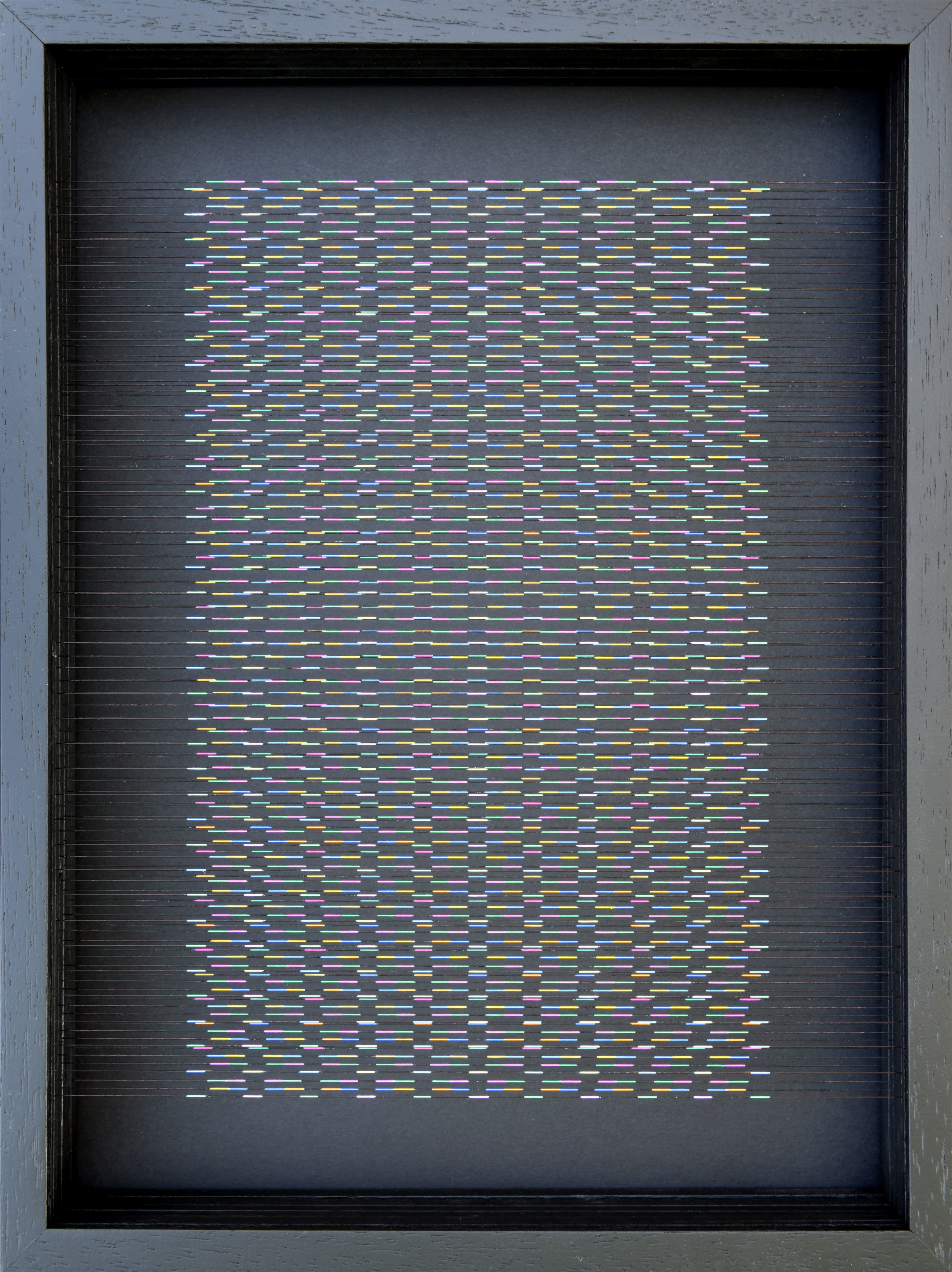 Smalto e acrilico su filo in fluorocarbonio, cornice in legno, fondo in alluminio verniciato, vetro museale protettivo esterno