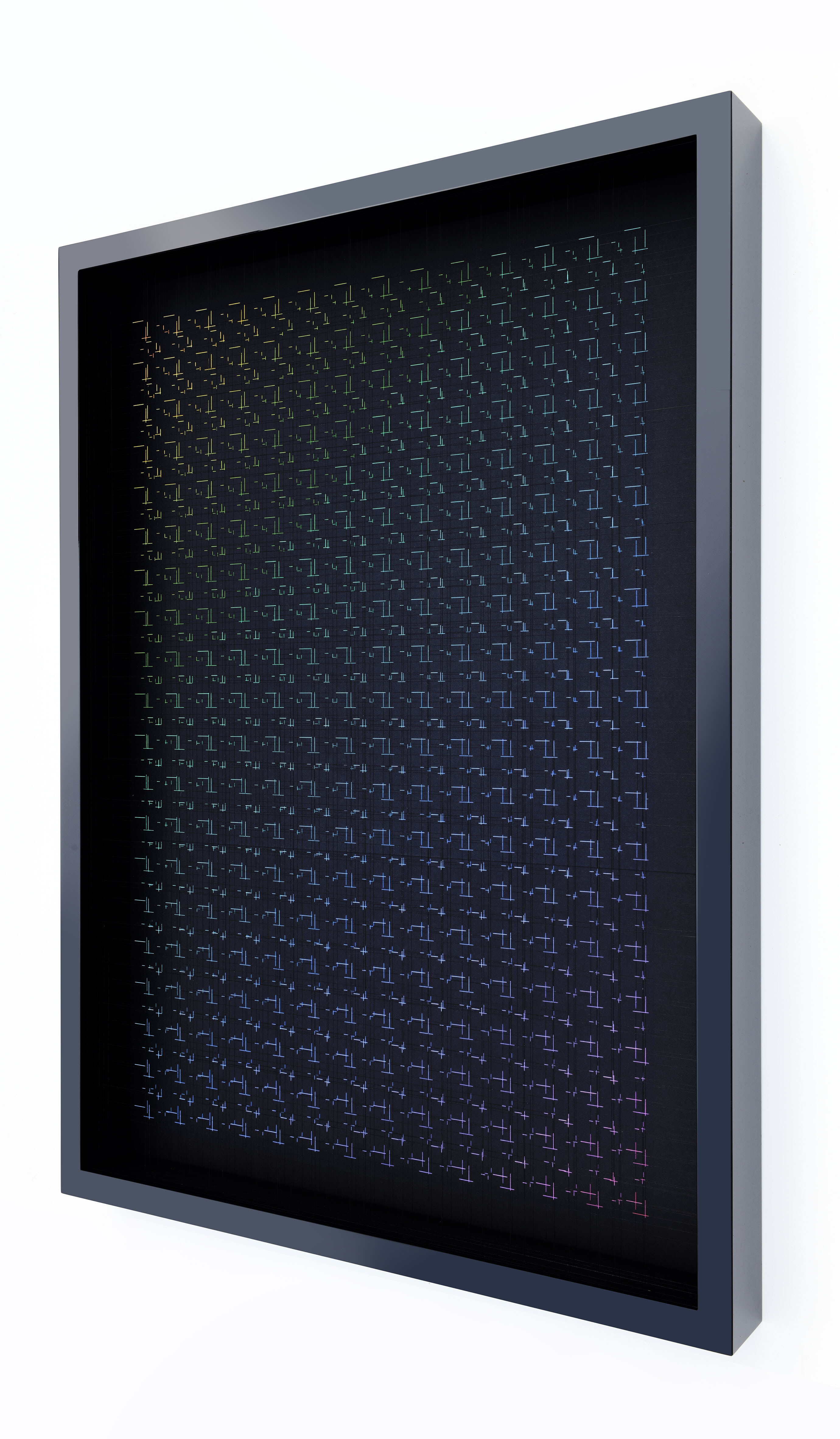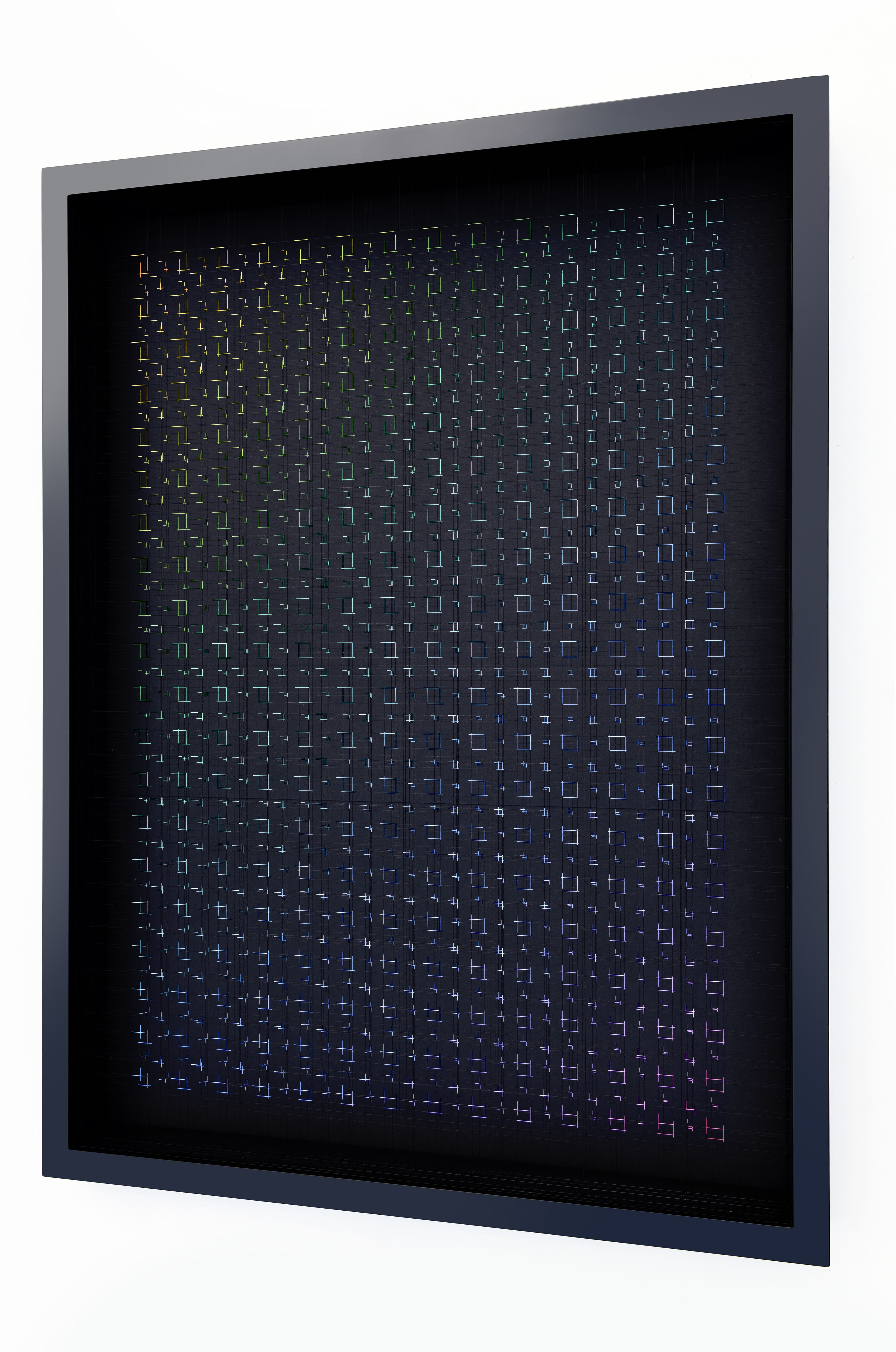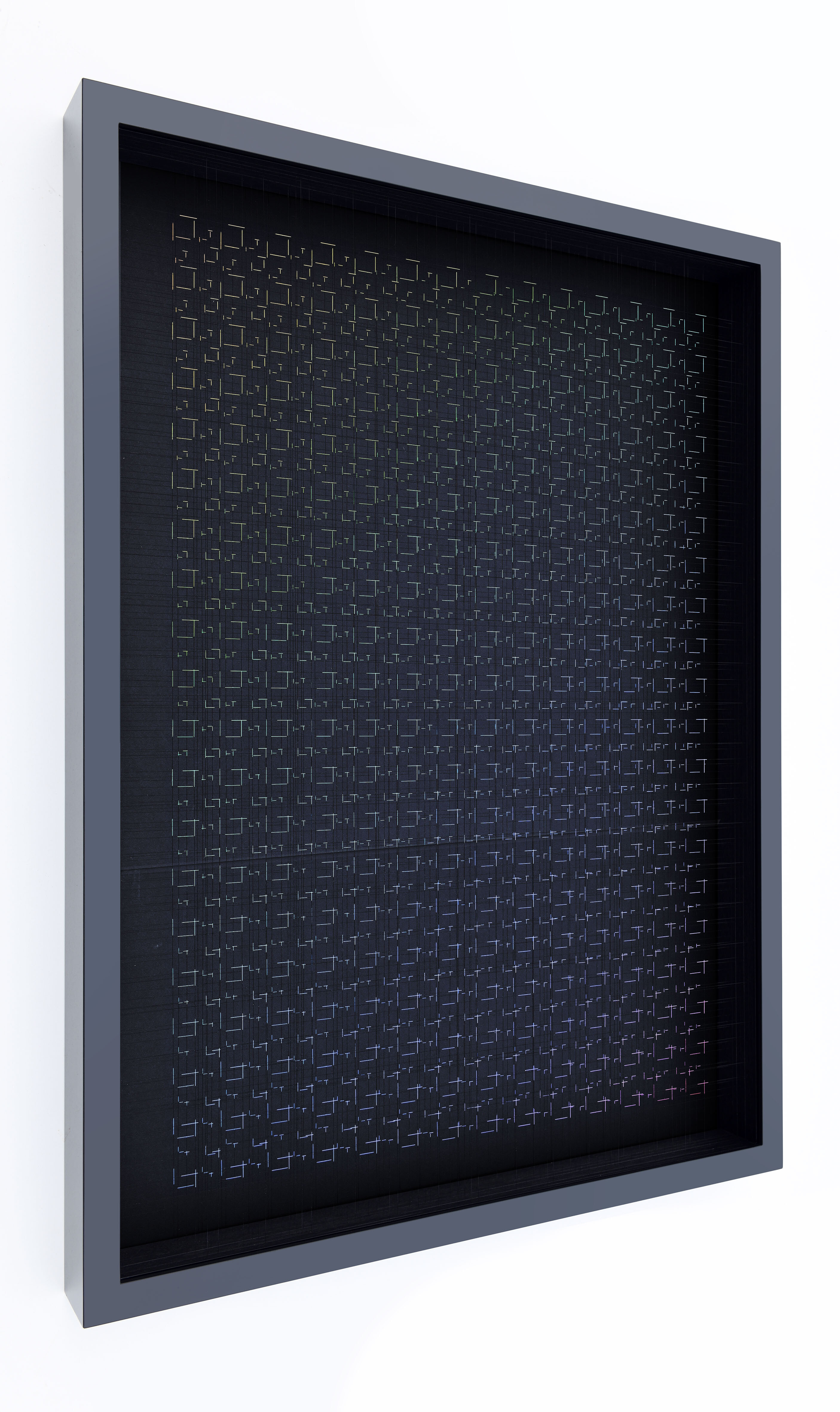 Smalto e acrilico su filo in fluorocarbonio, cornice in legno e laminato nero lucido, telai intern in legno e acciaio laccati, fondo in legno laccato, vetro museale protettivo esterno