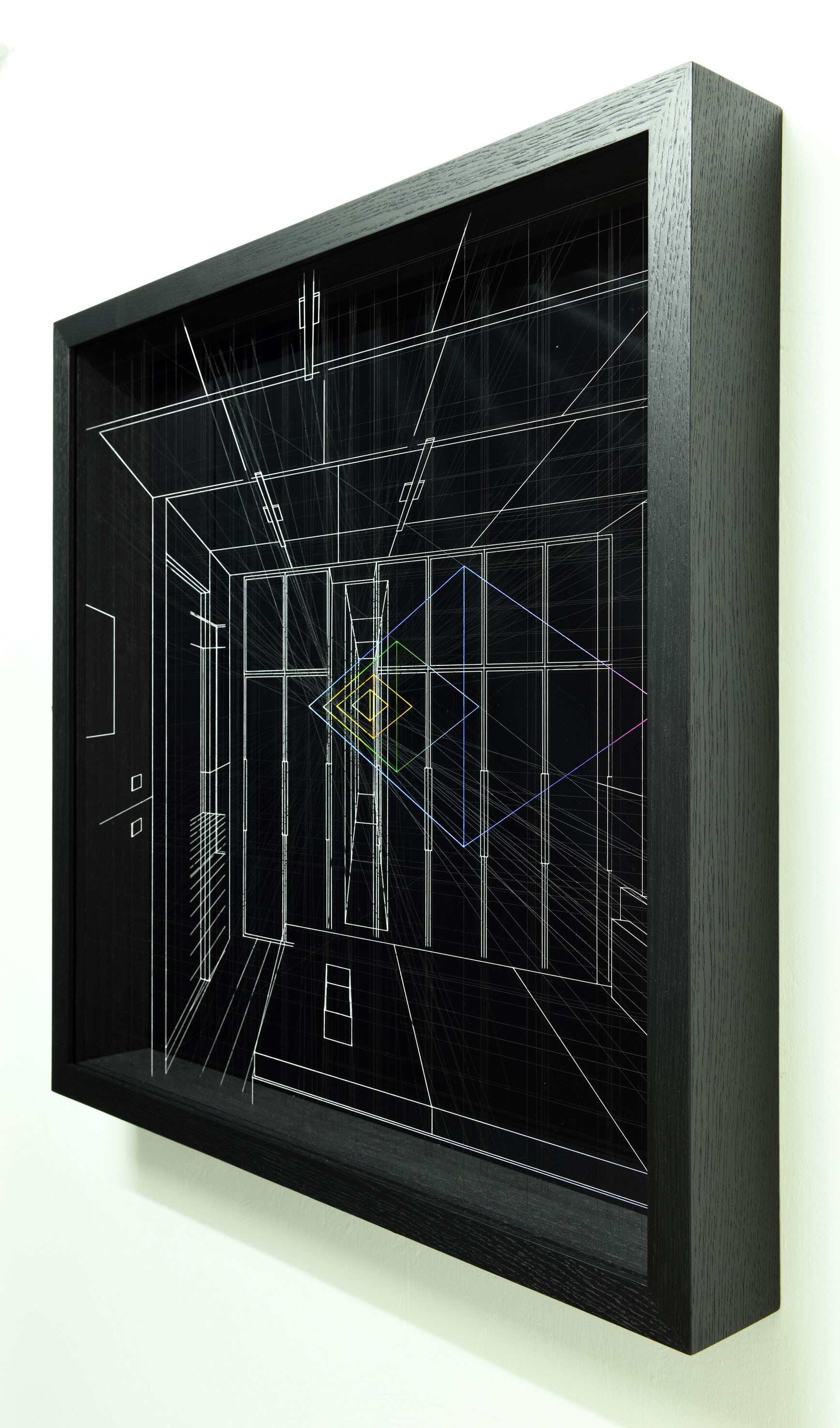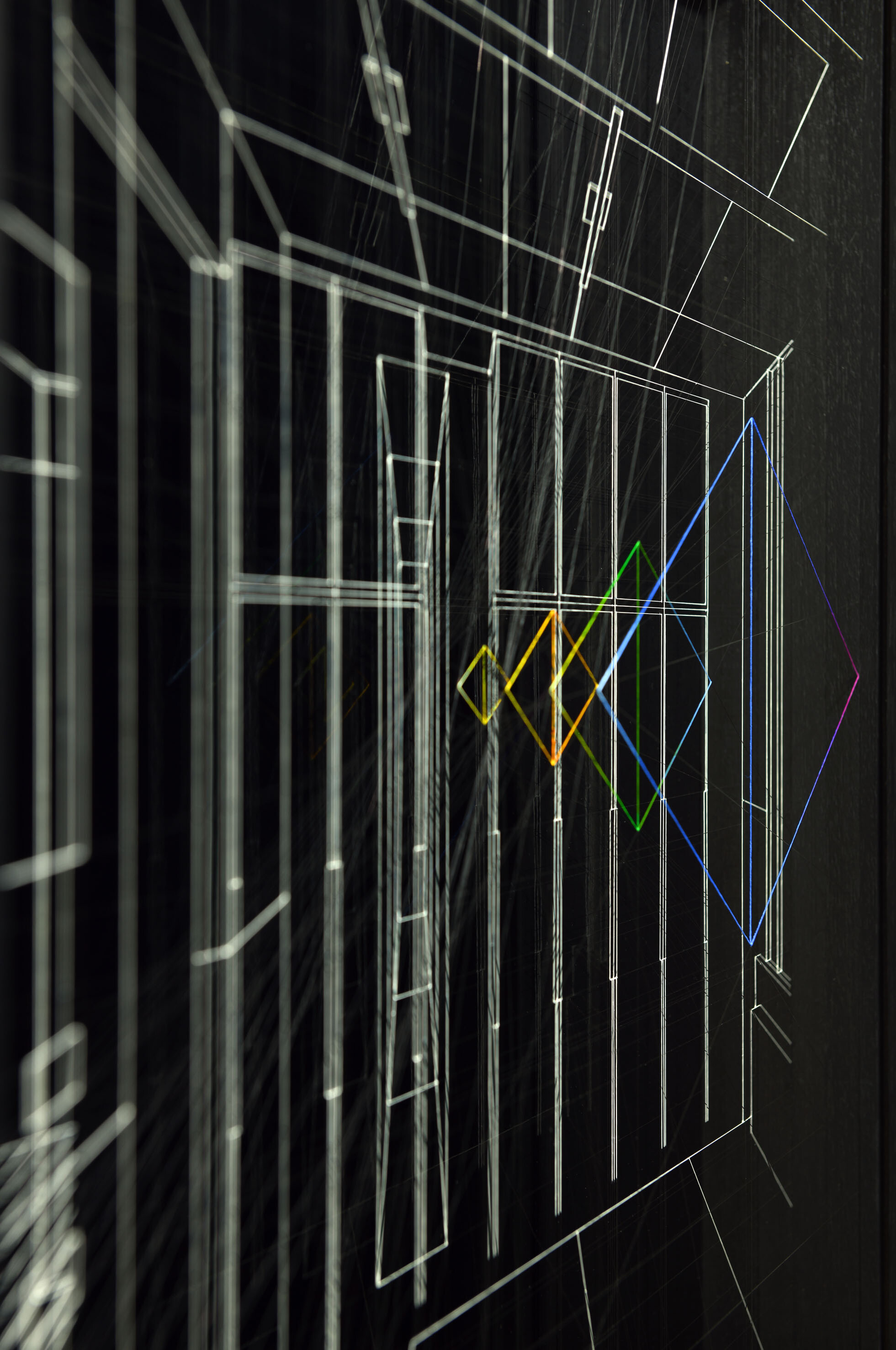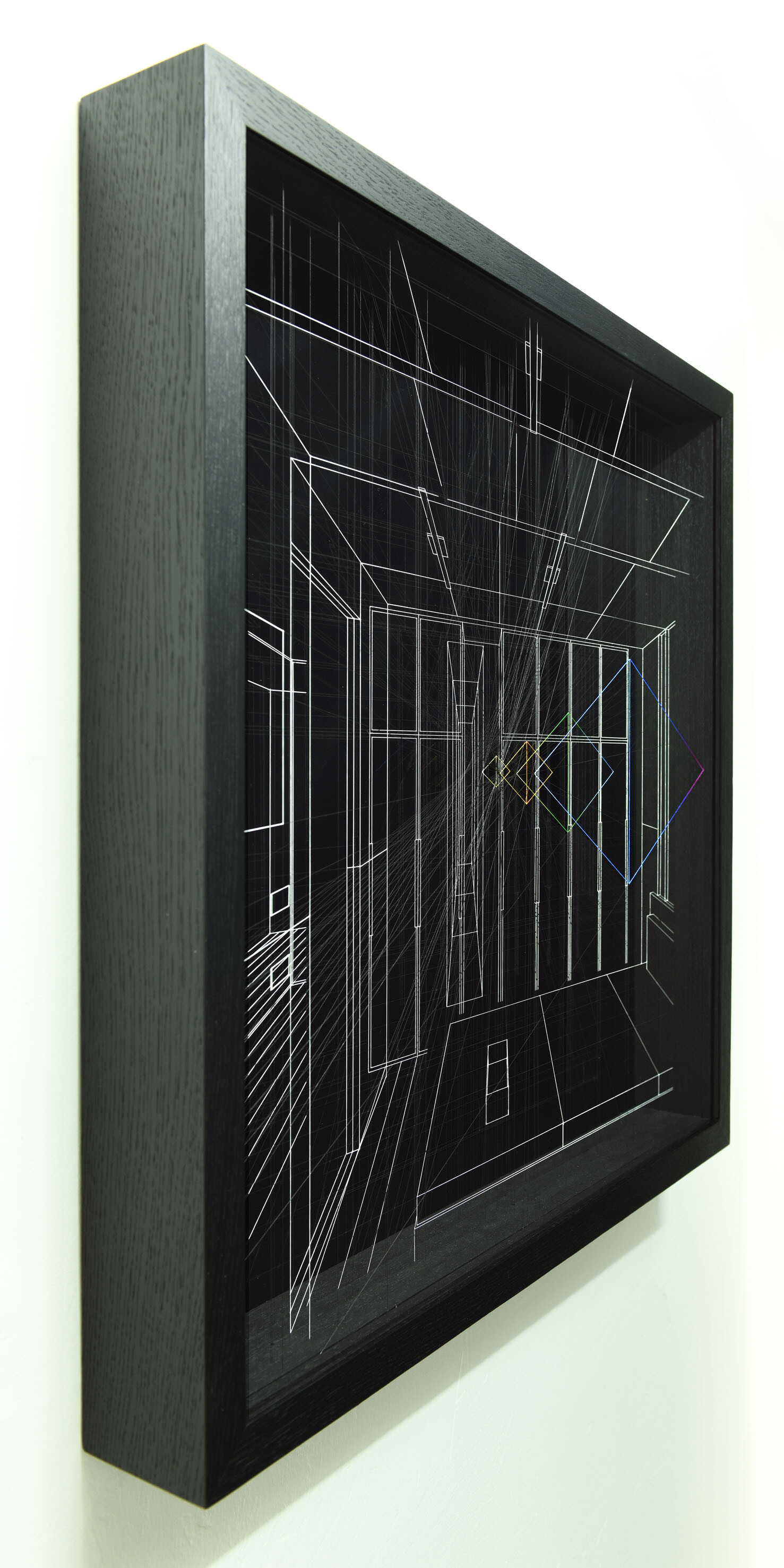 Smalto e acrilico su filo in fluorocarbonio, cornice esterna e telia interni in legno laccato nero, fondo in laminato nero specchiante, vetro museale protettivo esterno