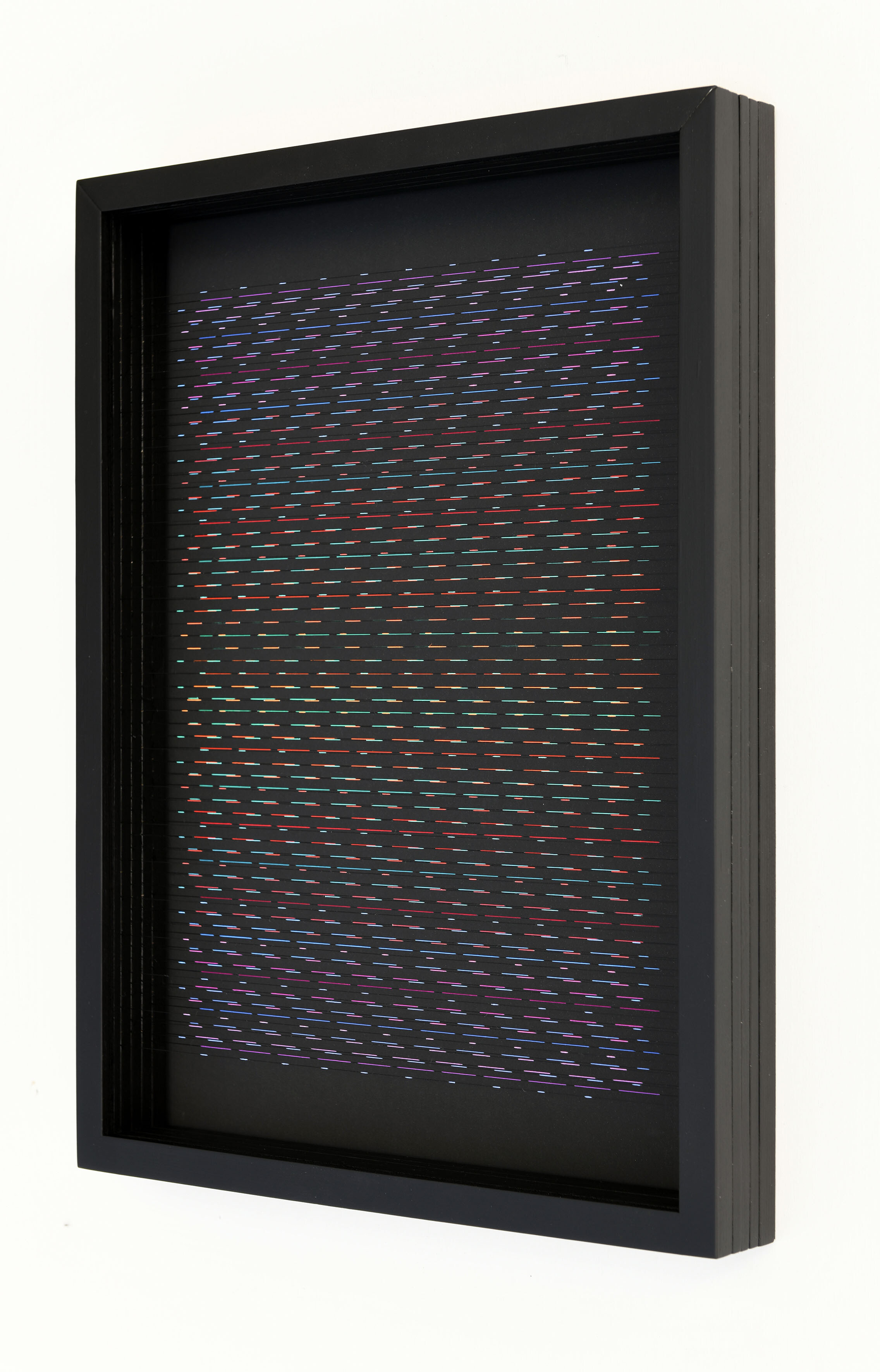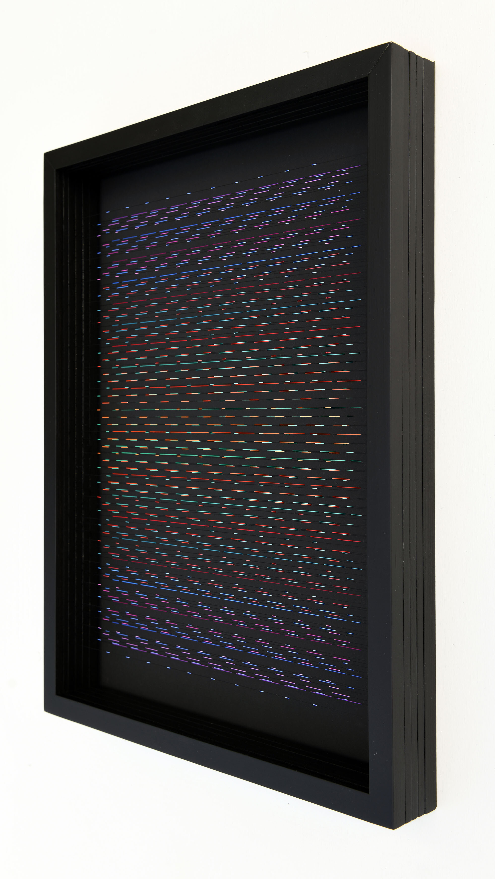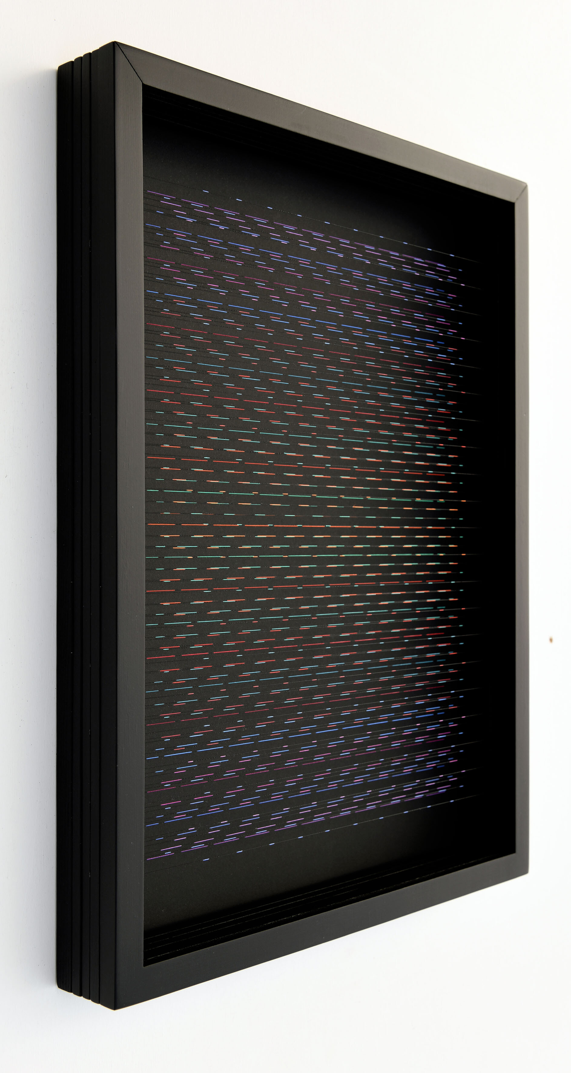 Smalto e acrilico su filo in fluorocarbonio, cornice in legno, fondo in laminato nero lucido, vetro museale protettivo esterno