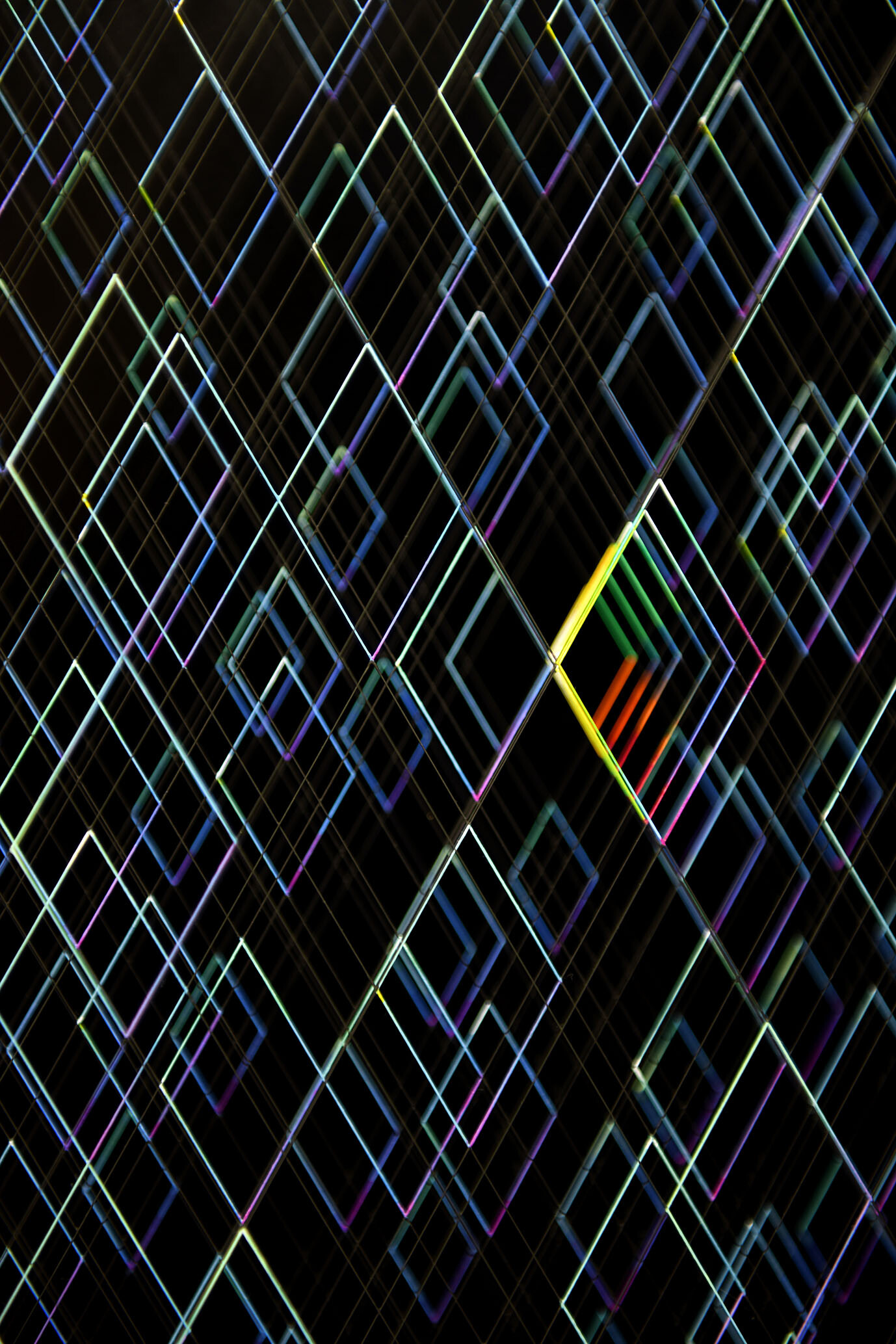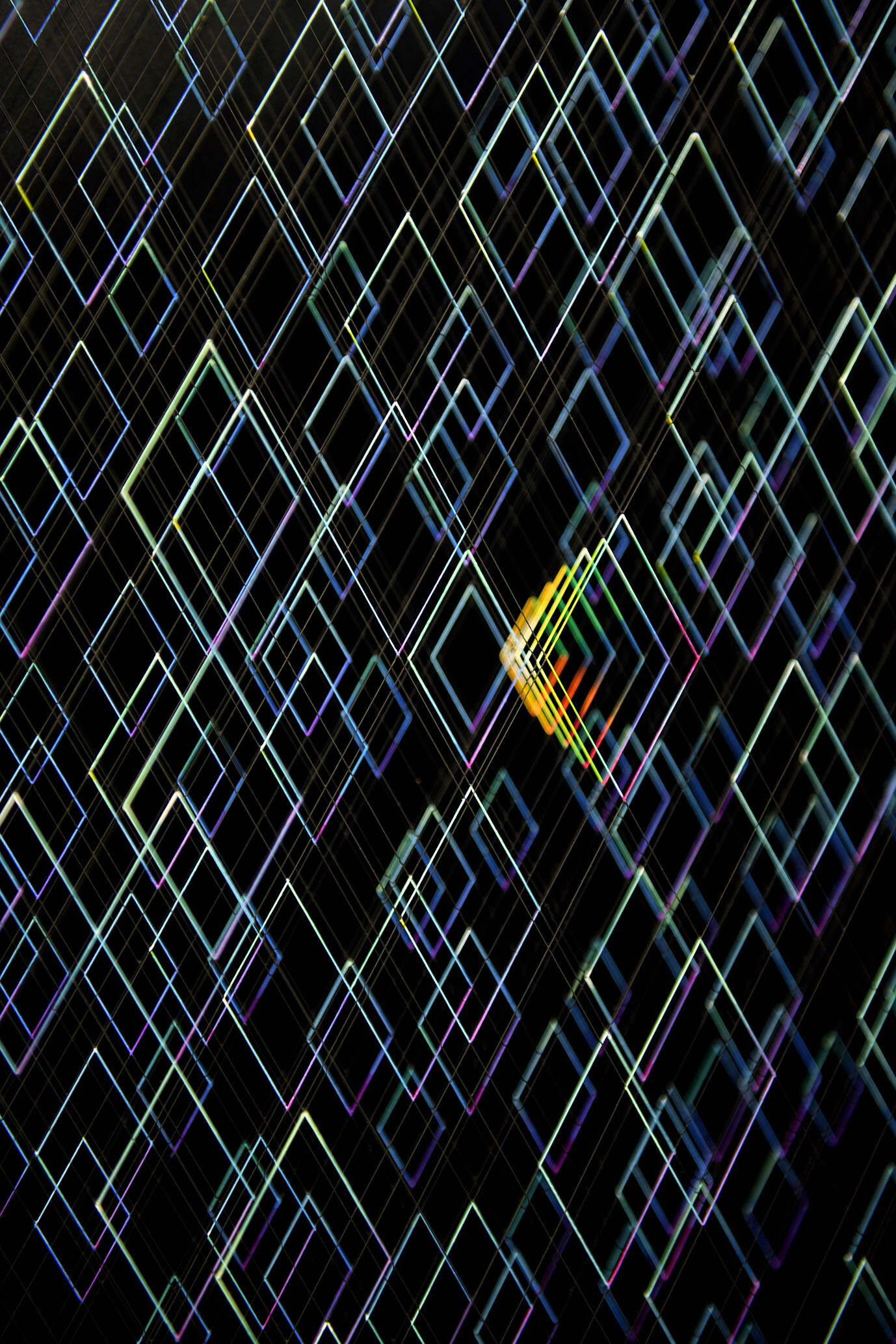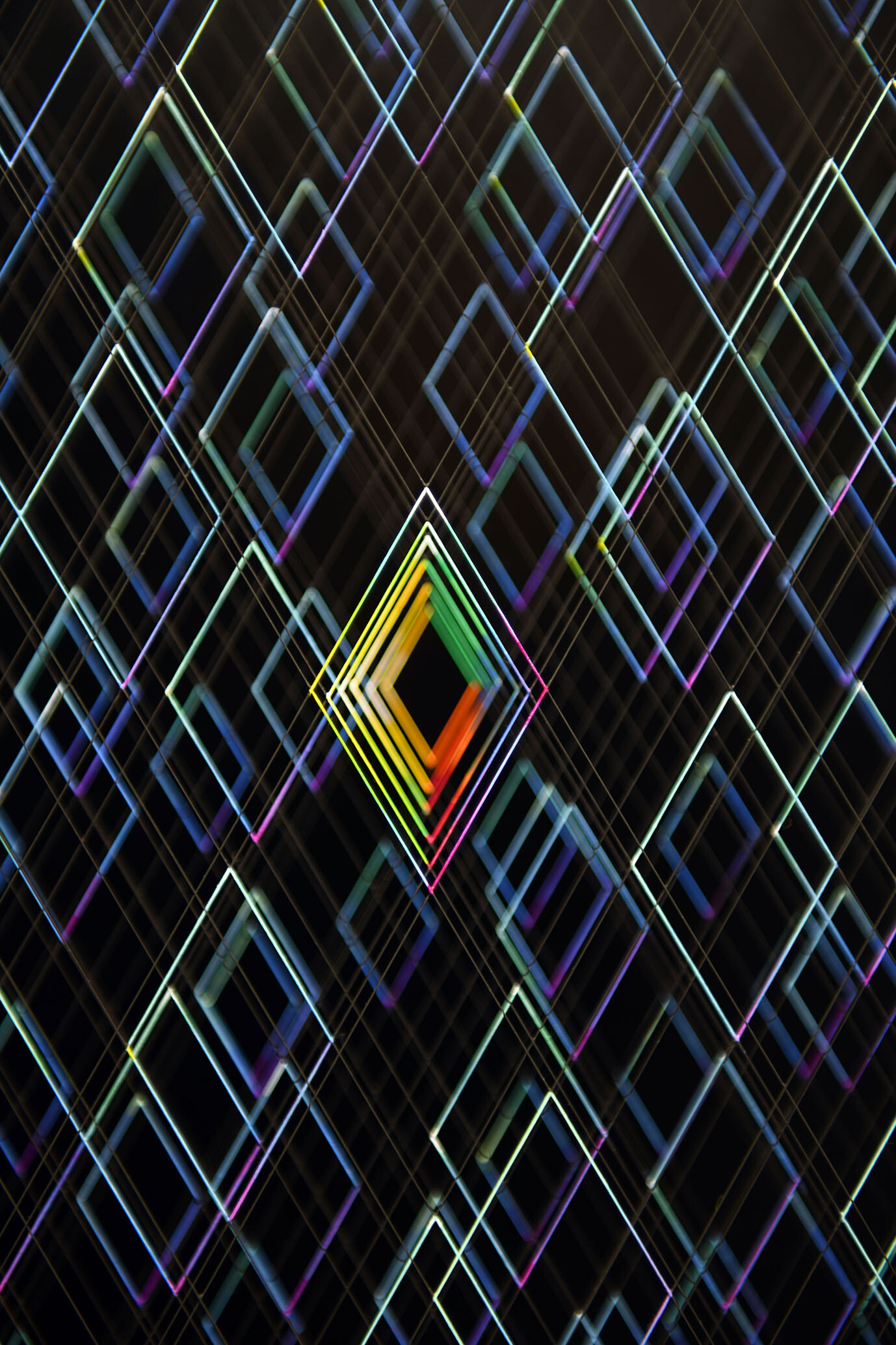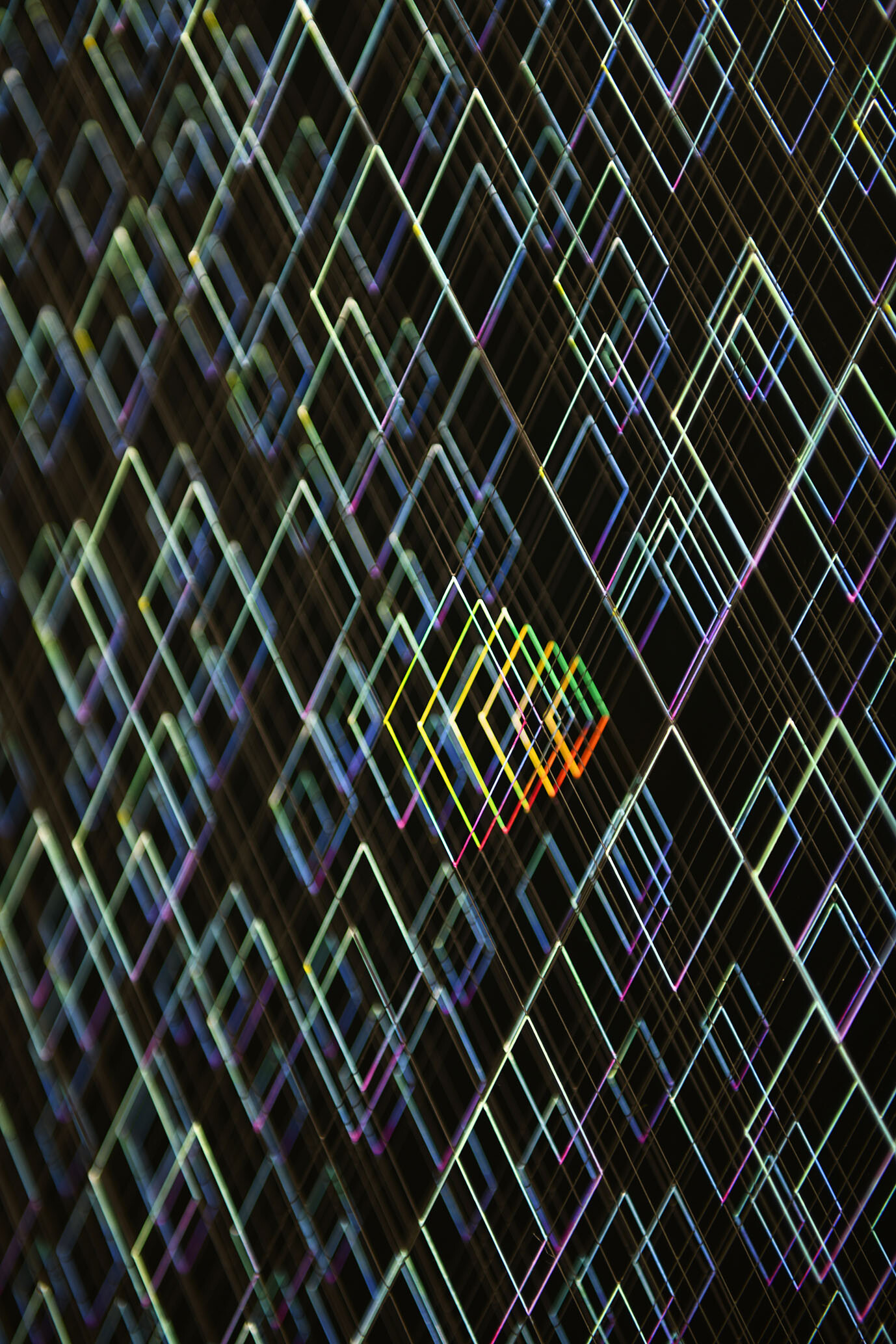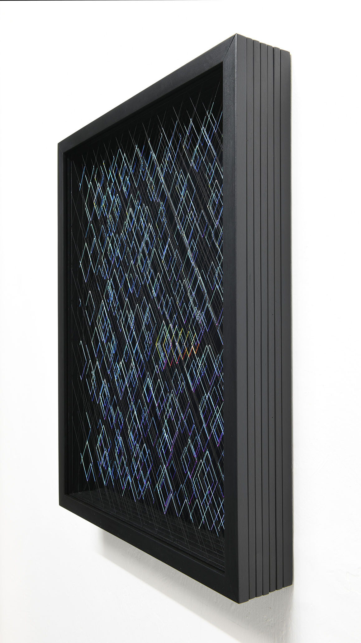 Smalto e acrilico su filo in fluorocarbonio, cornice in legno, fondo in alluminio verniciato, vetro museale protettivo esterno