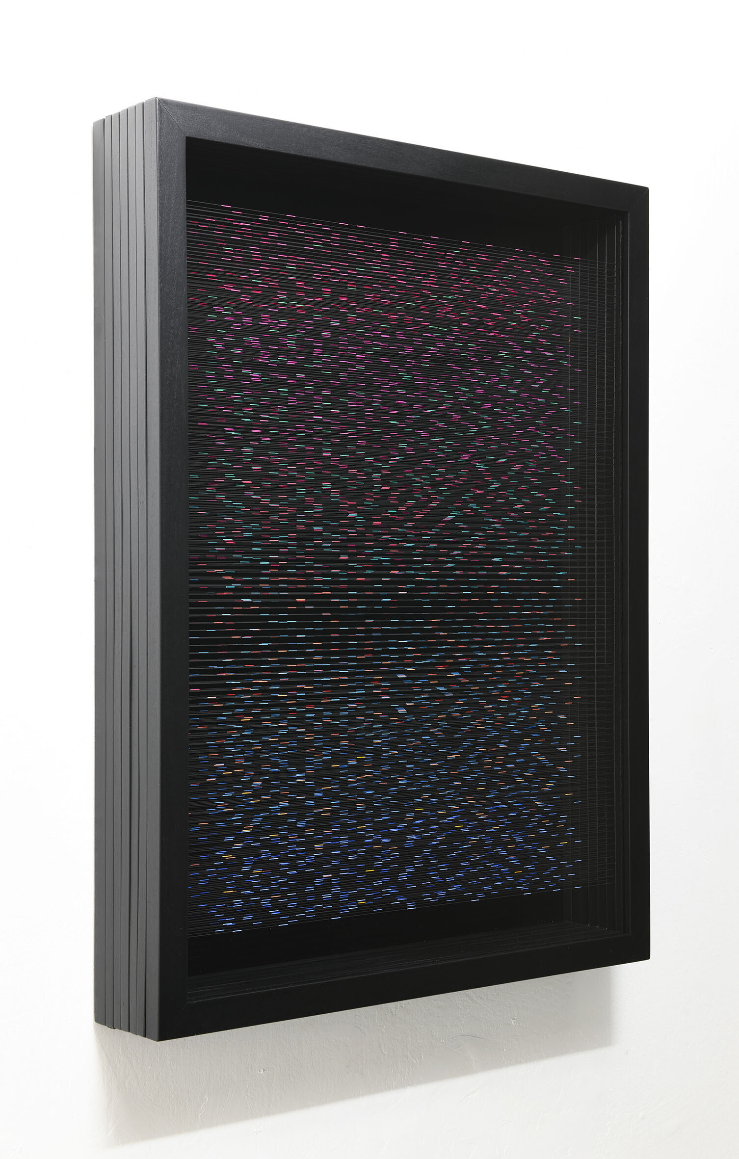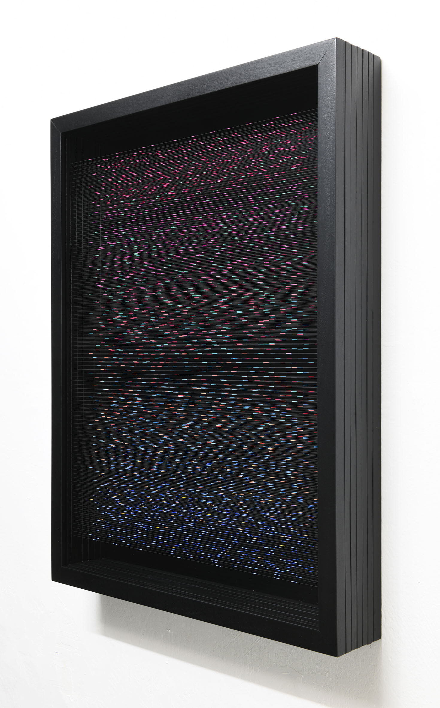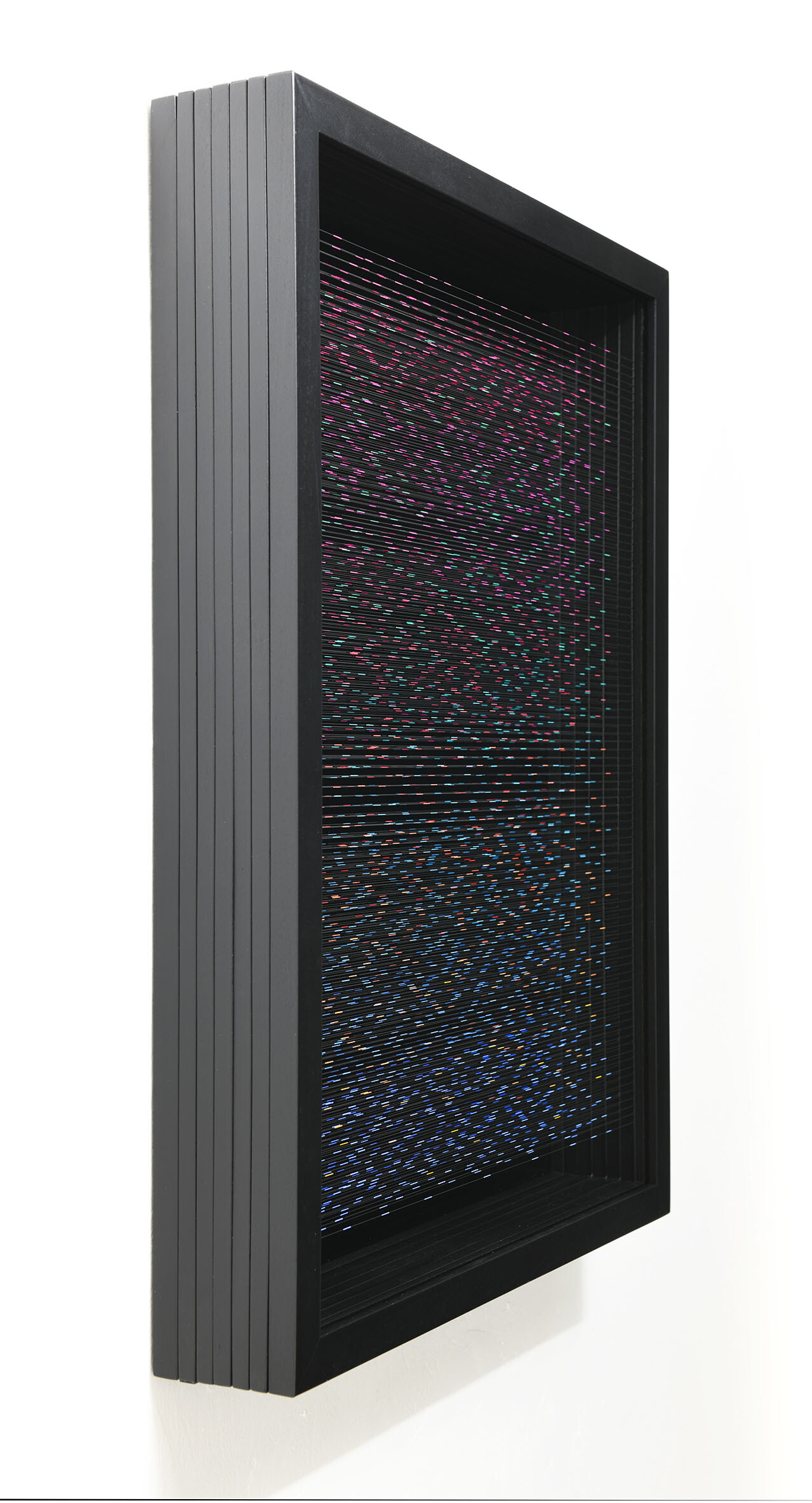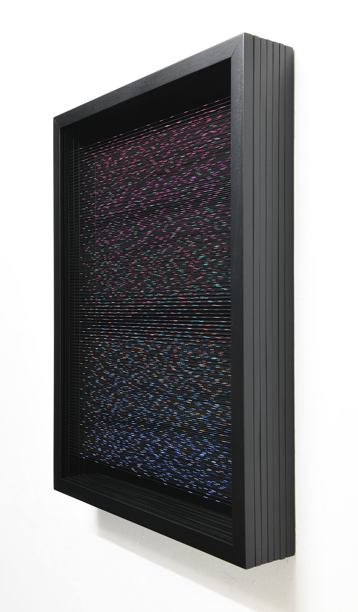 Smalto e acrilico su filo in fluorocarbonio, cornice in legno, fondo in alluminio verniciato, vetro museale protettivo esterno
